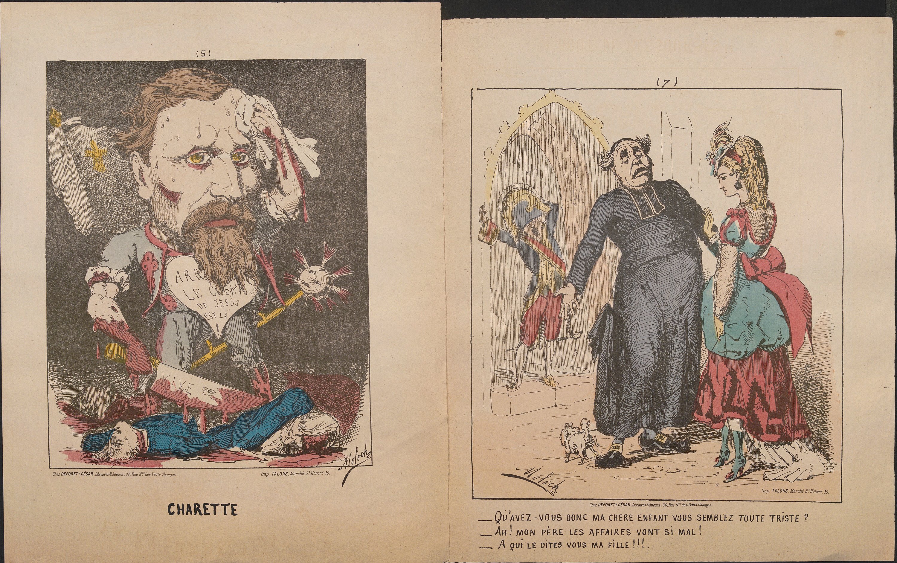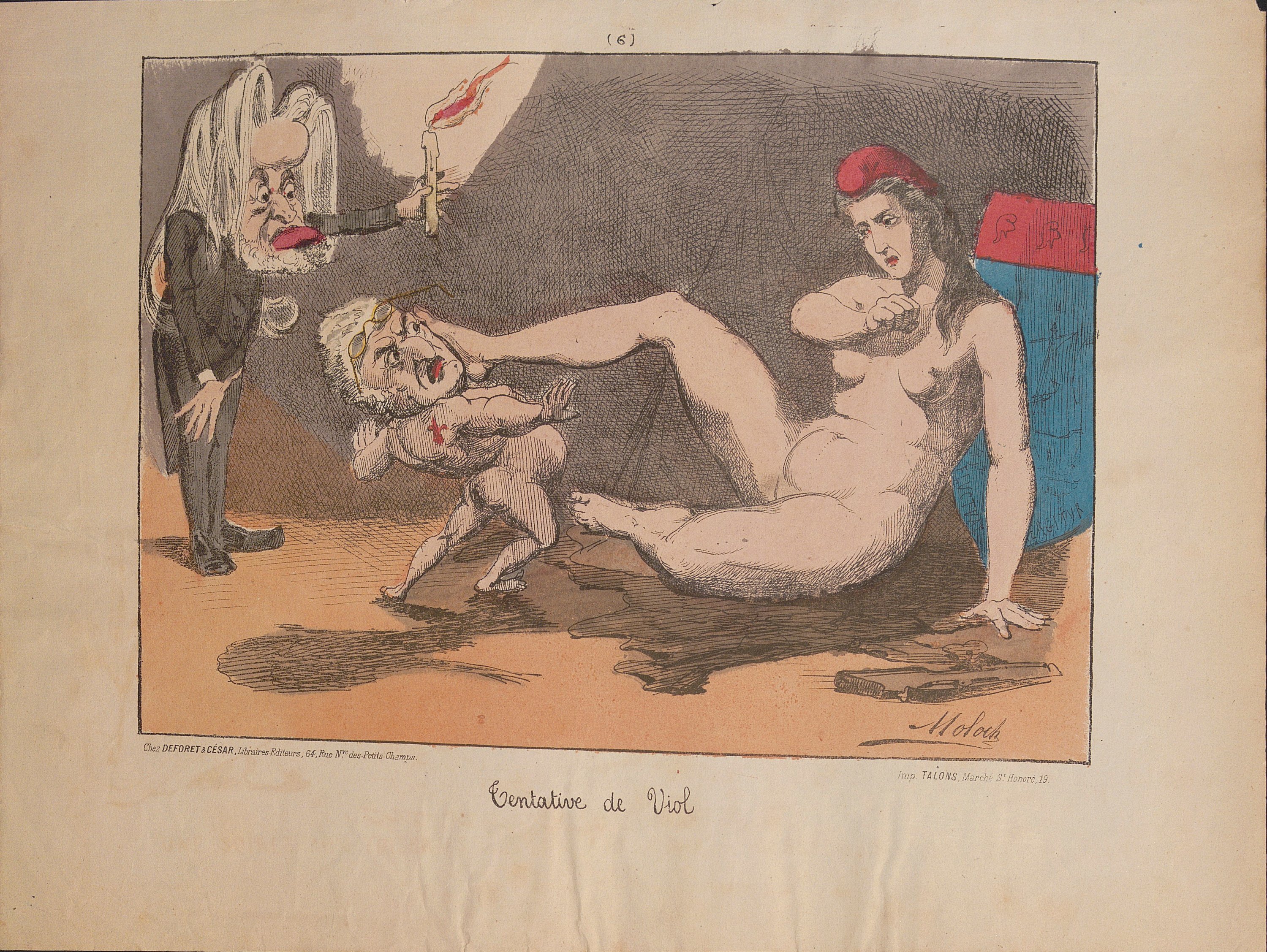 Réunion de 80 lithographies: Série Actualités, 7 pl. (sur 8), env. 34 x 27 cm ; Joli cadeau fait à la Prusse!, en N&B, 33,5 x 25 cm (petits déf.) ; Ses maitresses!, 33,5 x 26,5 cm ; Les binettes du jour n°1, 33,5 x 27 cm ; Hommes politiques, Vox populi, vox démolie!!, 34 x 27 cm ; Hommes d’état, La grande colère du père Jules Bavre, 36 x 27 cm ; série Les Prêtres, n°1 au n°27 (mque 18, 26, 28 et 29), formats et petits déf. divers, certains contrecollés sur feuillet ; série Paris dans les caves, n°1 à 8 et n°11 (sur 39), 34,5 x 26 cm ; série Les Silhouettes de 1871, n°4 à 9, 13-14, 18-20 (sur 26), en majorité 35 x 26,5 cm (petits déf.) ; Badingoscope n°7, en N&B, 33,5 x 28 cm ; série Les Fils de Cerbère, n°8, 10, 12, 14 et 16 (sur 19), 35,5 x 27 cm ; série L.L. Ex. Ex. les Automédons, page de titre, n°2-5, 8-10, 12-19, 24 (sur 24), 34,5 x 27,5 cm (petits déf.).