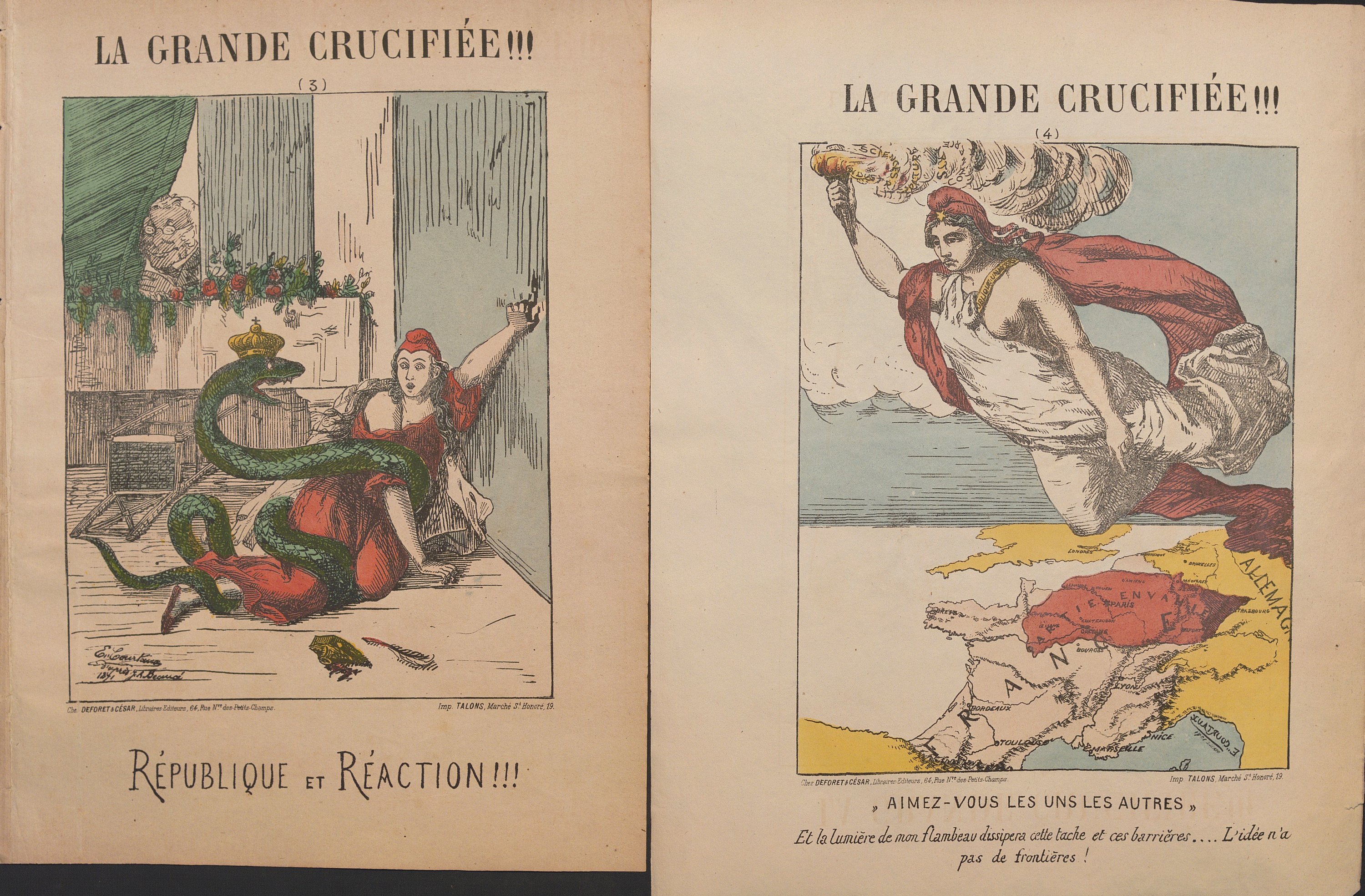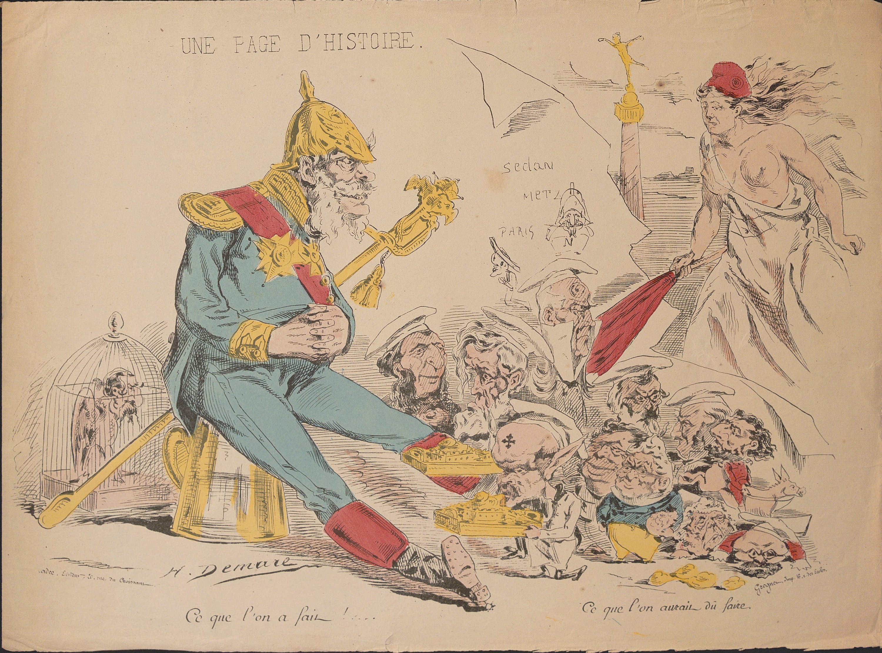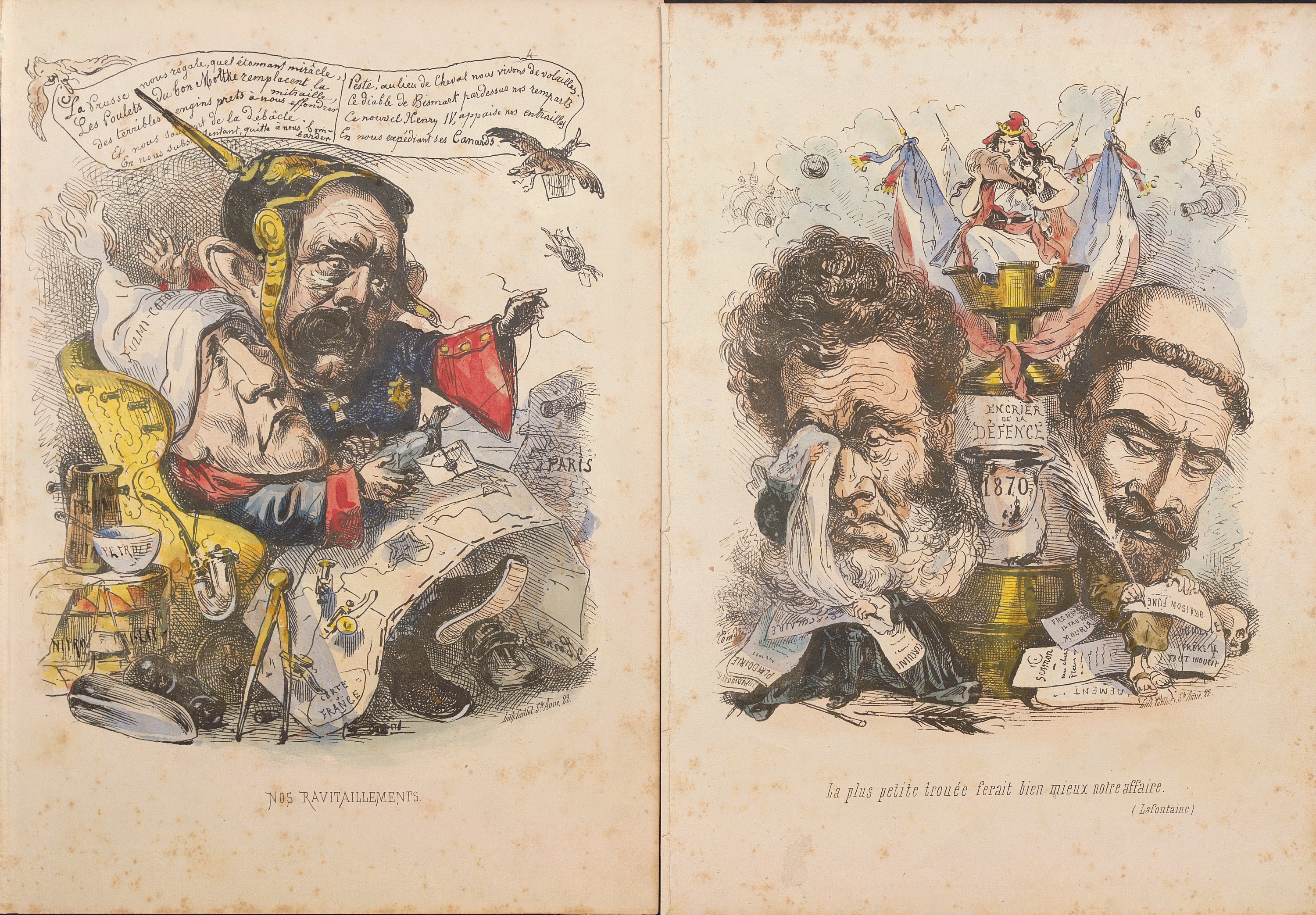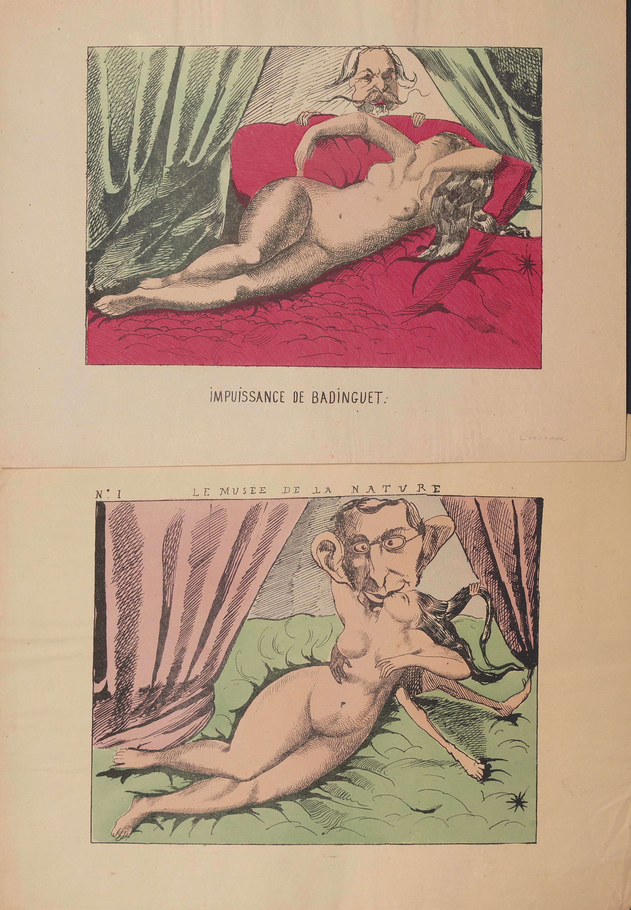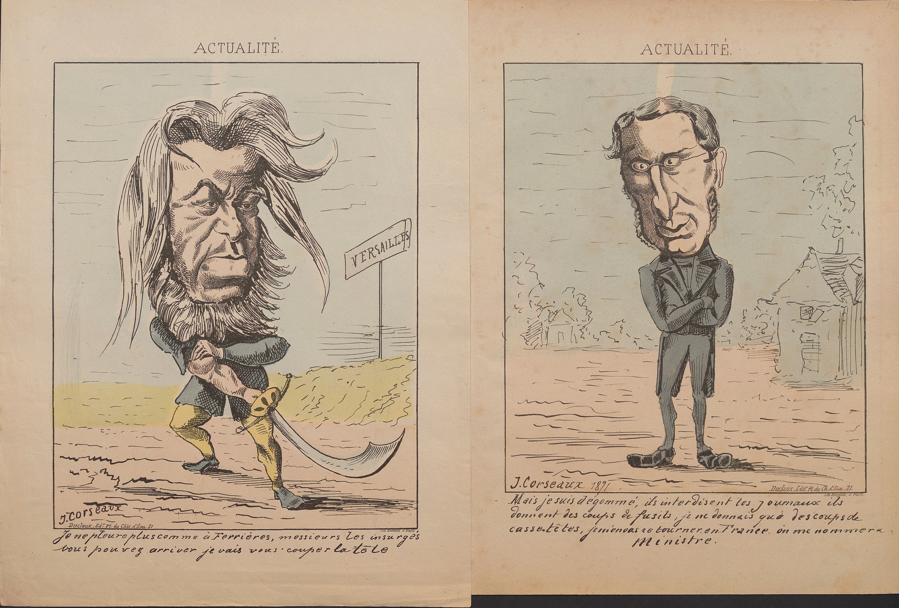 Corseaux dit Louis Balsamo: Grand Baromètre politique, la température actuelle (1871) ; Justice du peuple, la Commune ; La Pyramide ; 6 portraits-charges Actualité ; Cour d’assises de la Seine ; Critique, je faisais des plans comme Trochu ; Critique, Dans une tour obscure ; Badinguet et sa clique ; Note de Guillaume ; Souvenir du Siège, officiers wurtembergeois ; République Française, Peuples notre exemple sera suivi!!! ; Le musée de la Nature ; Impuissance de Badinguet ; Ne craignez rien mon enfant, je vous donnerai l’absolution [l’impératrice Eugénie et l’abbé Bauer] ; La pêche ; Qu’elle est jolie ; Le bain ; Divertissement de ces messieurs ; Un duel Vermorel/Pyat, contrecollé sur feuillet ; 5 ex. de la série Croquis du jour ; série Nudités, 8 lith. sur 9 parues (mque Les occupations d’un saint homme) ; 5 lith. série complète Croquis du jour, n°1 à 5 ;