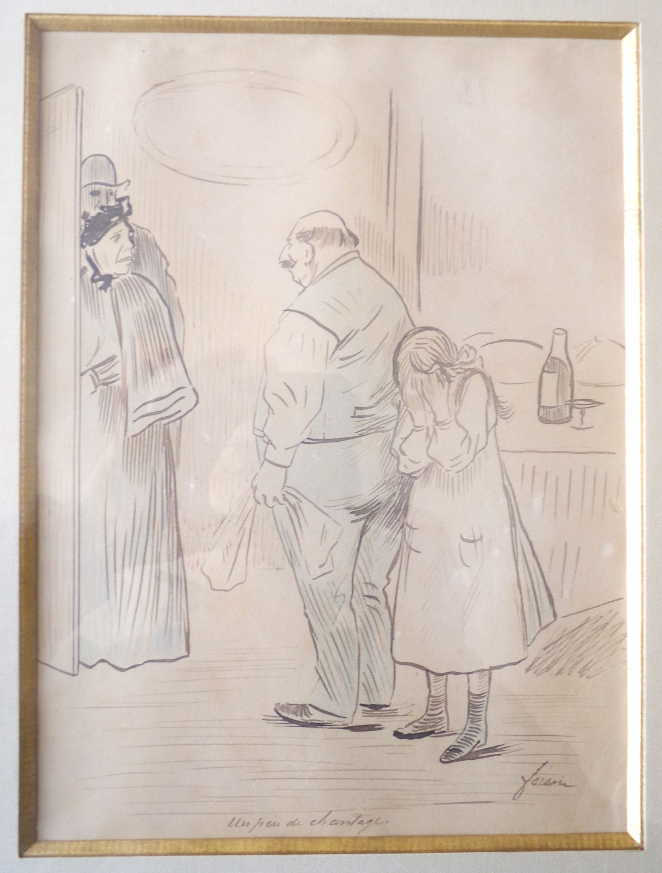 « Un peu de chantage », encre brune à rehauts de crayon bleu, titré, signé en bas à droite, paru dans Le Courrier français du 29 mars 1901, dans la série « Les satisfaits », 29 x 21 cm à vue, sous cadre 52 x 44,5 cm.