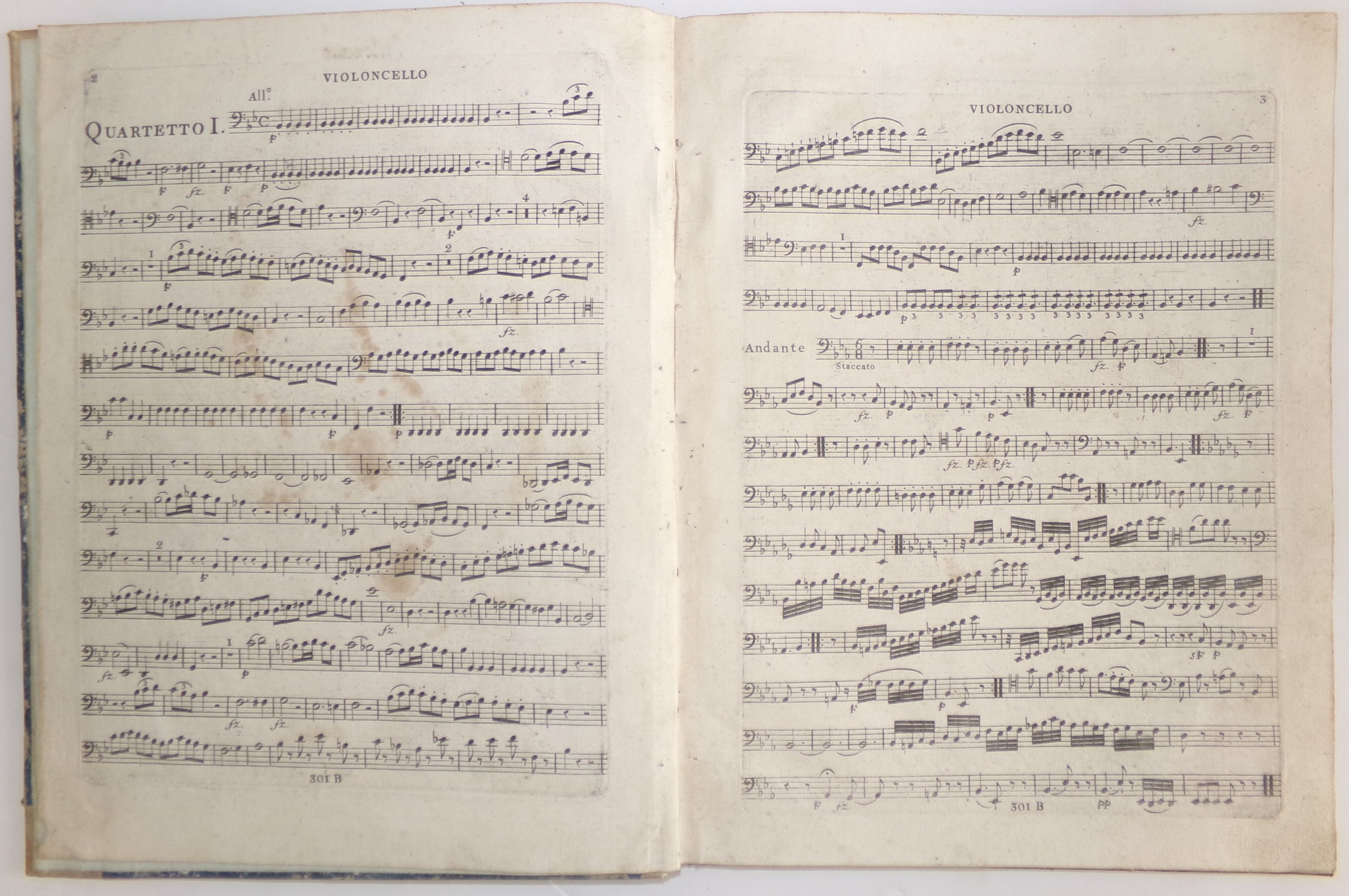 (1 vol.) Douze nouveaux quatuors dédiés à Sa Majesté le Roi de Prusse composés par Ignace Pleyel, [pour basso]. Paris, chez Le Duc éditeur de musique. 10 pp. ; suivi de Six quatuors concertants pour deux violons Alto et Basso composés et dédiés à Sa Majesté le Roy de Naples par Ferd. Fraenzl le fils élève de M. Pleyel / Oeuvre 1, 1 partie (Violoncello]. Paris, chez Sieber musicien. 8 pp. ;