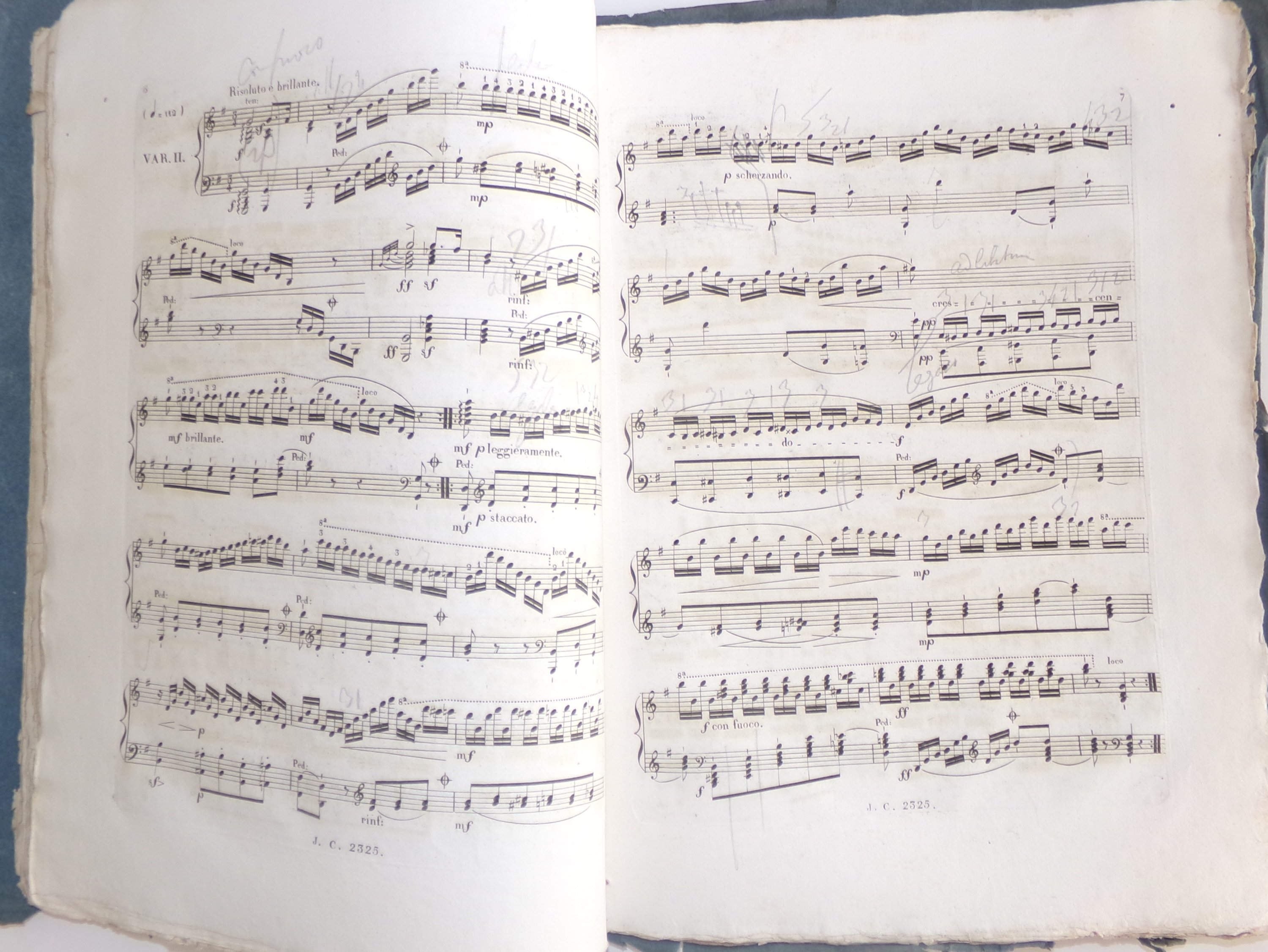 (1 vol.) Variations brillantes pour le piano forte sur la cavatine favorite / Aurora sorgerai nella Donna del Lago del Maestro Rossini, dédiées à Madame la Comtesse de la Roche-Aymon et composée par Henri Herz. Œuvre 17. Paris, magasin de musique Pacini. 18 pp., avec annotations manuscrites au crayon (déchirures, mque en marge) ; Suivi de Grande fantaisie pour le piano forte sur des motifs du Comte Ory de Rossini, dédiée à Madame la Baronne Anselm de Rothschild et composée par Henri Herz, pianiste de S.M. le Roi de France. Opéra 47. Paris, chez E. Troupenas. 17 pp. avec annotations manuscrites au crayon. Suivi de Variations brillantes pour le piano forte sur la cavatine favorite des deux nuits Le beau pays de France, musique de Boieldieu, dédiées à Mademoiselle de E. de Beauvillier et composées par Jacques Herz. Œuvre 20. Paris, chez Janet et Cotelle. 19 pp. avec annotations manuscrites au crayon. Suivi de Grande fantaisie pour le piano forte sur la Tyrolienne de la Fiancée composée par F. Liszt. Opéra I. Paris, chez E. Troupenas. 25 pp. ;