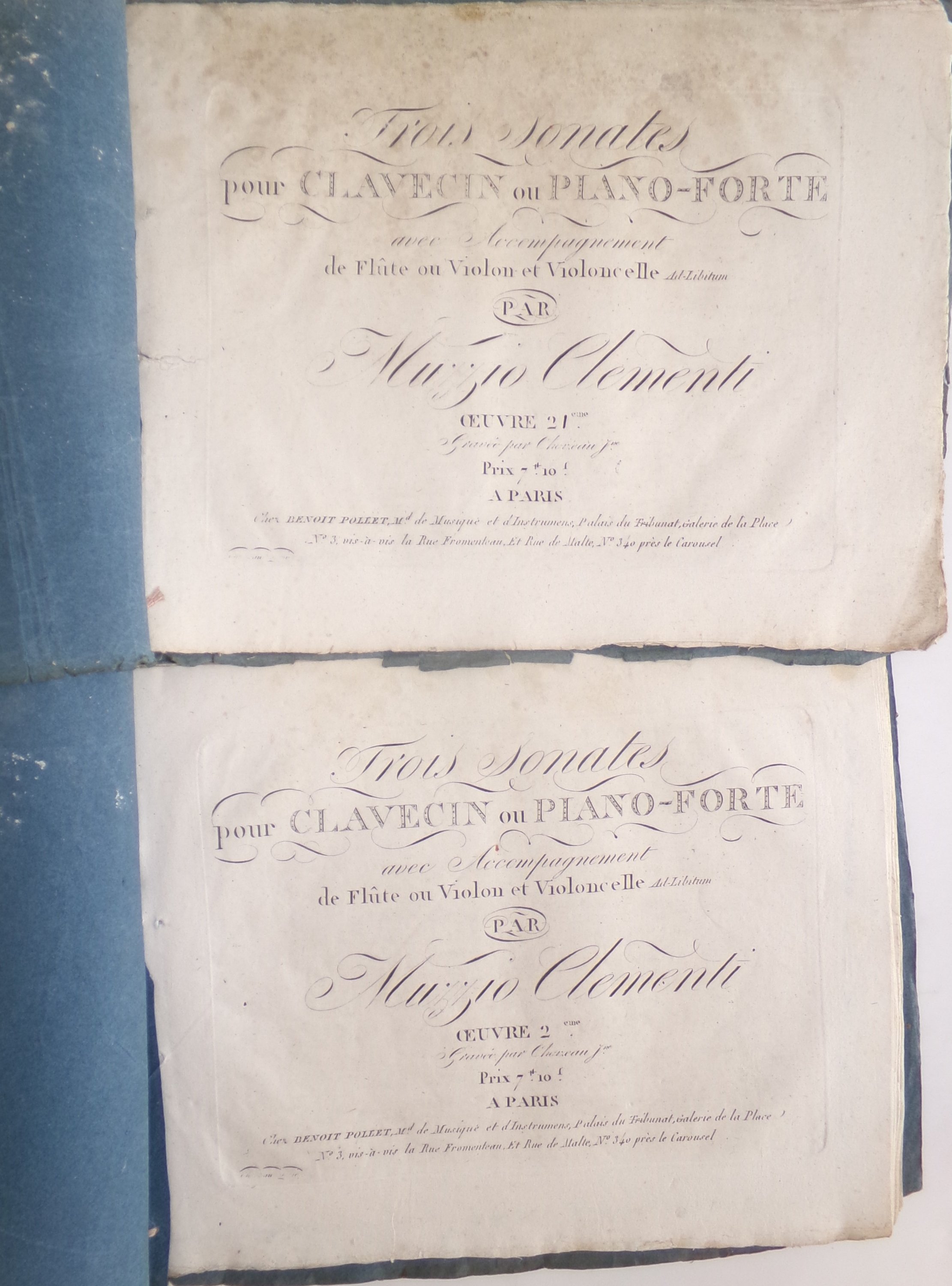 (1 vol.) Trois sonates pour clavecin ou piano-forte avec accompagnement de flûte ou violon et violoncelle Ad-Libitum par Muzzio Clementi. Œuvre 21e. Paris, chez Benoit Pollet. 21 pp. ; Suivi de Trois sonates pour clavecin ou piano-forte avec accompagnement de flûte ou violon et violoncelle Ad-Libitum par Muzzio Clementi. Œuvre 22e. Paris, chez Benoit Pollet. 18 pp. ;