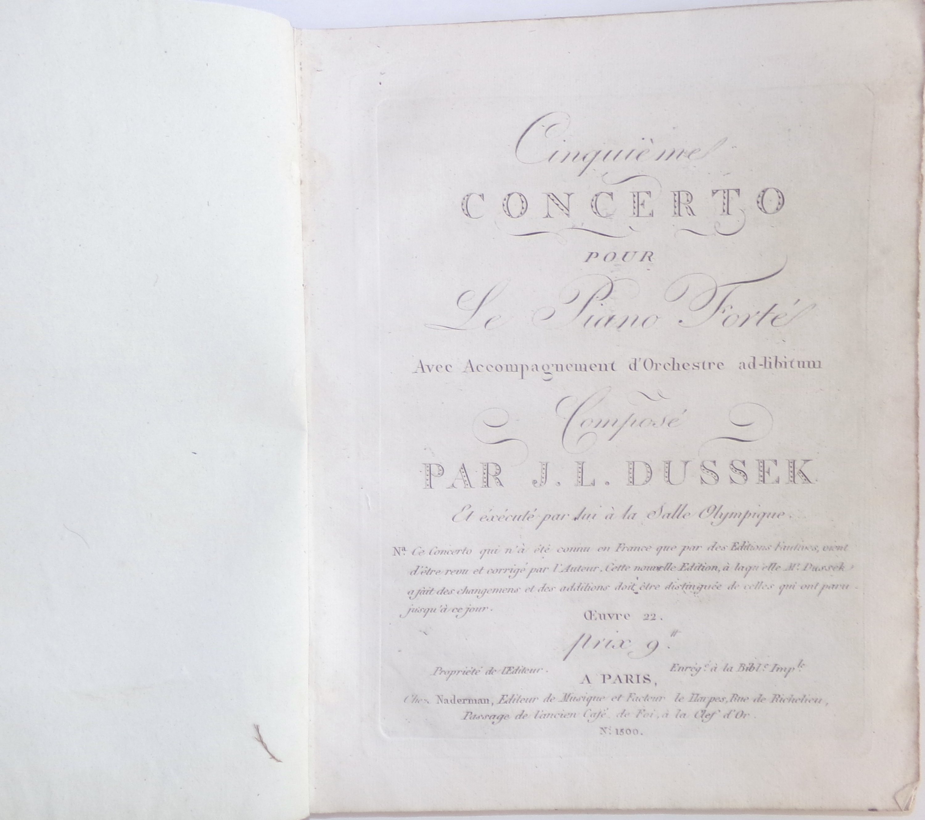 (1 vol.) Cinquième concerto pour le piano forté avec accompagnement d’orchestre ad-libitum composé par J.L. Dussek et exécuté par lui à la Salle Olympique. Oeuvre 22, 27 et 29. Paris, chez Naderman ;