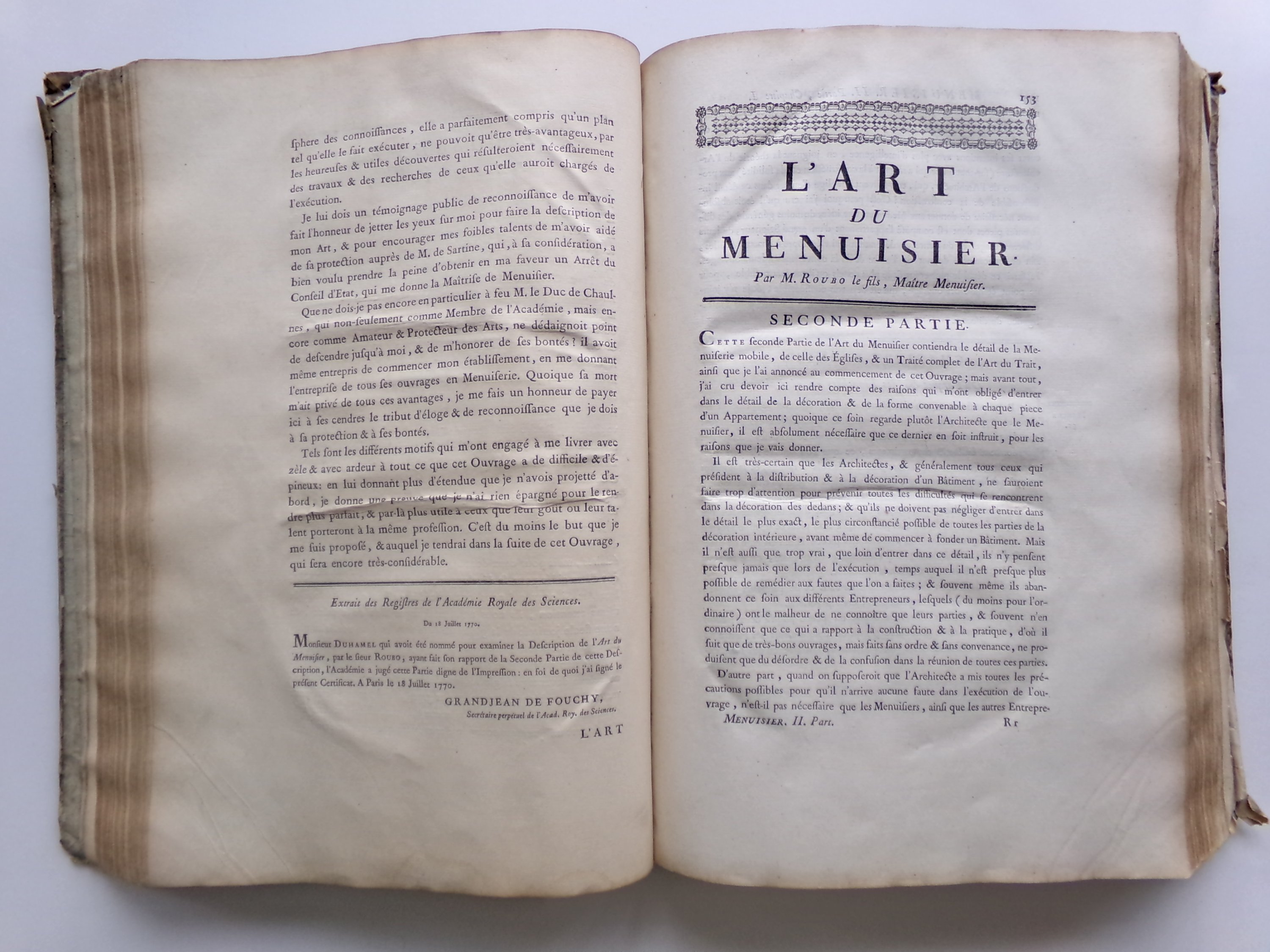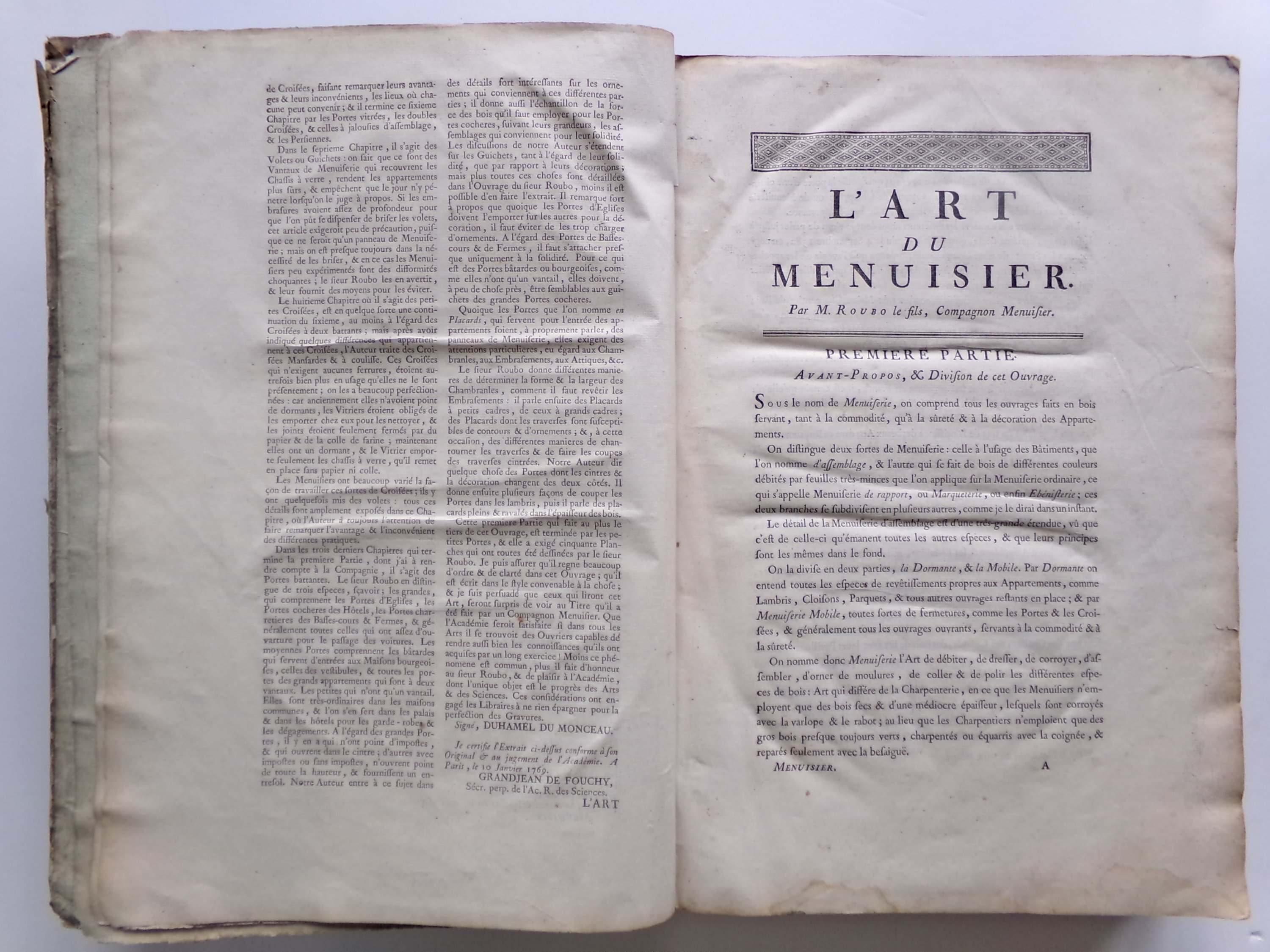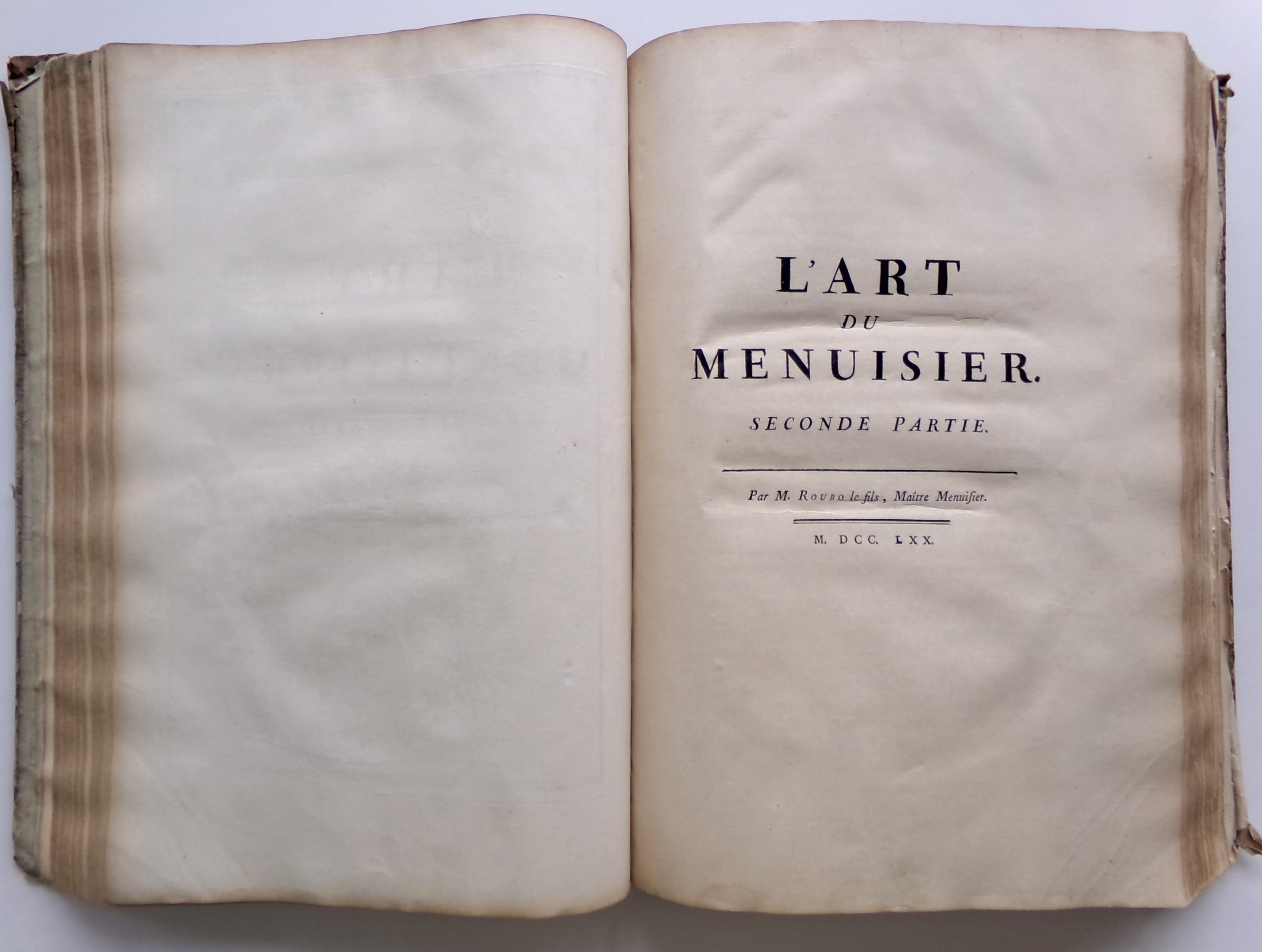 Edition originale du plus important ouvrage sur la menuiserie au XVIIIe siècle, décrivant nombre de spécialités autour de la menuiserie en général (décoration des boiseries d'appartements, portes, lambris, meubles...).