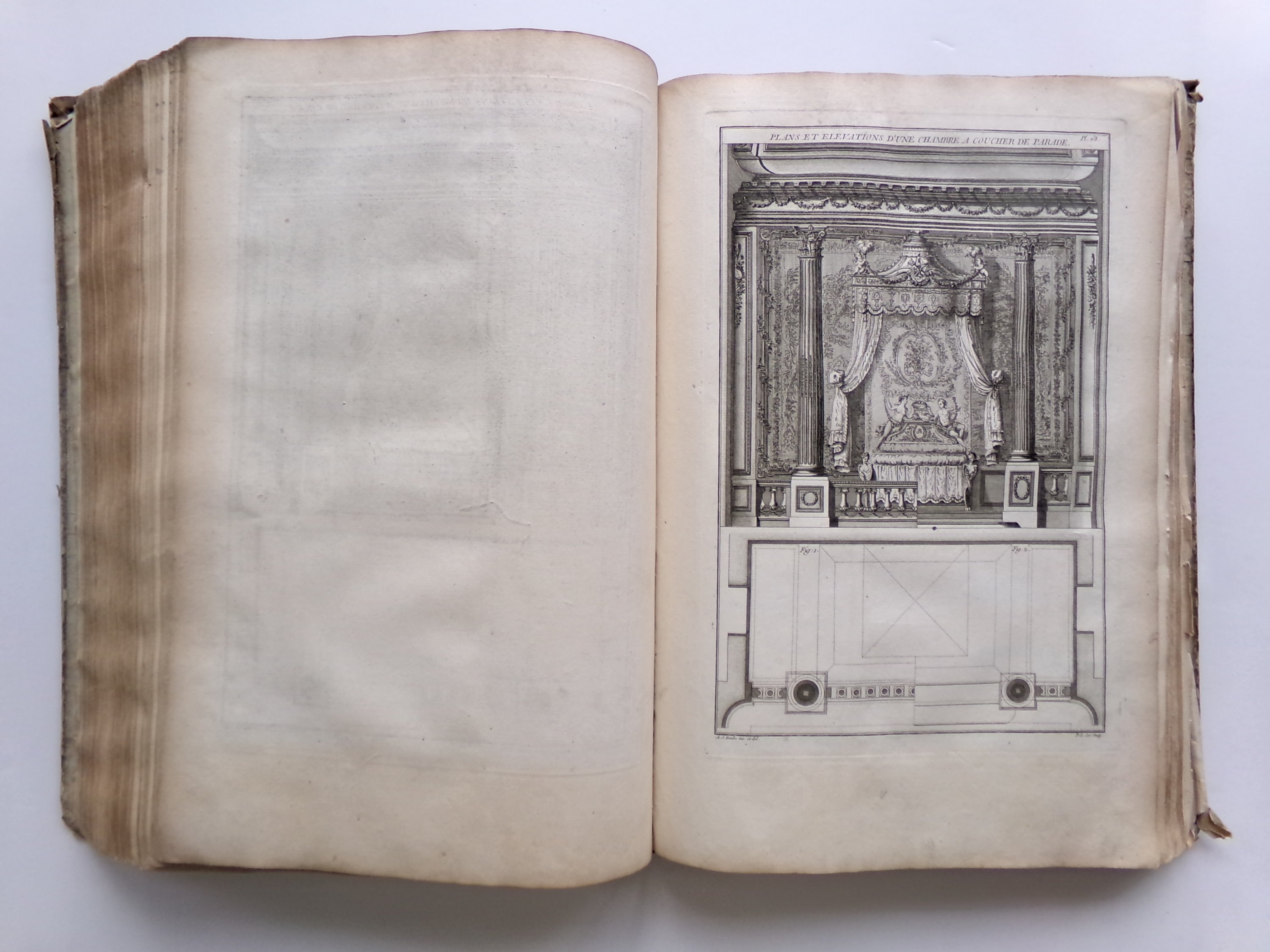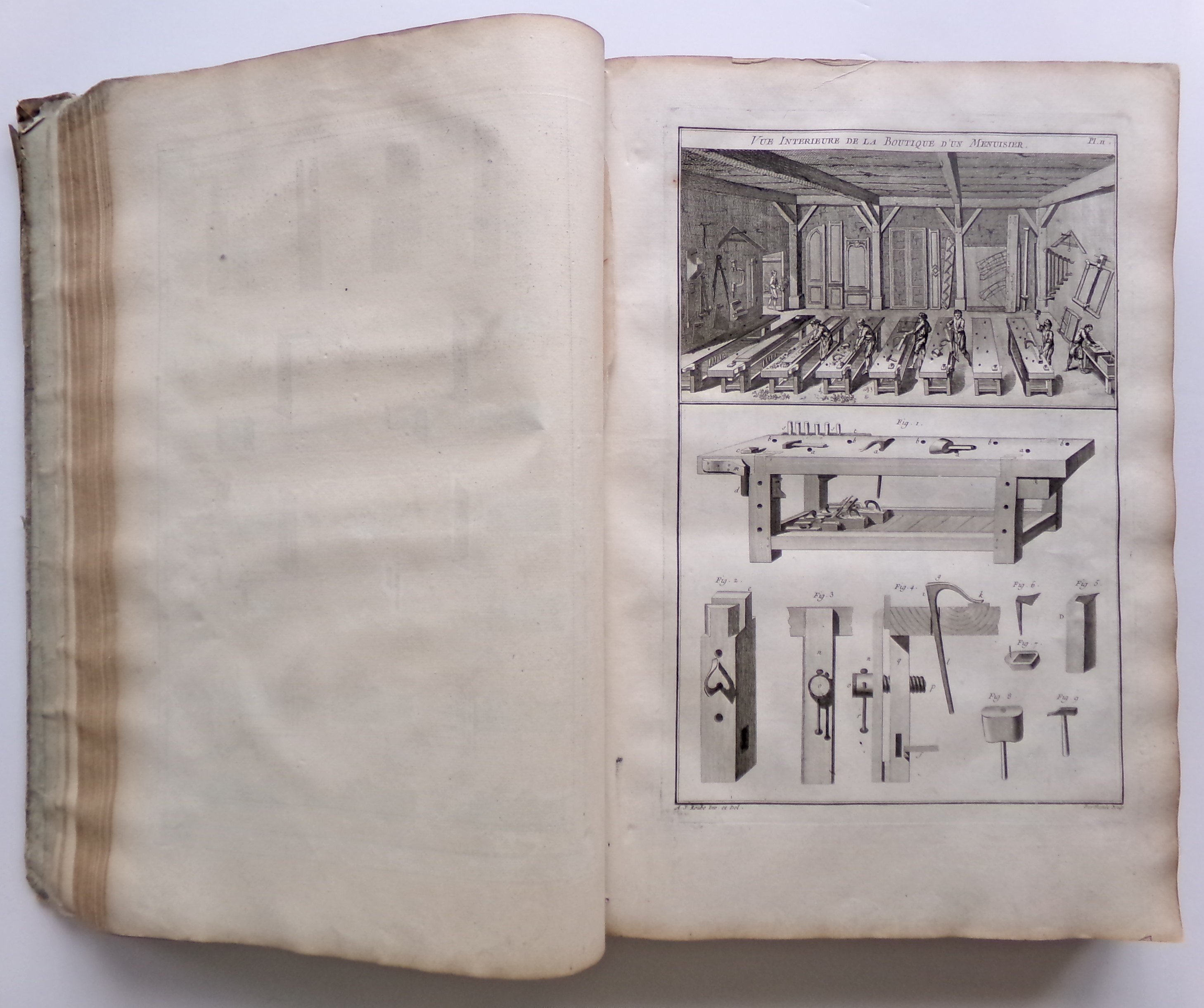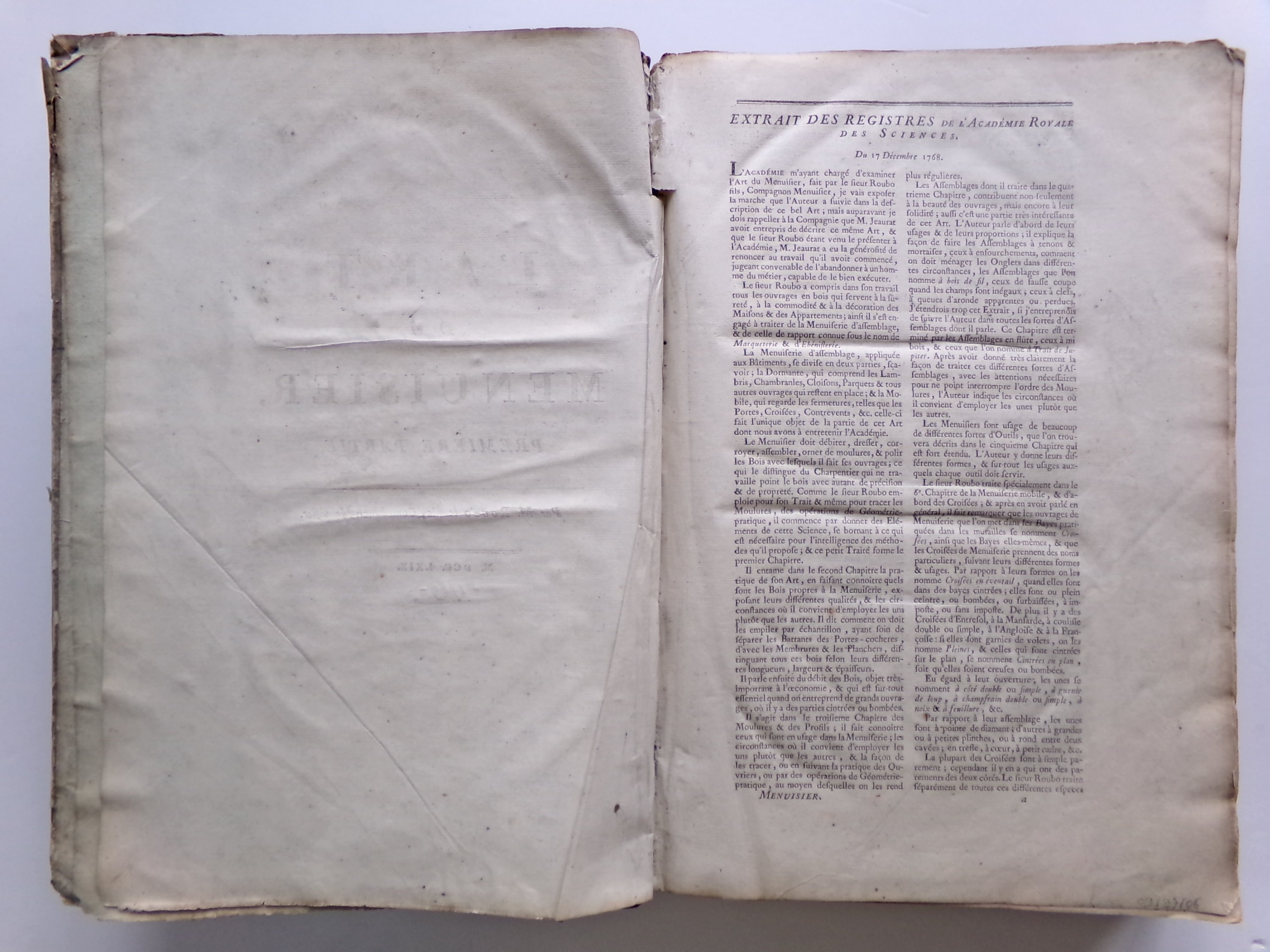 Edition originale du plus important ouvrage sur la menuiserie au XVIIIe siècle, décrivant nombre de spécialités autour de la menuiserie en général (décoration des boiseries d'appartements, portes, lambris, meubles...).