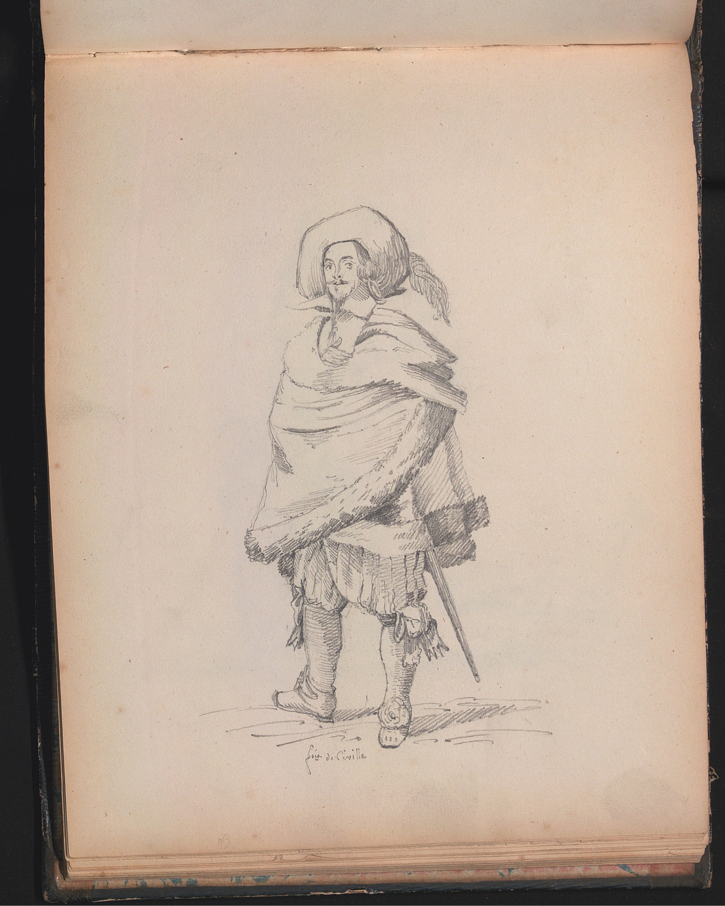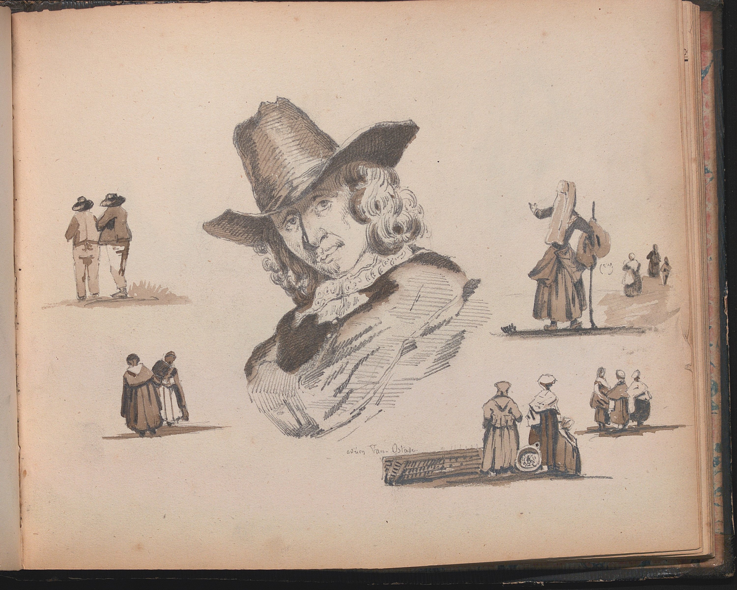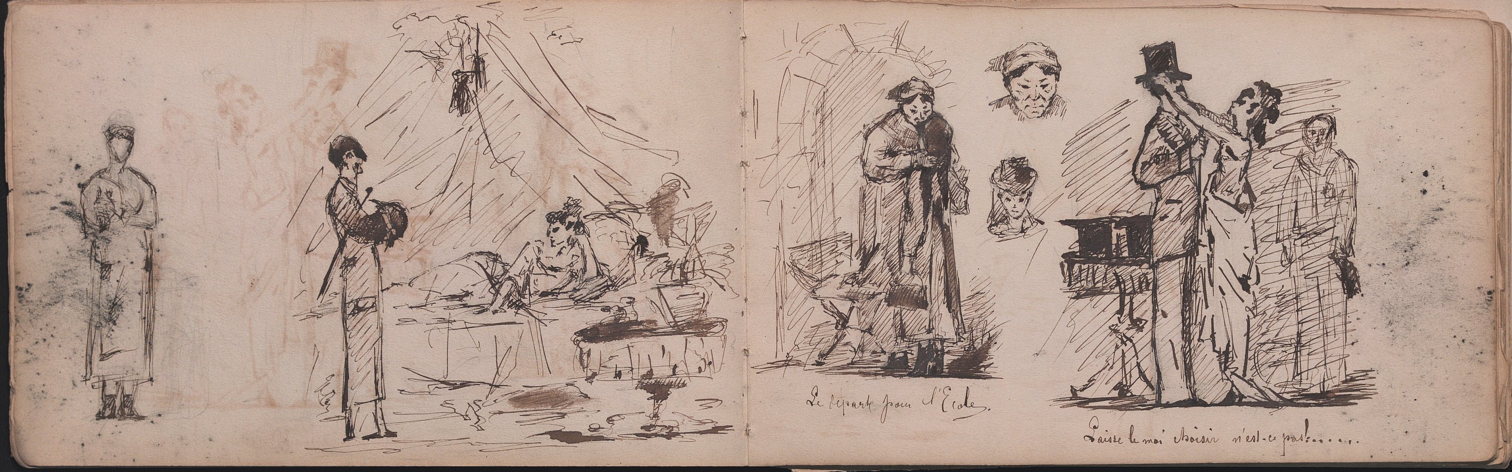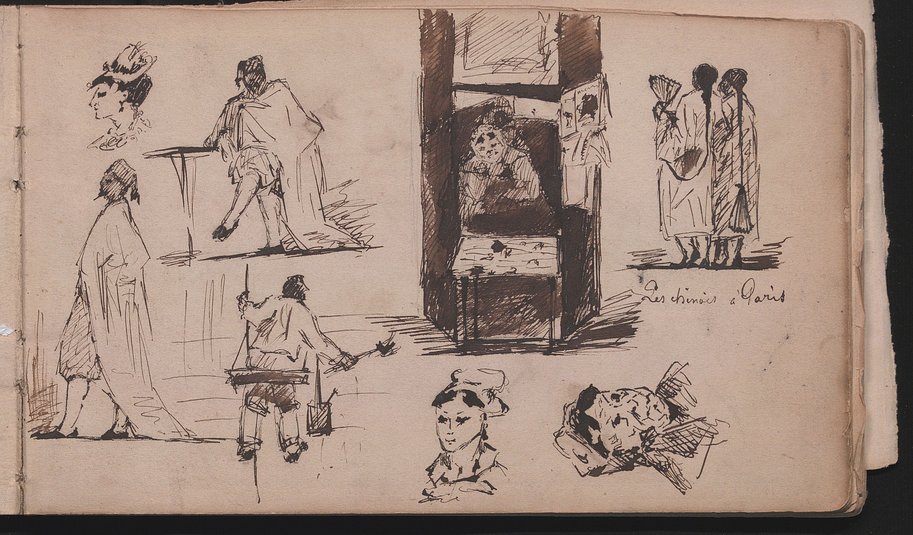 Carnet de dessins à la mine de plomb et à la plume, 13 x 21 cm, personnages et scènes parisiennes, milieu du 19e siècle.