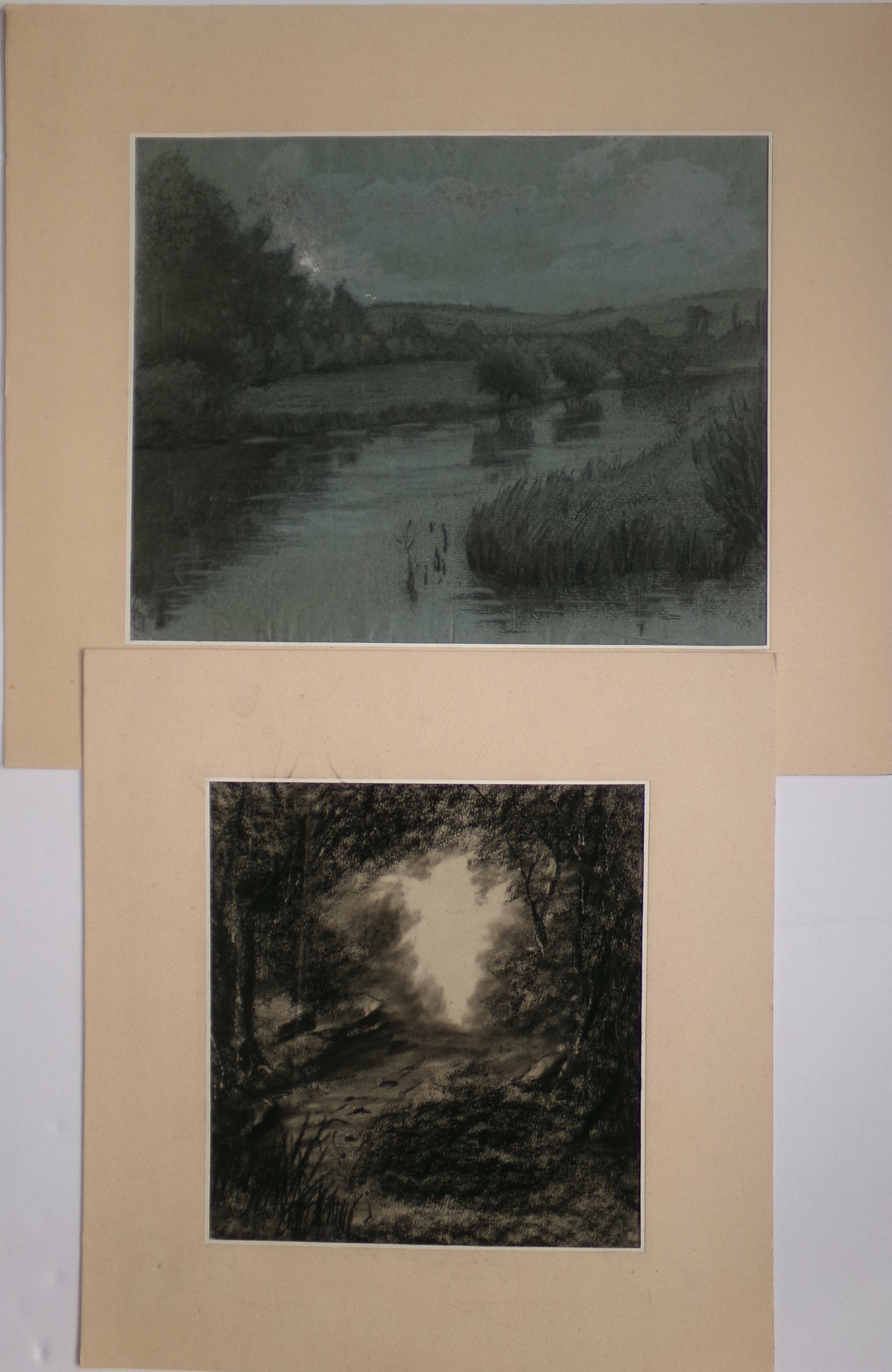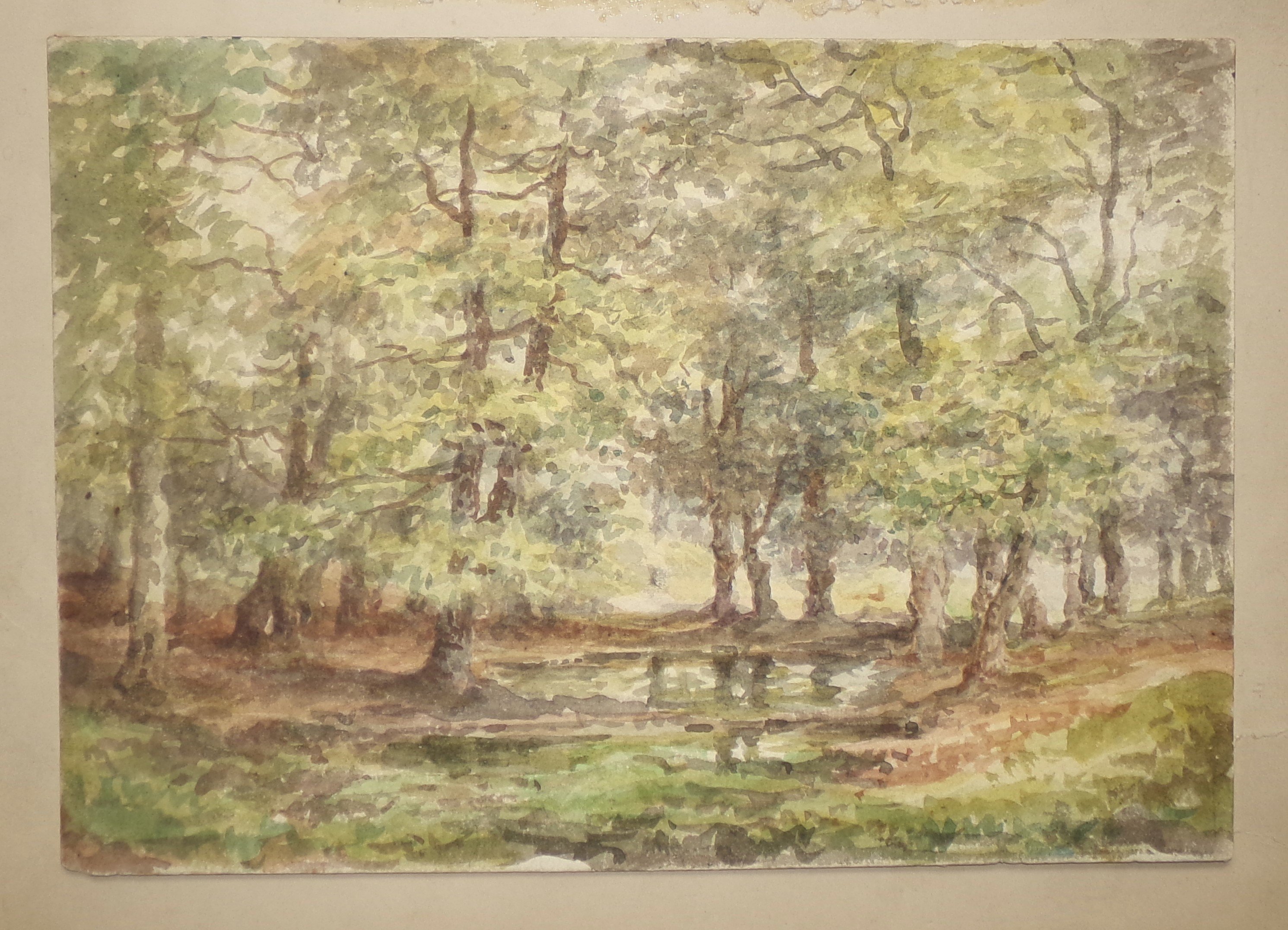 Réunion de 23 œuvres originales, techniques diverses (fusain, aquarelle, lavis, etc), formats divers, certaines signées, dont « Corbehem, bois du château Gosnay » et « Les prés la ville - Pierrefonds », lavis signés « L.D. », 26,5 x 35 cm et 35 x 26,5 cm ; Paysage de forêt, dans le goût de l’école de Barbizon, aquarelle, 18 x 25 cm ; Paysage, crayon sur papier gris, avec marque en rouge « Eugène Lepoittevin », 25 x 31 cm ; Promeneur, crayon signé Charles Ransonnette (1793-1877), 17 x 13,5 cm ; etc.