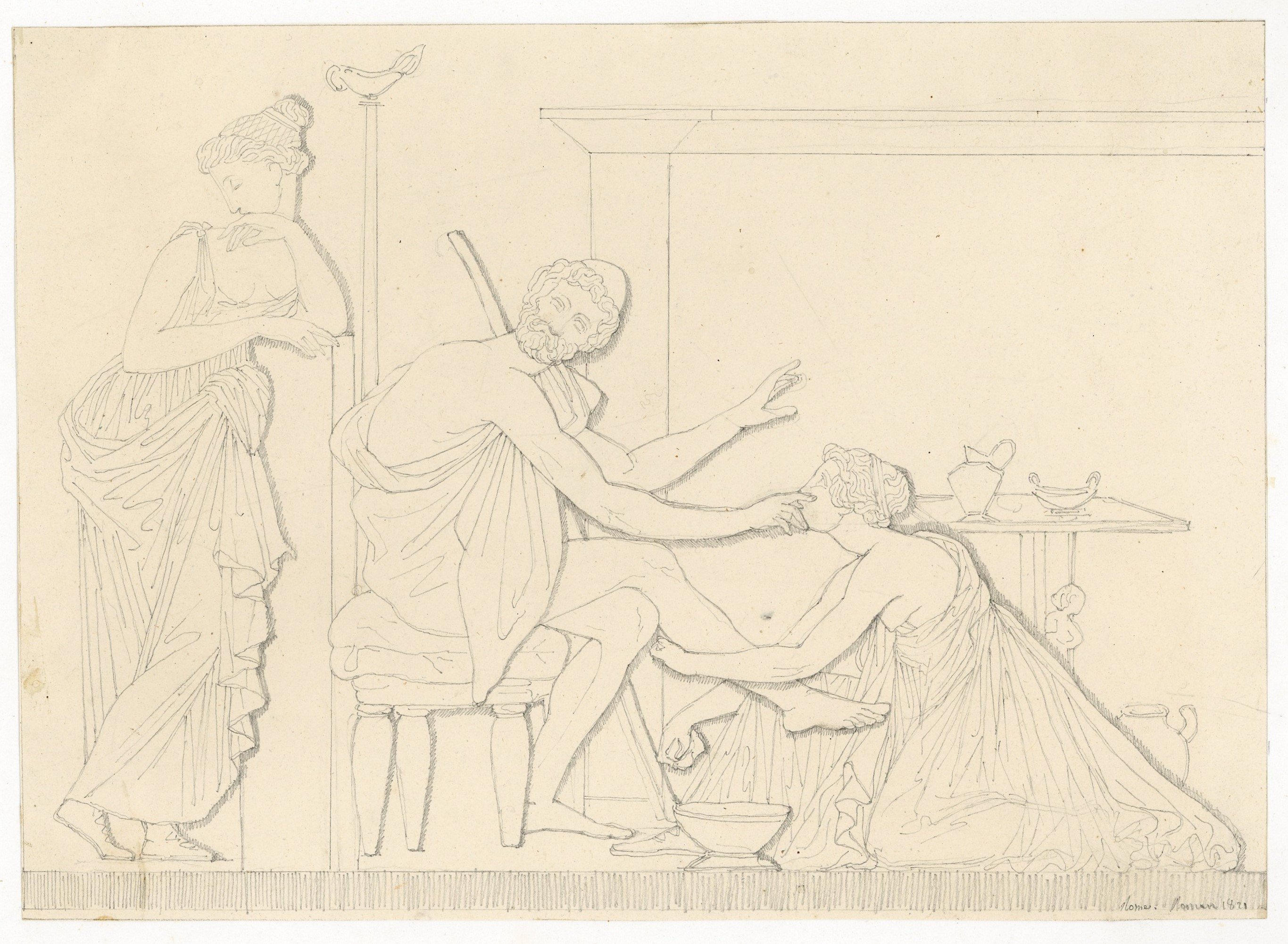 Jean-Baptiste Roman (1792-1835), Lavement des pieds d’Ulysse par Euryclée, dessin au crayon avec mention en bas à droite « Rome, Roman, 1821 », 16 x 22 cm ;