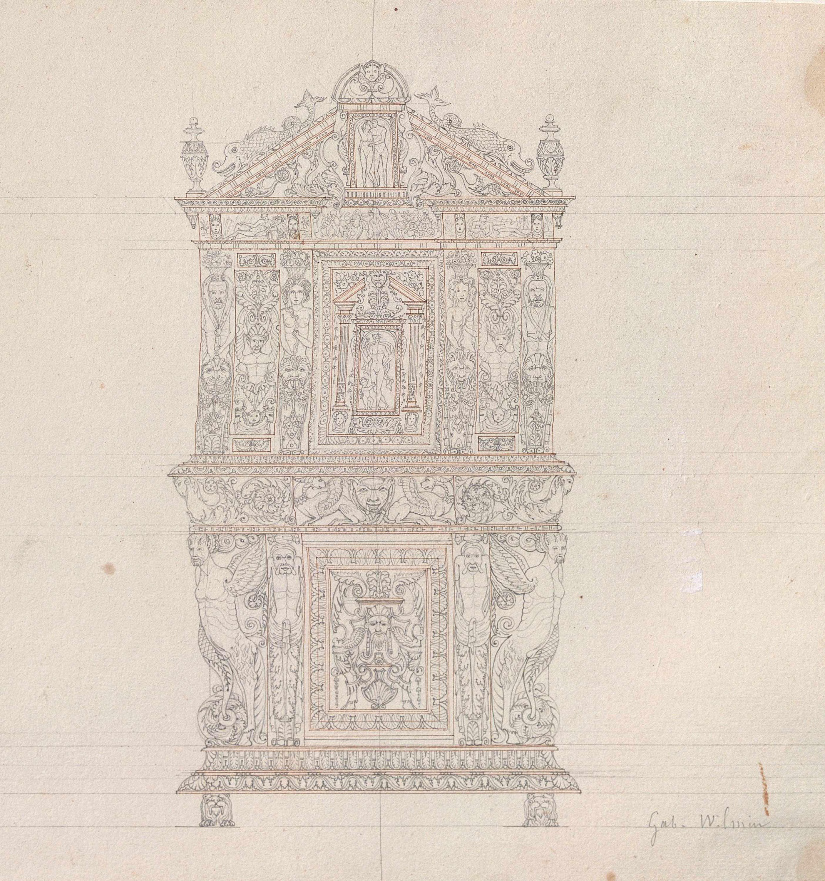 Buffet à deux parties, cabinet de M. de Monville, fin du 16e siècle, crayon, d’après « Monuments français inédits pour servir à l'histoire des arts dessinés, gravés et coloriés d'après les originaux par N.-X. Willemin » paru en 1839, 25 x 28 cm ;