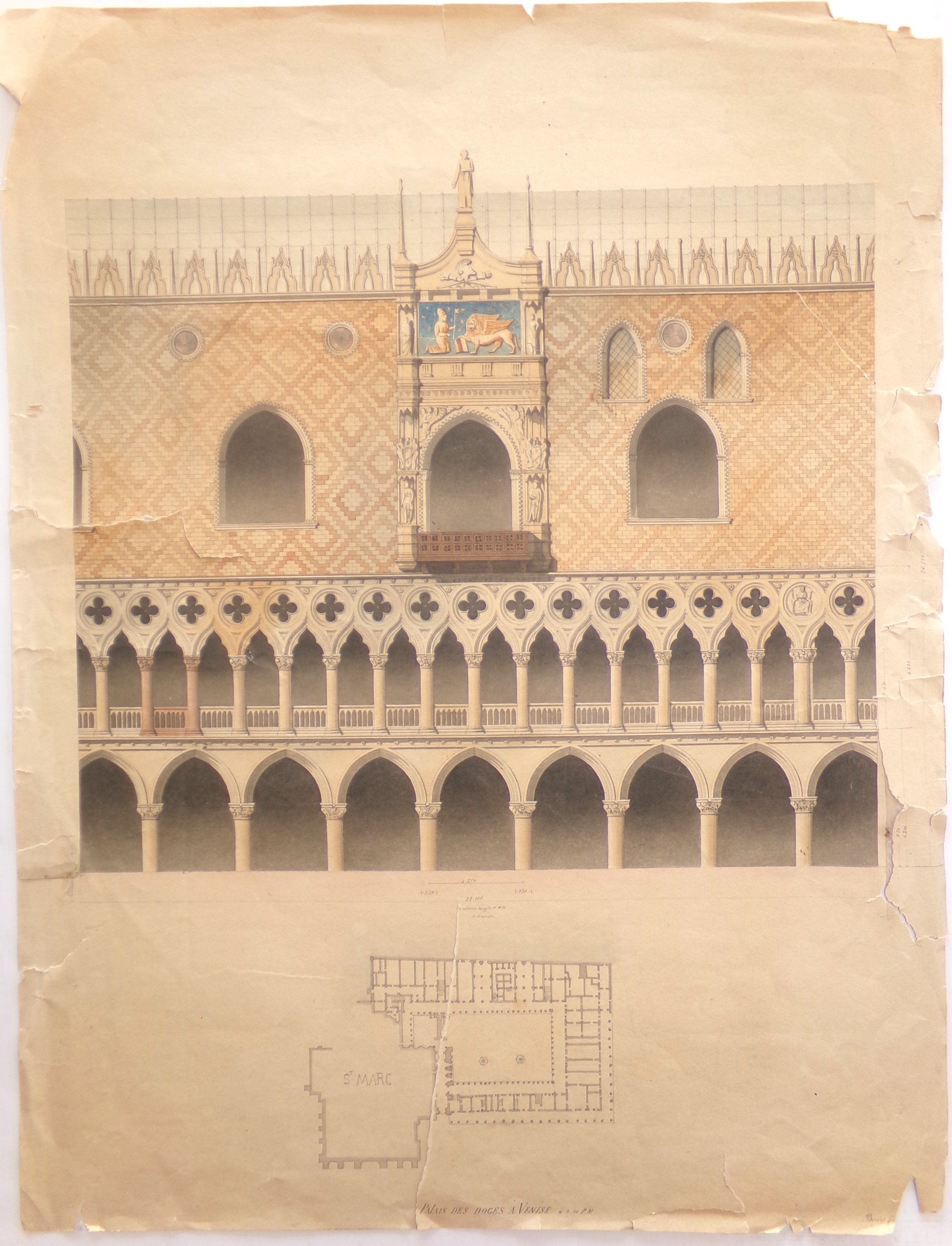 Façade du palais des Doges à Venise, dessin d’architecte, fin du 19e siècle, 53 x 41 cm (accdts, déchirures).
