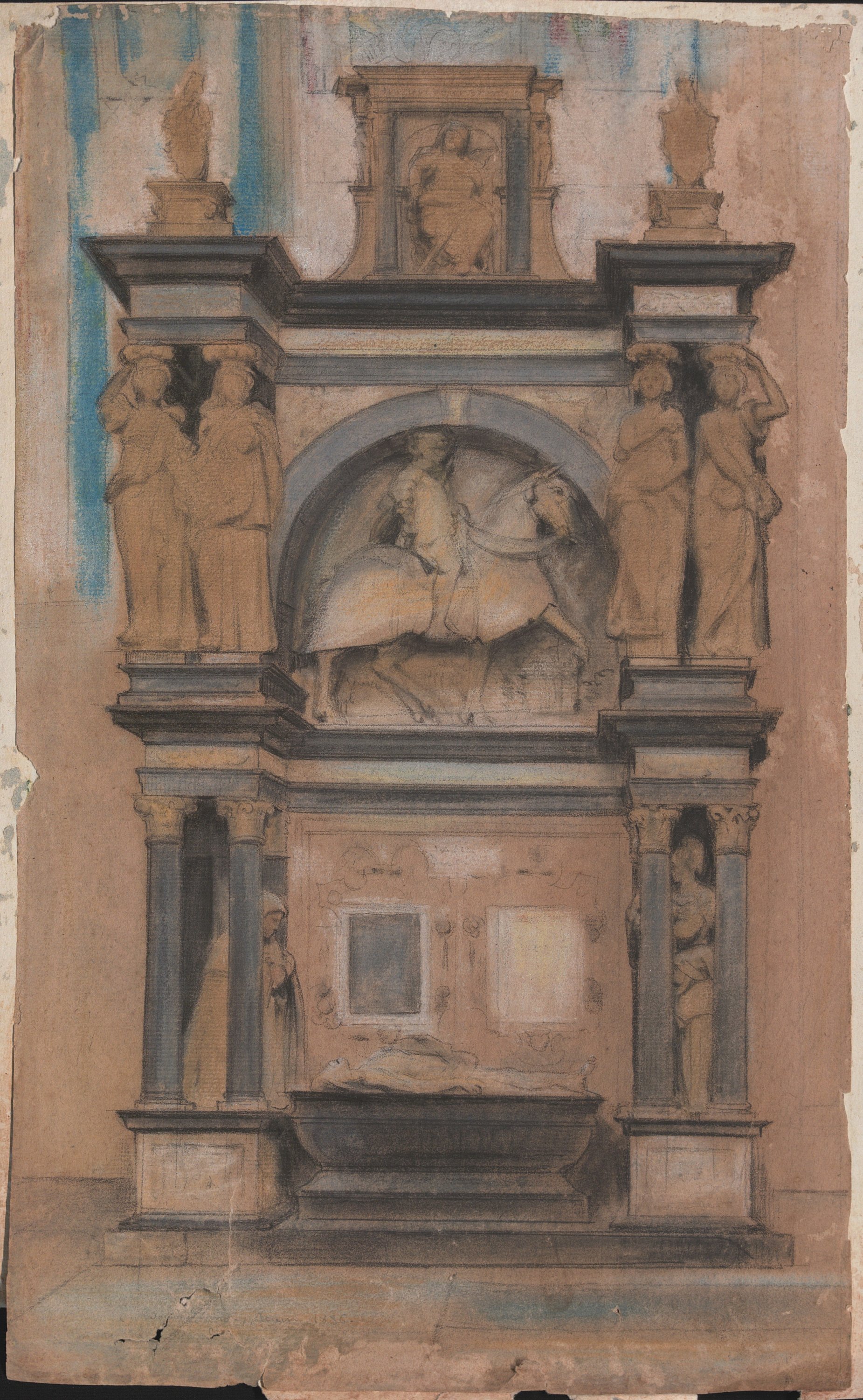 Mausolée de Louis Brizé sénéchal et gouverneur de Normandie dans la cathédrale de Rouen, gouache, 41 x 25 cm (en l’état, fortes mouillures, déchirures) ;