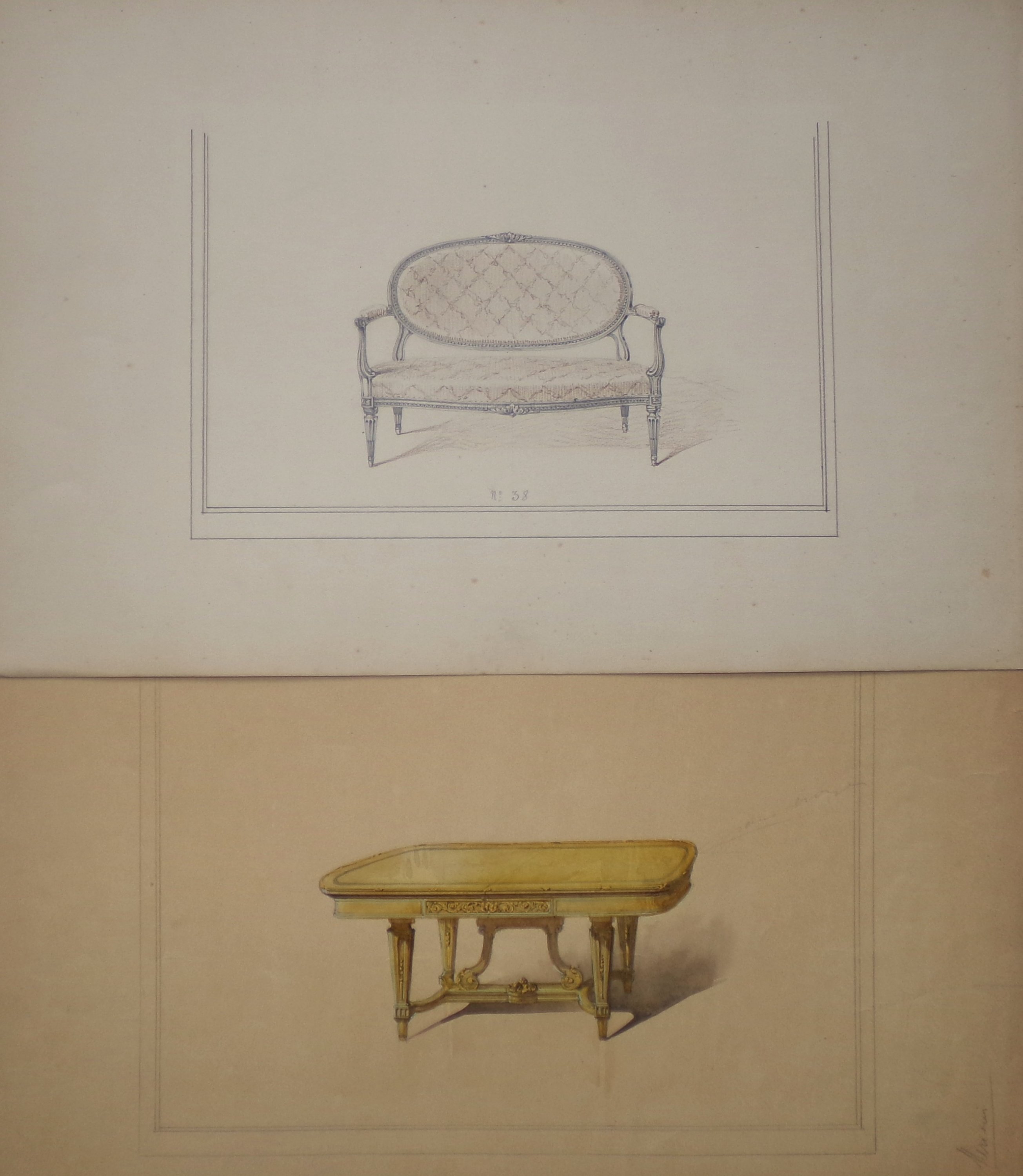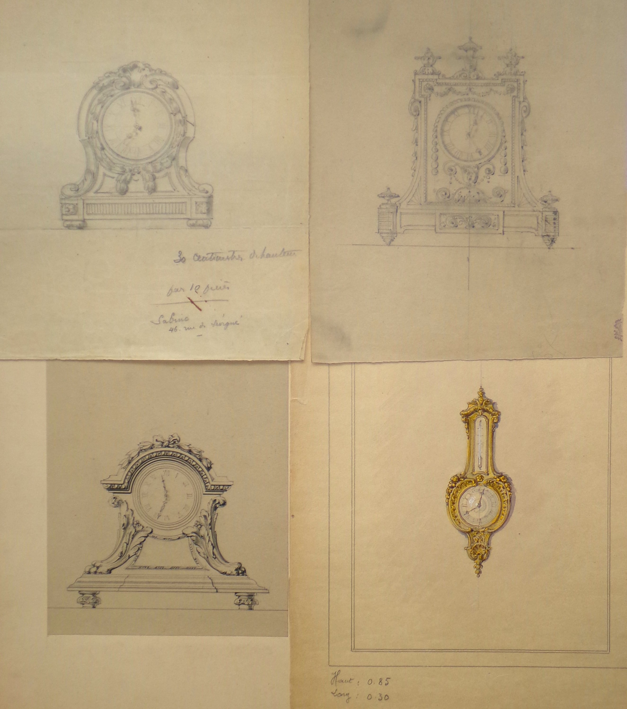 Un des dessins portent le tampon « Meubles d’art Marius Sabino 46 rue de Sévigné » et un autre mention manuscrite « Sabino 46 rue de Sévigné ».