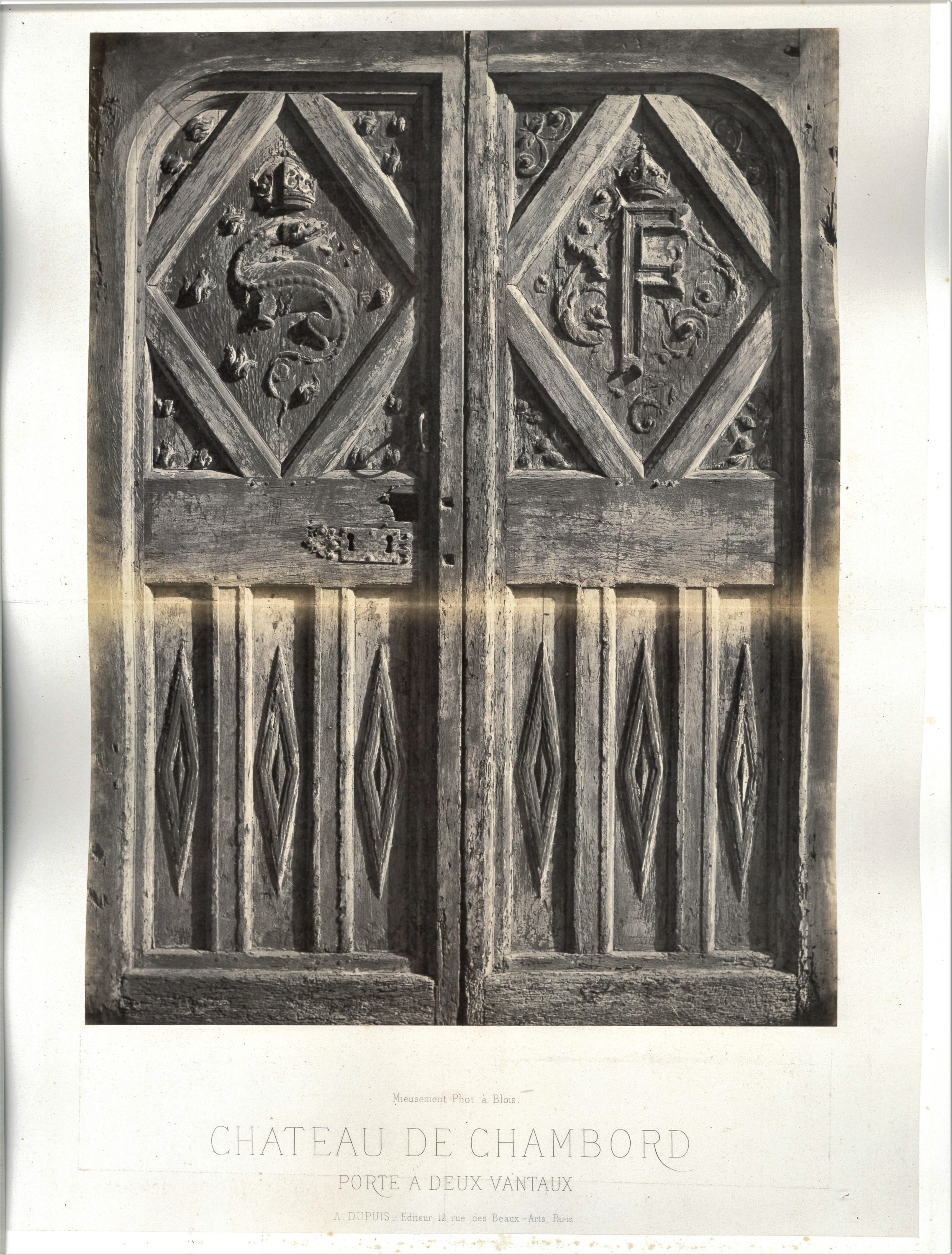 Château de Chambord : vue sur la place d’armes, la lanterne, caisson des voûtes de la salle des gardes, chapiteaux de la façade du levant, porte à deux vantaux, etc.