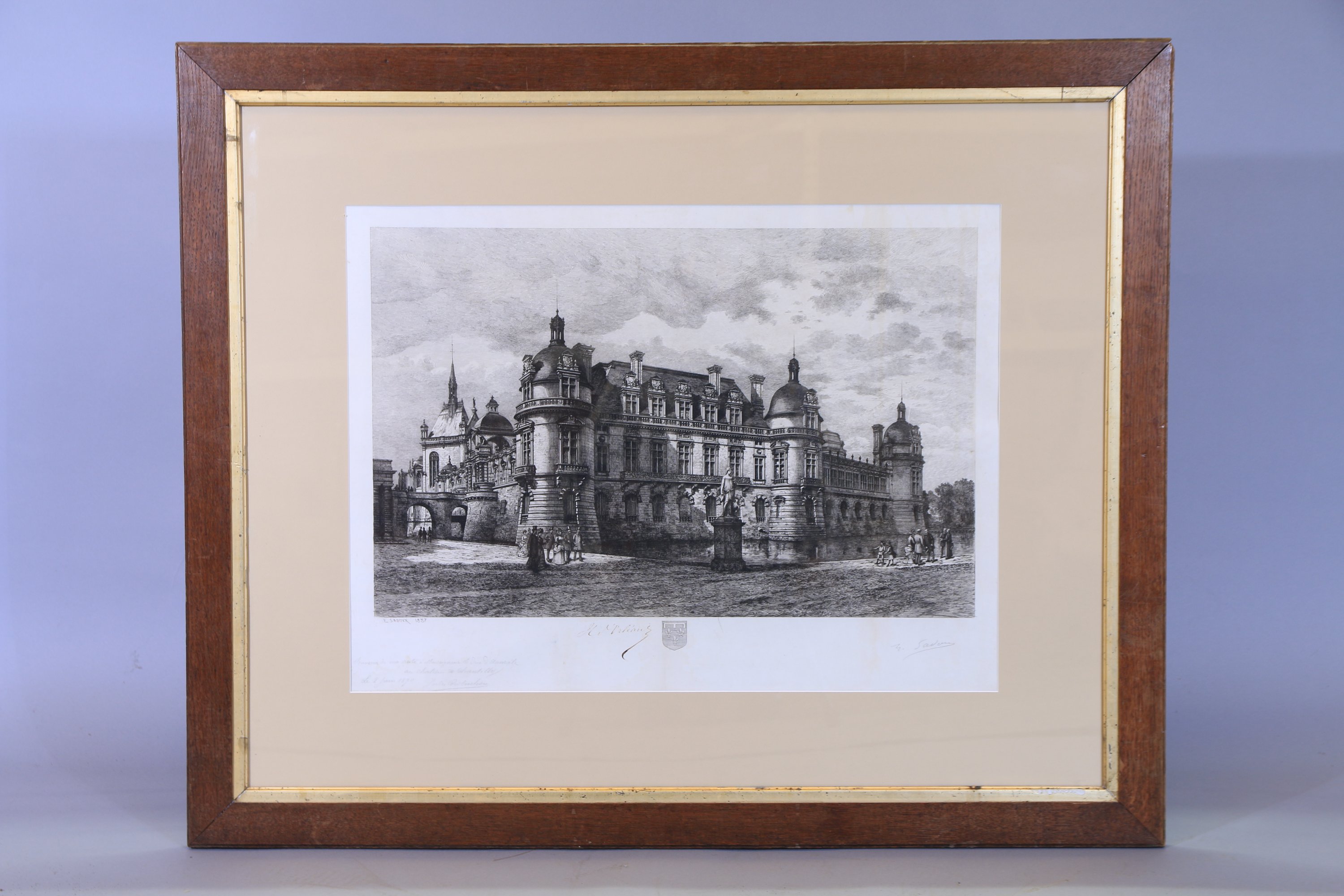 Vue du château de Chantilly, grande eau-forte par Eugène Sadoux (1841-1906), signée et datée en bas à gauche. 41,5 x 64,5 cm à vue (86 x 104 cm avec cadre) (mouillures)