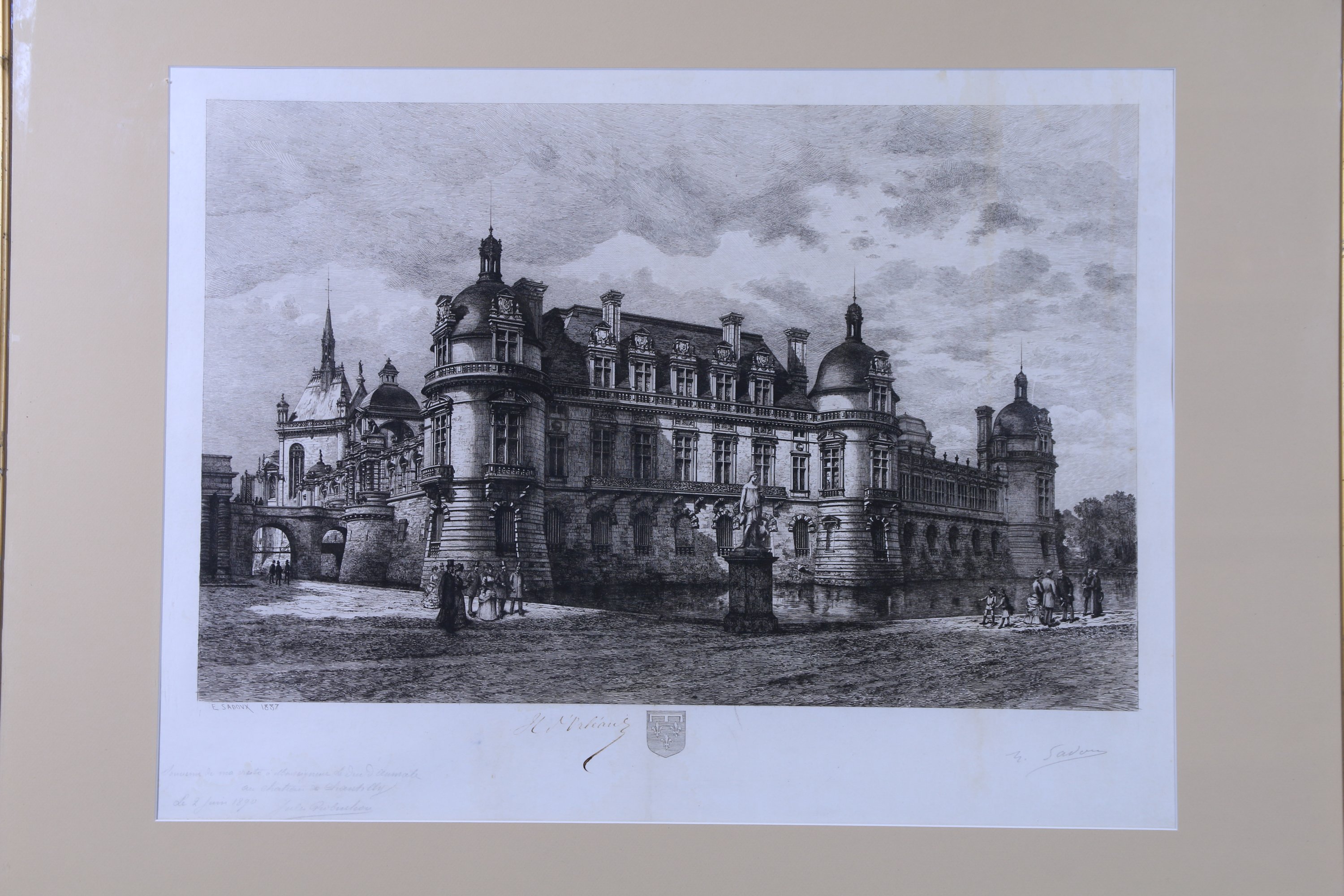 En marge, signatures manuscrites de l’artiste, d’Henri d’Orléans duc d’Aumale (1822-1897) qui a légué en 1886 la propriété à l’institut de France, et apostille écrite et signée par le photographe et libraire Jules Robuchon (1840-1922) : « Souvenir de ma visite à Monseigneur le duc d’Aumale au château de Chantilly le 2 juin 1890 ».