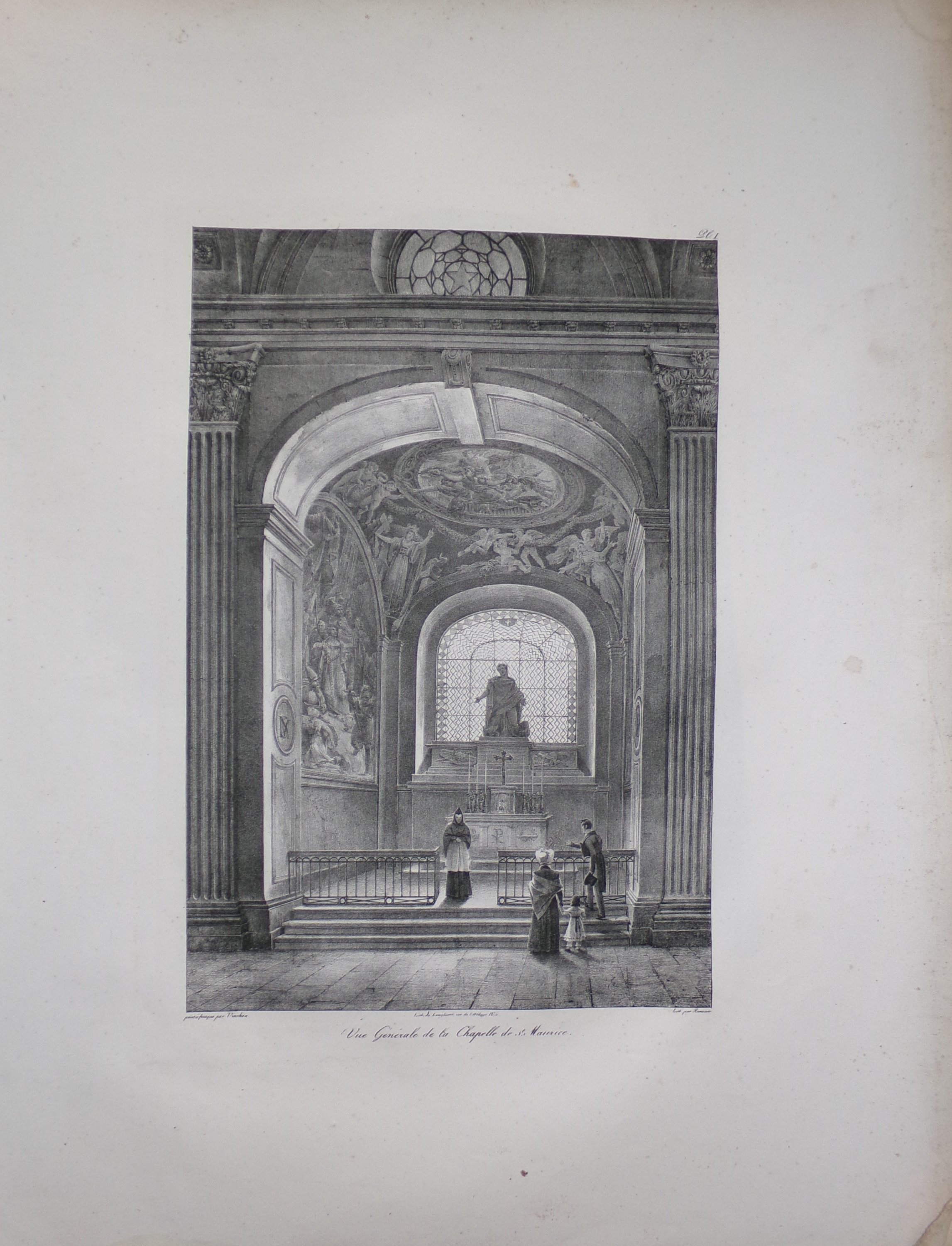 Auguste-Jean-Baptiste Vinchon, Peintures à fresques exécutées à Saint-Sulpice, dans la Chapelle de Saint-Maurice. Paris, Ballard, 1823. In-plano, en feuillets, couverture d’attente bleutée, 7 pages et 6 planches d’illustrations (qqs mouillures) ;