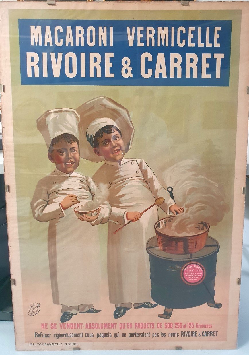 Affiche "MACARONI VERMICELLE / RIVOIRE & CARRET". Vers 1900. Epreuve originale imprimée en couleurs. "Imp. Tourangelle, Tours", 131 x 88 cm. Non entoilée (petits défauts en marge) ;