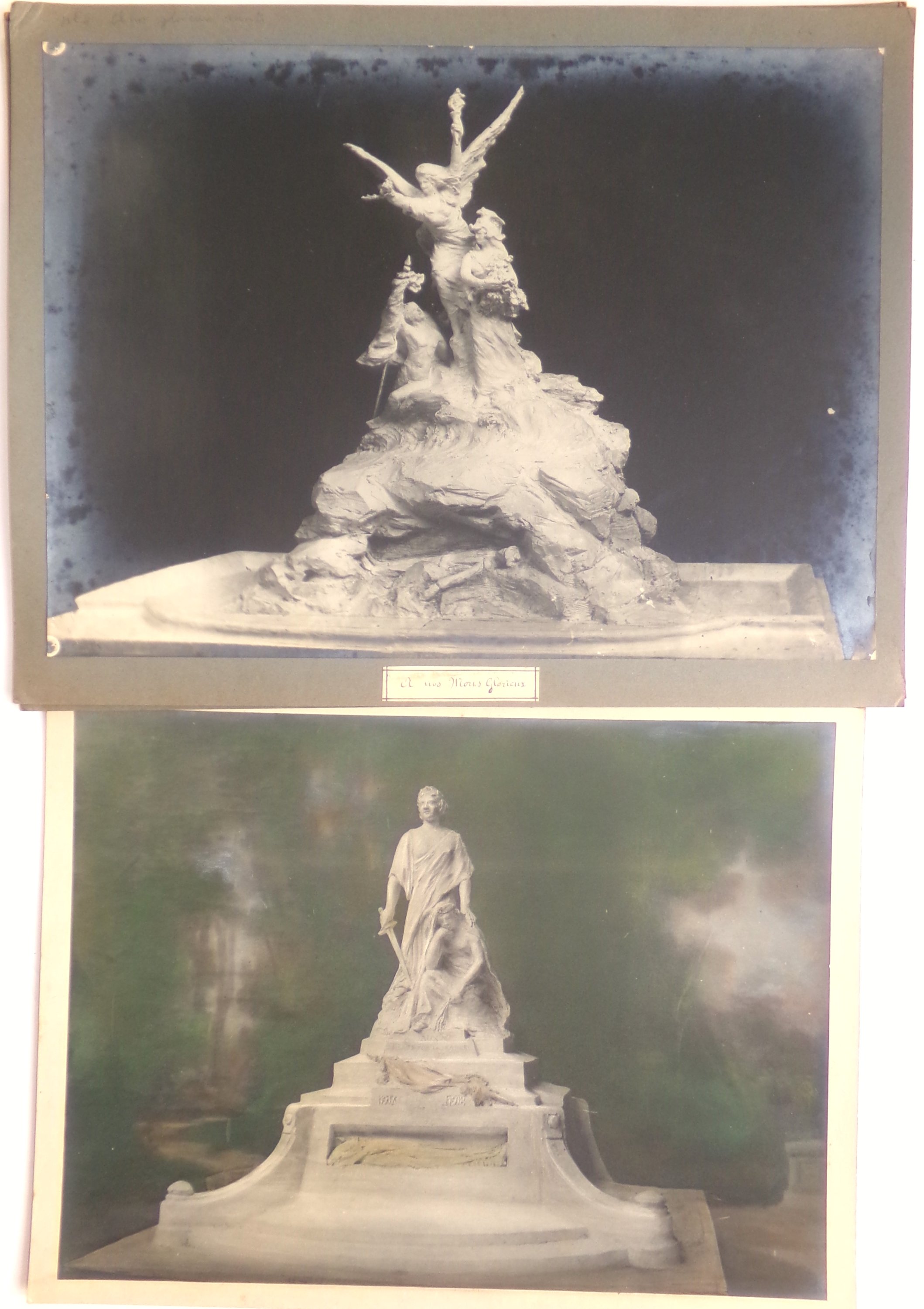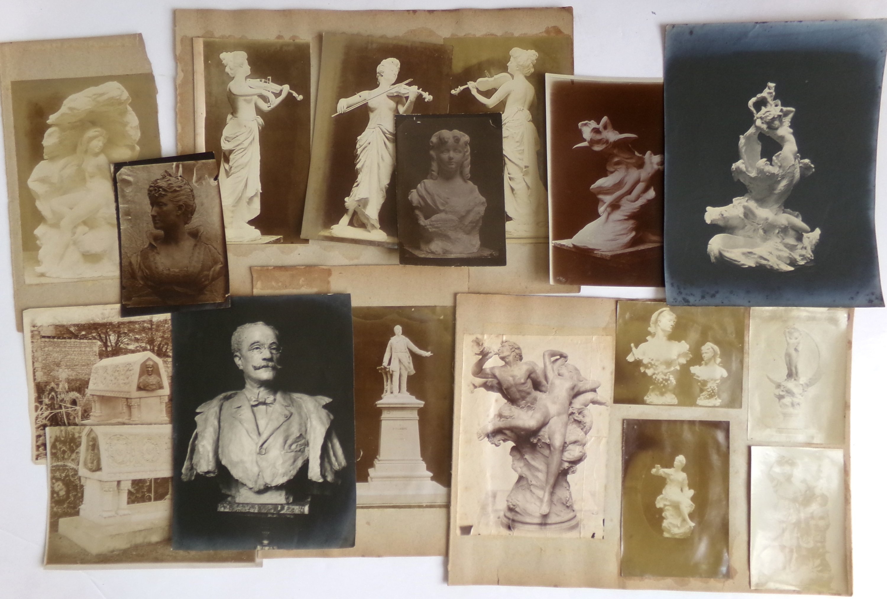 • Sculptures et bronzes: + de 100 photographies, formats divers, des œuvres sculptées ou projets de maquettes, vers 1885-1910, dont: buste d’un homme orientaliste, 1884 ; femme au violon exposée à Toulouse en 1895 ; série des bustes Les coiffes de France aux costumes folkloriques dont la célèbre Tourangelle, vers 1905 ; La Rose buste exposé à Blois en 1912 ; Ondine, naïades, allégories ; bustes de femmes, hommes, enfants, officiers militaires ; projet de statue dédié à Pierre Flamens ; etc.