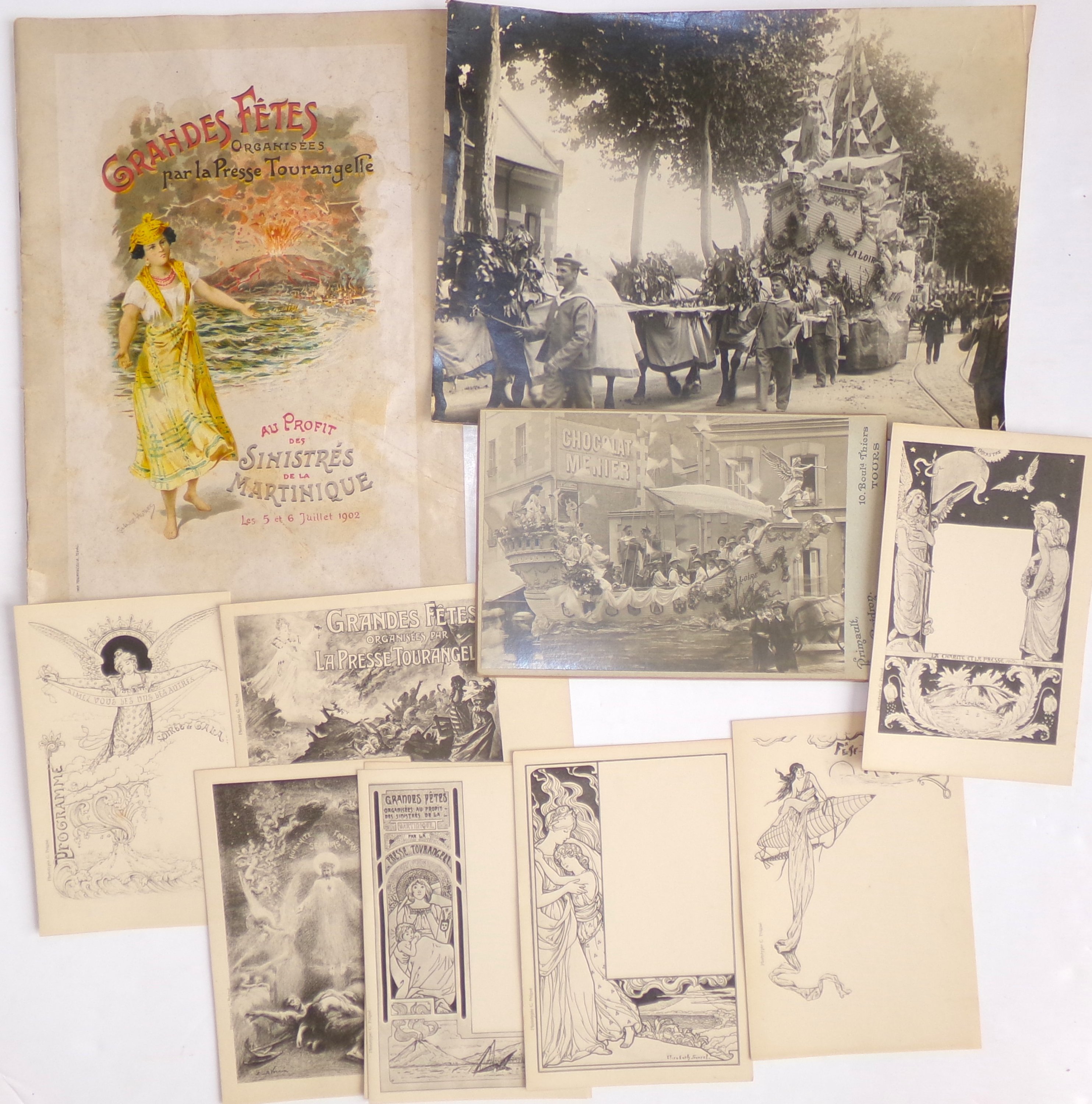 • Grandes fêtes organisées par la Presse Tourangelle au profit des sinistrés de la Martinique, 5 et 6 juillet 1902: programme 24 pp. in-8 + rare série de 7 cartes postales dont « Fête aérostatique » par Delpérier ;