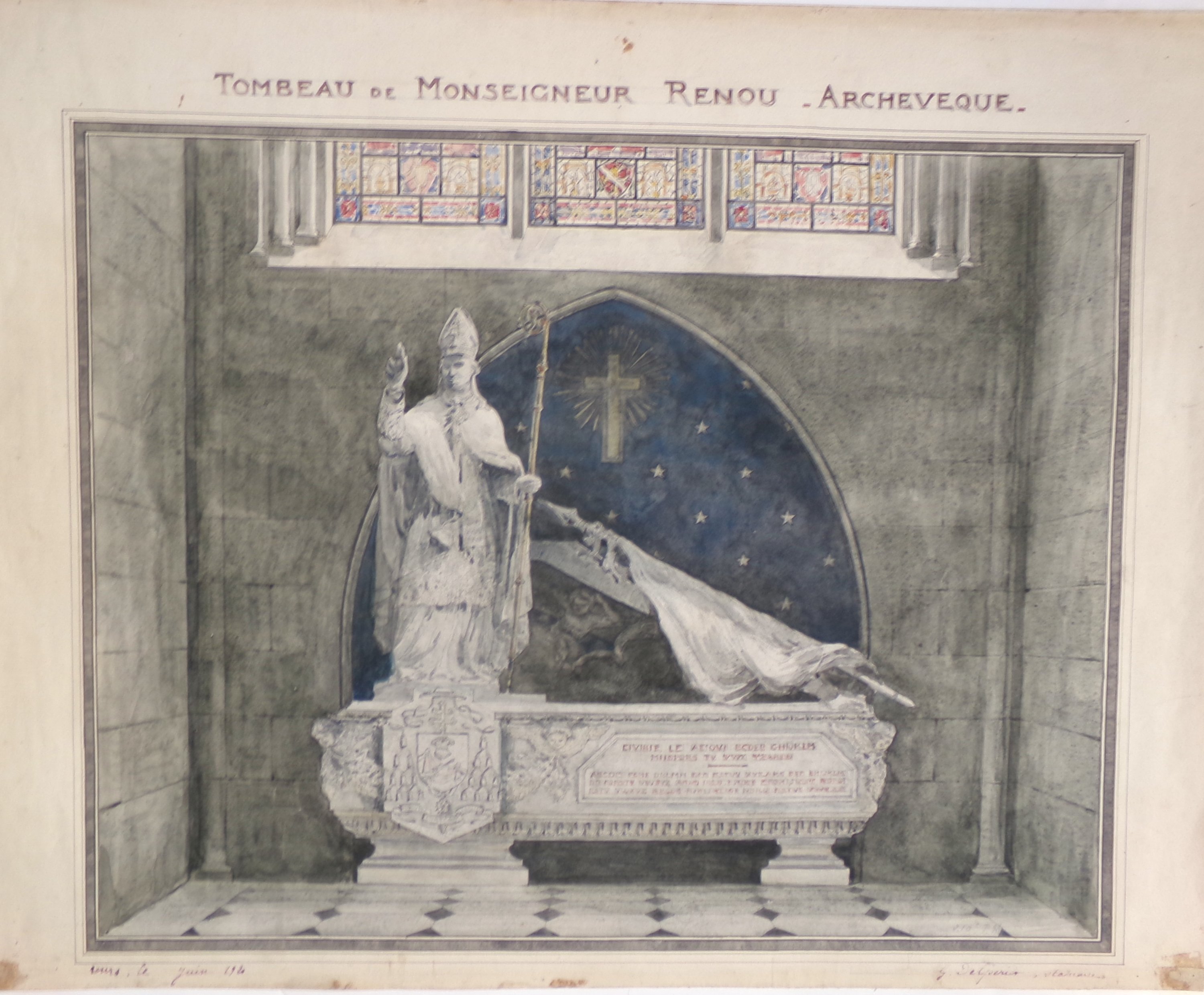 • Monuments commémoratifs: 7 photographies d’un projet de maquette du monument dédié à Sadi Carnot à Lyon et de l’inauguration officielle (en l’état), vers 1896-1900, env. 20 x 14 cm ; 2 photographies (accdts) d’un projet de maquette du monument dédié à Pierre Puget pour la ville de Marseille?, vers 1905, 24 x 29,5 cm ; Monument à Pierre de Ronsard inauguré dans le jardin des Prébendes à Tours en 1924 (2 plans de coupe aquarellés, signés, datés 1928, 47 x 55 cm ; cliché photographique, 24 x 18 cm avec au dos copie d’une mention manuscrite signée de Louis Meurisse photographe: « Une statue qui s’est un peu fait attendre! C’est celle de Ronsard qui sera inaugurée au mois de septembre à Tours et qui représente notre photo. Elle est l’œuvre du maître G. Delpérier que l’on voit ici au premier plan mettant la dernière main à l’œuvre. La statue est exposée au Salon dont les portes ouvrent demain » ; 2 photos et 2 cartes photos ; prospectus de souscription ; 2 L.S. du cabinet du maire de Tours, février 1898, adressées à Louis Chollet, président de la Société littéraire et artistique de la Touraine relatives à un projet d’érection d’un monument dédié au poète Ronsard ; diverses publications sur Ronsard: La correspondance de Loys de Ronsart par Laumonier, 1911 ; Buste de Ronsard par Grandmaison, 1895 ; Etudes italiennes par de Nolhac ; Sur la bibliothèque de Ronsard par Laumonier, 1928 ; Notice sur une médaille inédite de Ronsard par Chabouillet, 1875 ; Ronsard poète pétrarquiste par Laumonier, 1922 ; Inauguration du monument de Ronsard dans le jardin des Prébendes par Chaigne, 1985, brouillon manuscrit et publication) ; Plan d’élévation du projet du tombeau de monseigneur Renou, lavis et aquarelle, signé et daté juin 1920, 48 x 60 cm ; 3 photographies de l’inauguration du buste d’Emile Sourdillon fondateur de l’Institut d’études françaises de Touraine installé à l’hôtel Torterue à Tours en juillet 1931, env. 18 x 24 cm ;