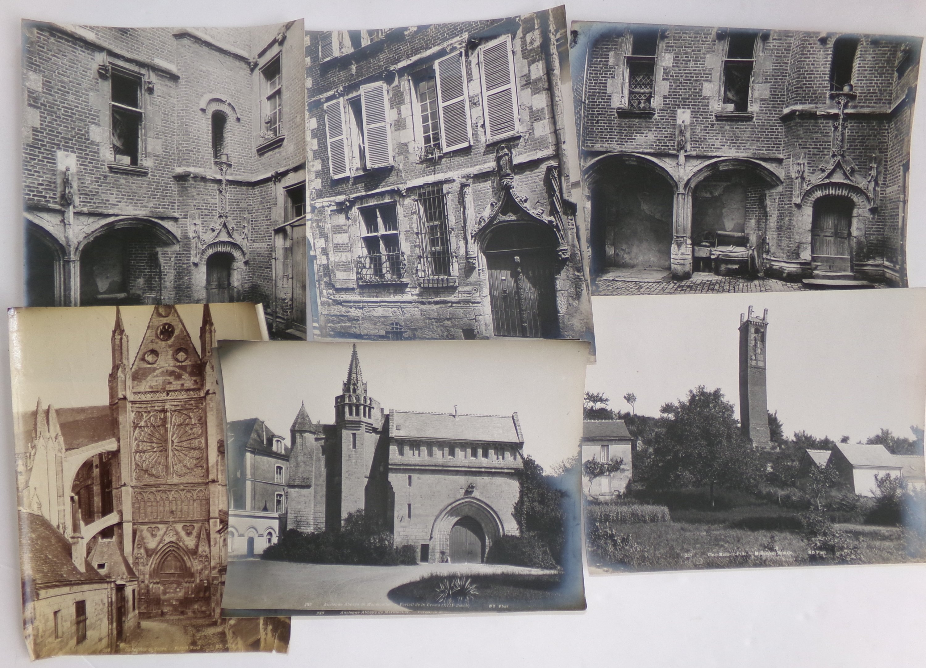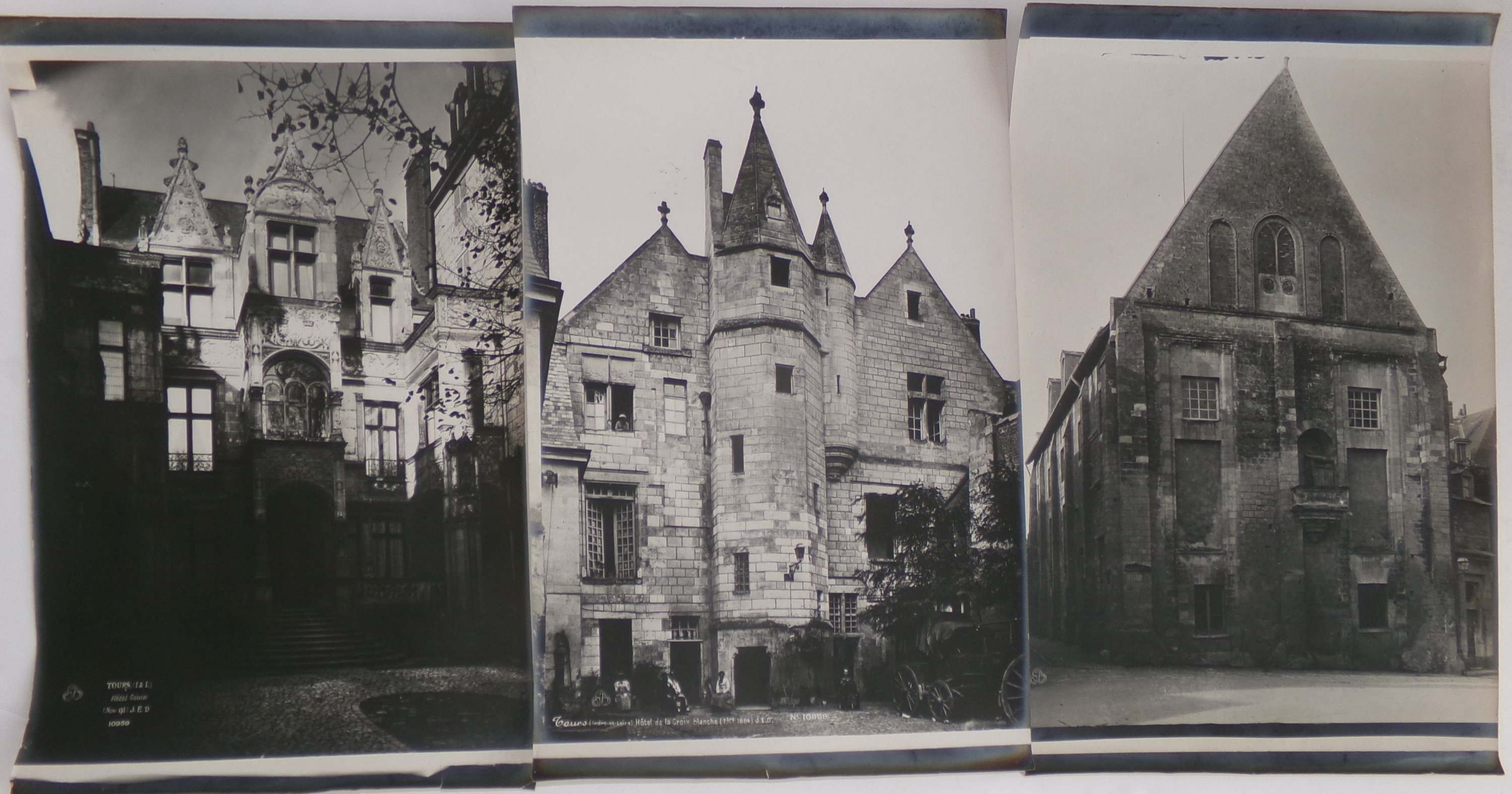 • + de 270 clichés photographiques et cartes postales, vues de monuments (églises, rues, châteaux), éléments d’architecture civils et religieux, paysages, en majorité de Touraine, vers 1890-1910 dont 8 photos du château de Clos-Saint-Victor ou de Maucannière à Joué-lès-Tours, vers 1900 ; 6 vues de Vouvray (gare des tramways, hôtel restaurant Bonneau ; prieuré Saint Léonard à l’Ile-Bouchard ; Hôtel de la Croix Blanche, Hôtel Gouin, cathédrale Saint Gatien, tour de l’horloge à Tours ; Château de l’Olivier à Rochecorbon ; Chapelle funéraire à Bléré ; fontaine Lebon à Bourges ; temple protestant de Saumur ;