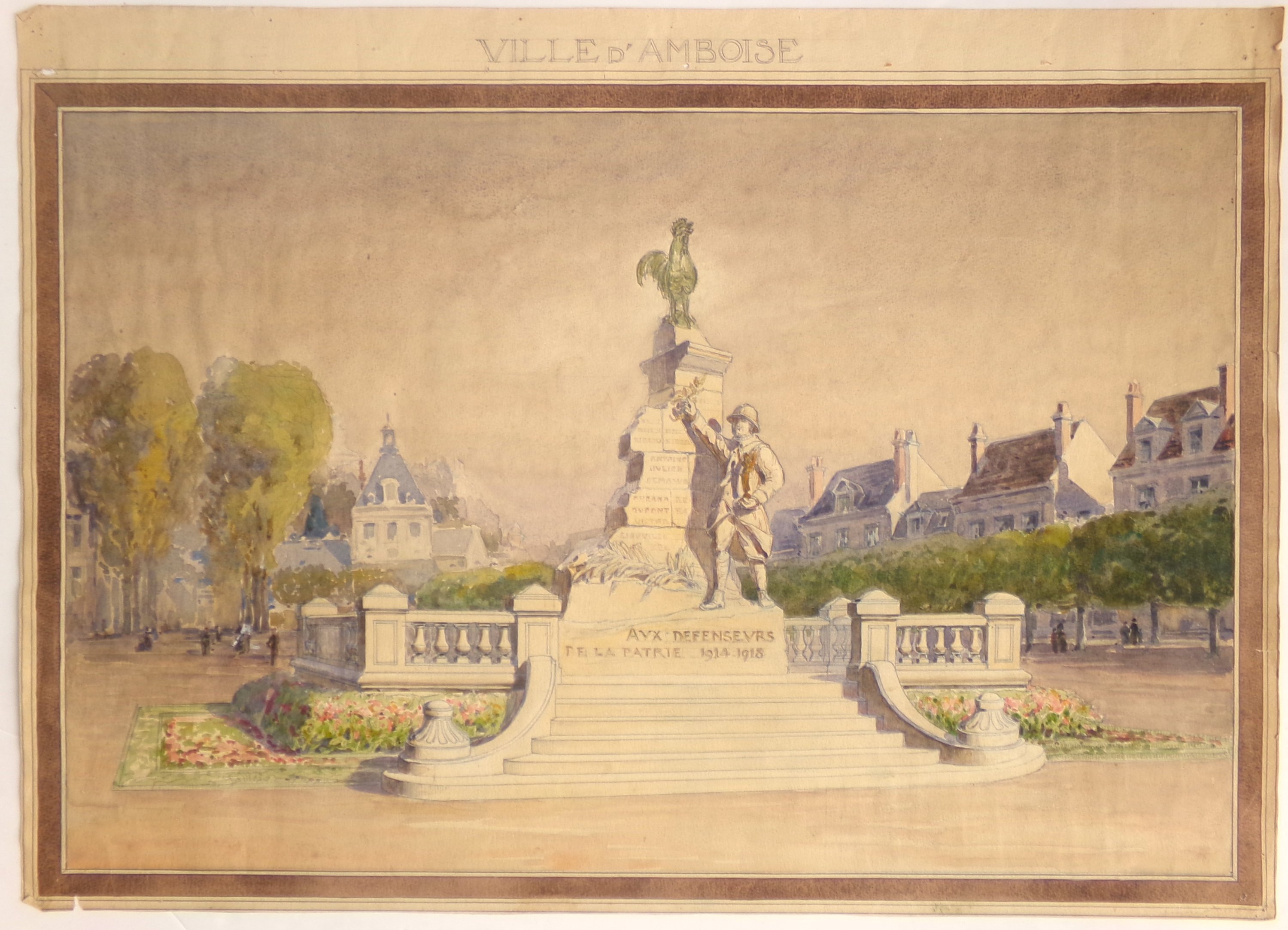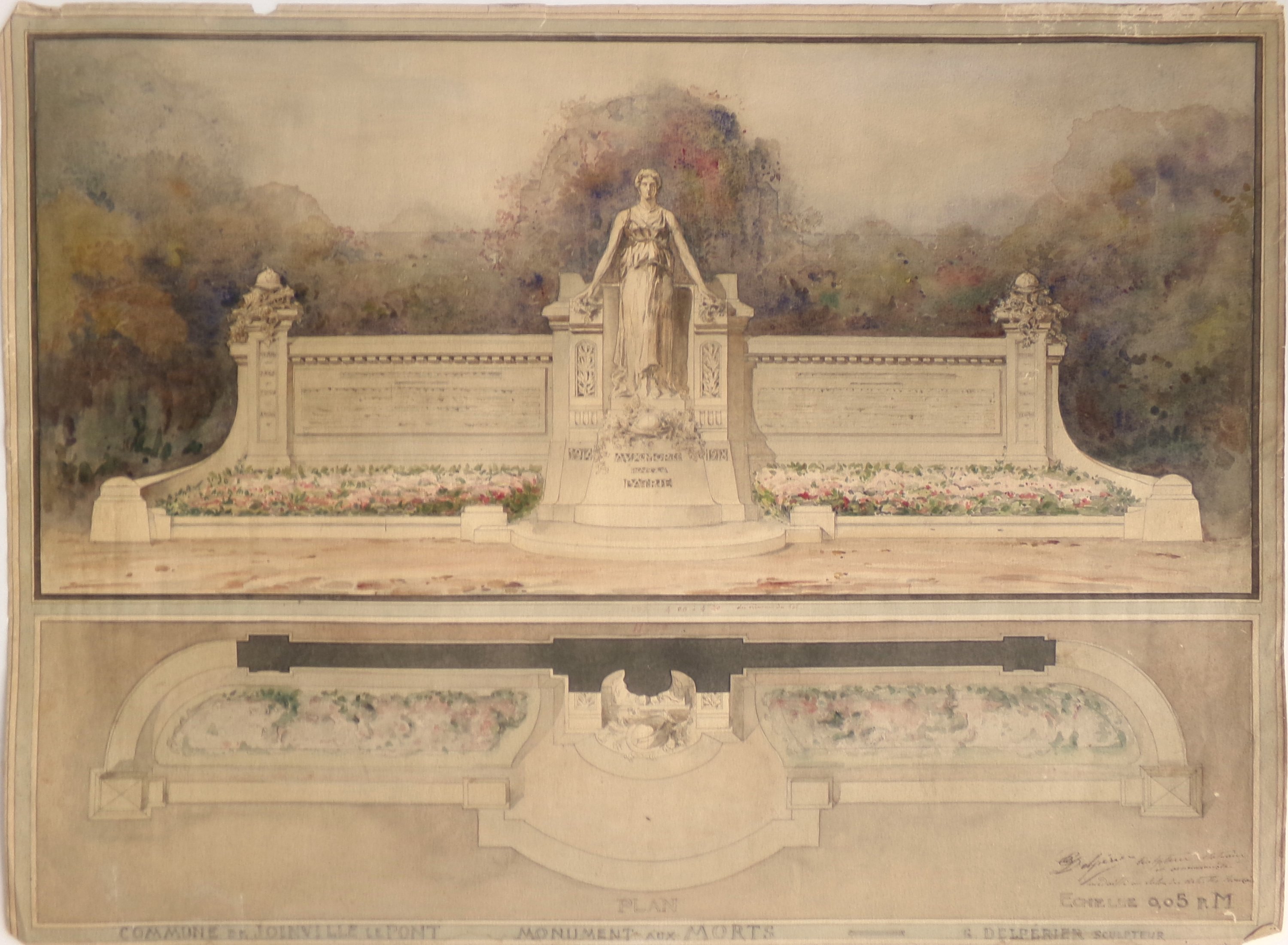 • Monuments aux morts de la Grande Guerre, vers 1919-1920: dessin gouaché, 22 x 17 cm, et 17 photographies de projets de maquettes, env. 43 x 30 cm ; 14 plans et coupes aquarellés de monuments projetés ou aboutis, certains signés, env. 45 x 68 cm, comme celui de Neuillé-Pont-Pierre, Montbazon, Amboise, Fontenay-le-Comte (Vendée), Rochechouart (Haute-Vienne), Saillenard (Saône-et-Loire), Joinville-le-Pont (Val-de-Marne) ; 6 cartes postales et 3 photographies des monuments de Neuillé-Pont-Pierre, Sainte-Catherine-de-Fierbois, Verneuil-sur-Indre, Dolus, Ecole primaire supérieure de Tours, Dissay-sous-Courcillon, Joinville-le-Pont + 2 boites à chaussures contenant des cartes postales neuves et multiples des monuments aux morts réalisés par Delpérier ;