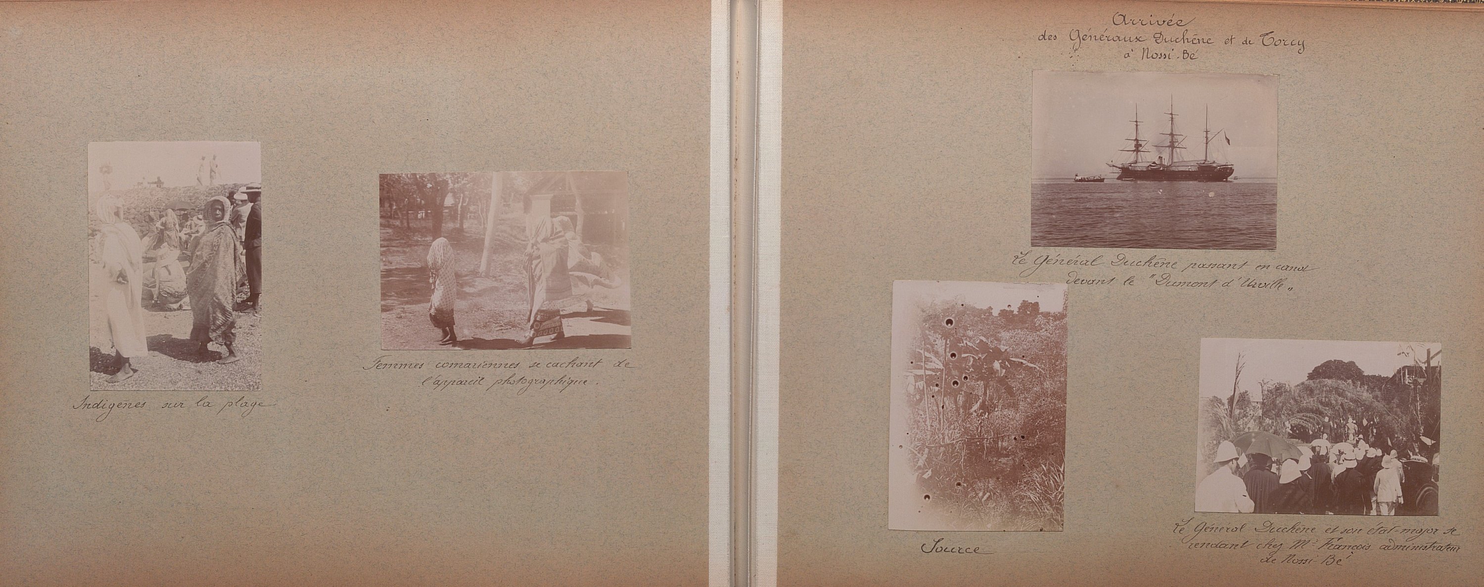 « En route pour Madagascar »: « Les colonels Bailloud, de Beylié, le Cdt de La Guillonière », groupes de soldats de différentes armes sur les pontons des bateaux, passage au Canal de Suez, escales à Obock (Djibouti), Zanzibar (rues, marché, troupes du Sultan, mosquées), Mayotte ;