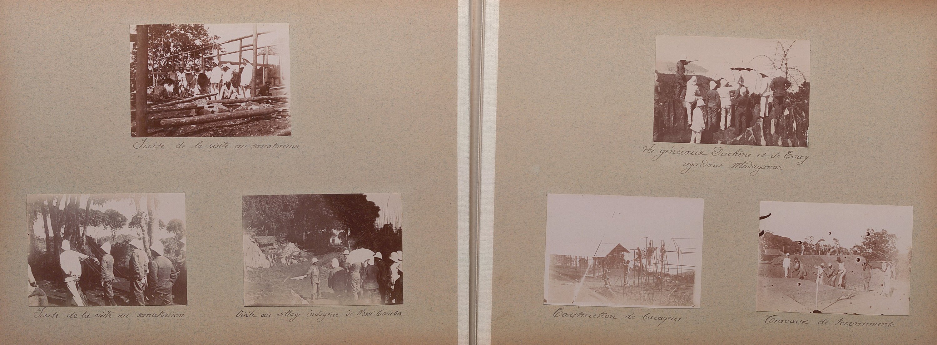 « Arrivée des généraux Duchesne et de Torcy à Nossi-Bé » ; visite du chantier de construction du sanatorium de Nossi-Comba ;