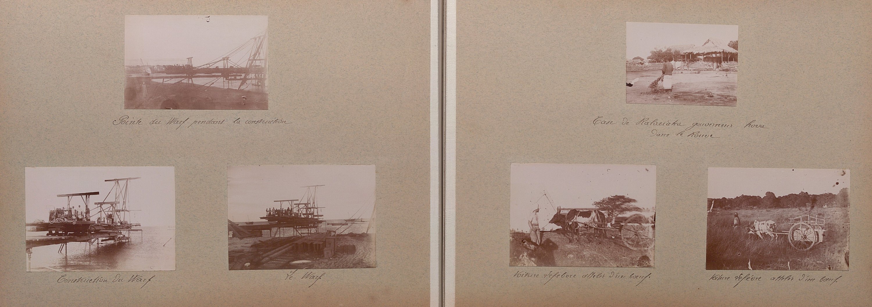 Débarquement des généraux à Majunga [mai 1895] (marché, boucherie, construction du warf, voitures Lefèvre, débarquement du matériel et des troupes, femmes Betsimisaraka, le roi Selimo et son escorte se rendant chez le général Metzinger, incendie de Mayunga ;