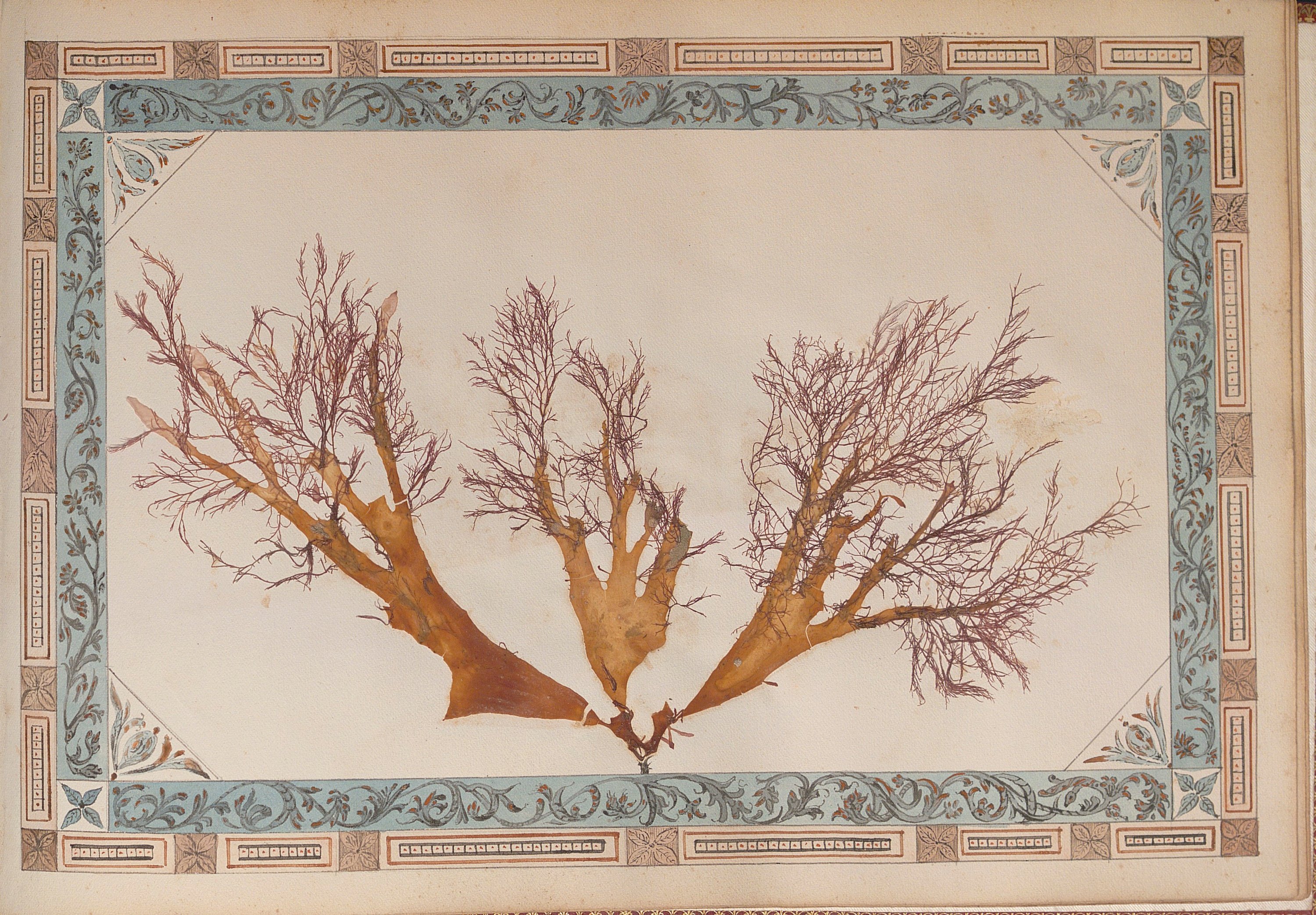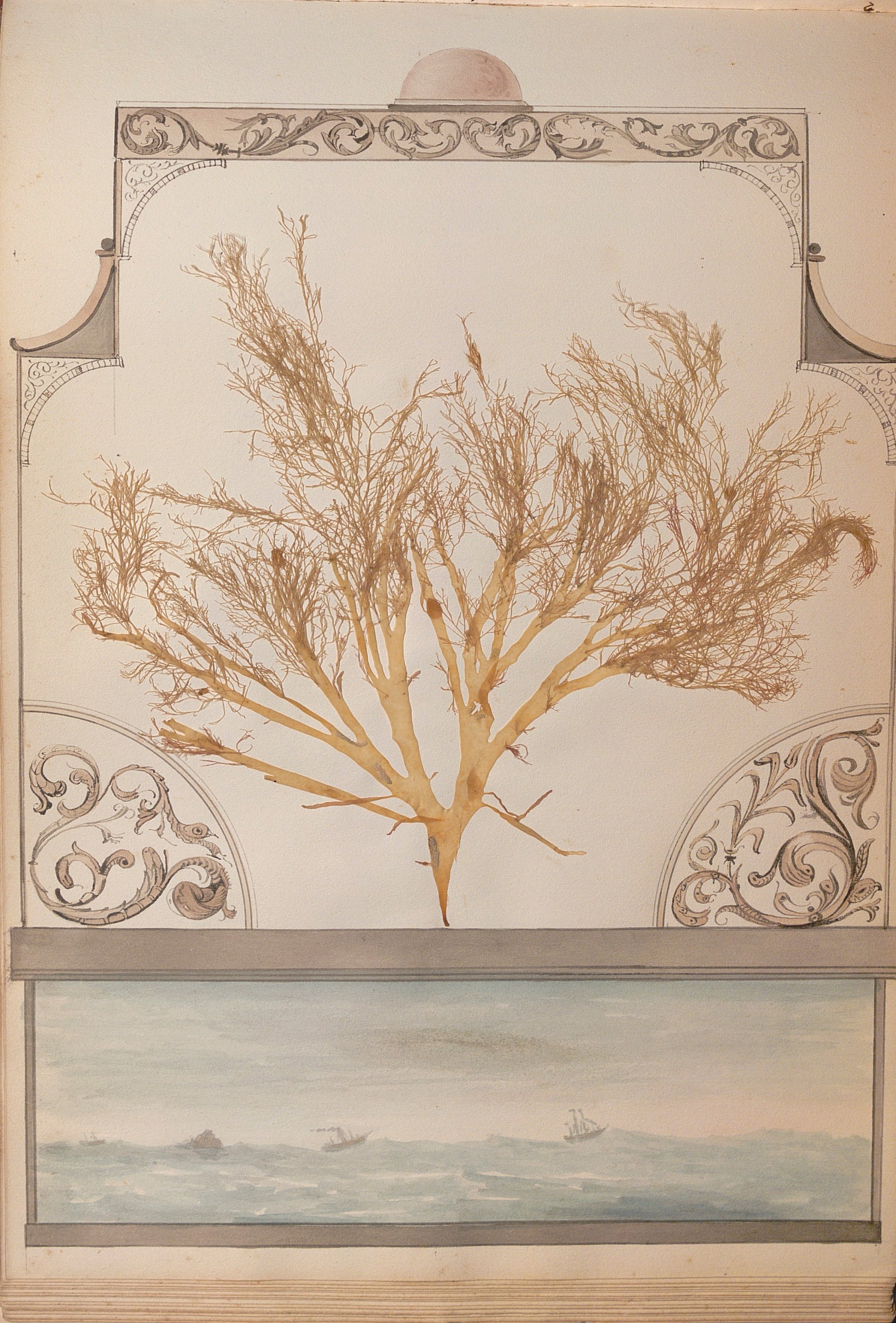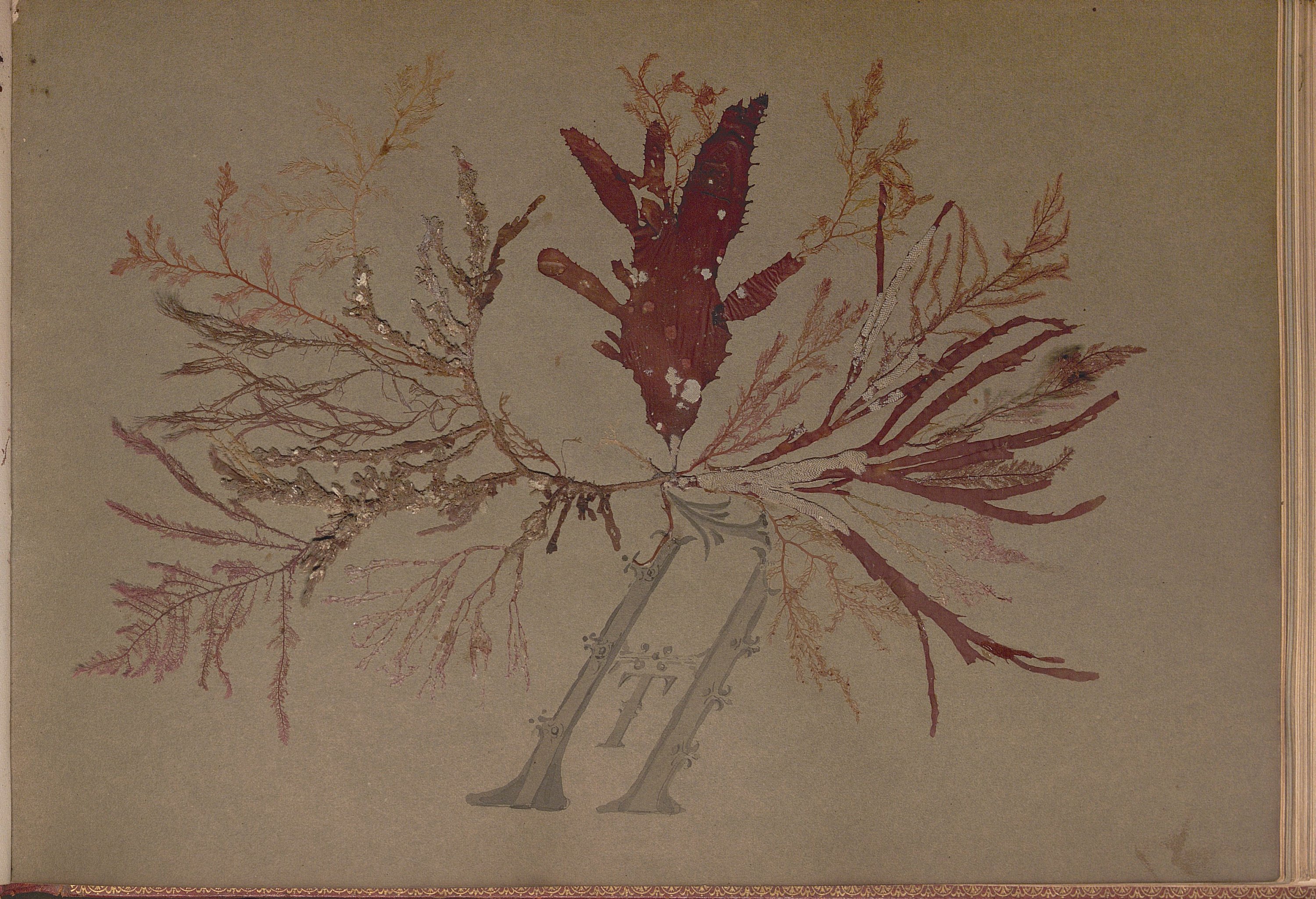 Album à l’italienne relié au monogramme en lettres dorées « H.T. », 21 x 31 cm, renfermant 66 feuillets sur lesquels sont contrecollées délicatement des algues et plantes marines séchées mises en scènes dans des décors dessinés et aquarellés de personnages, scènes animées et entrelacs.
