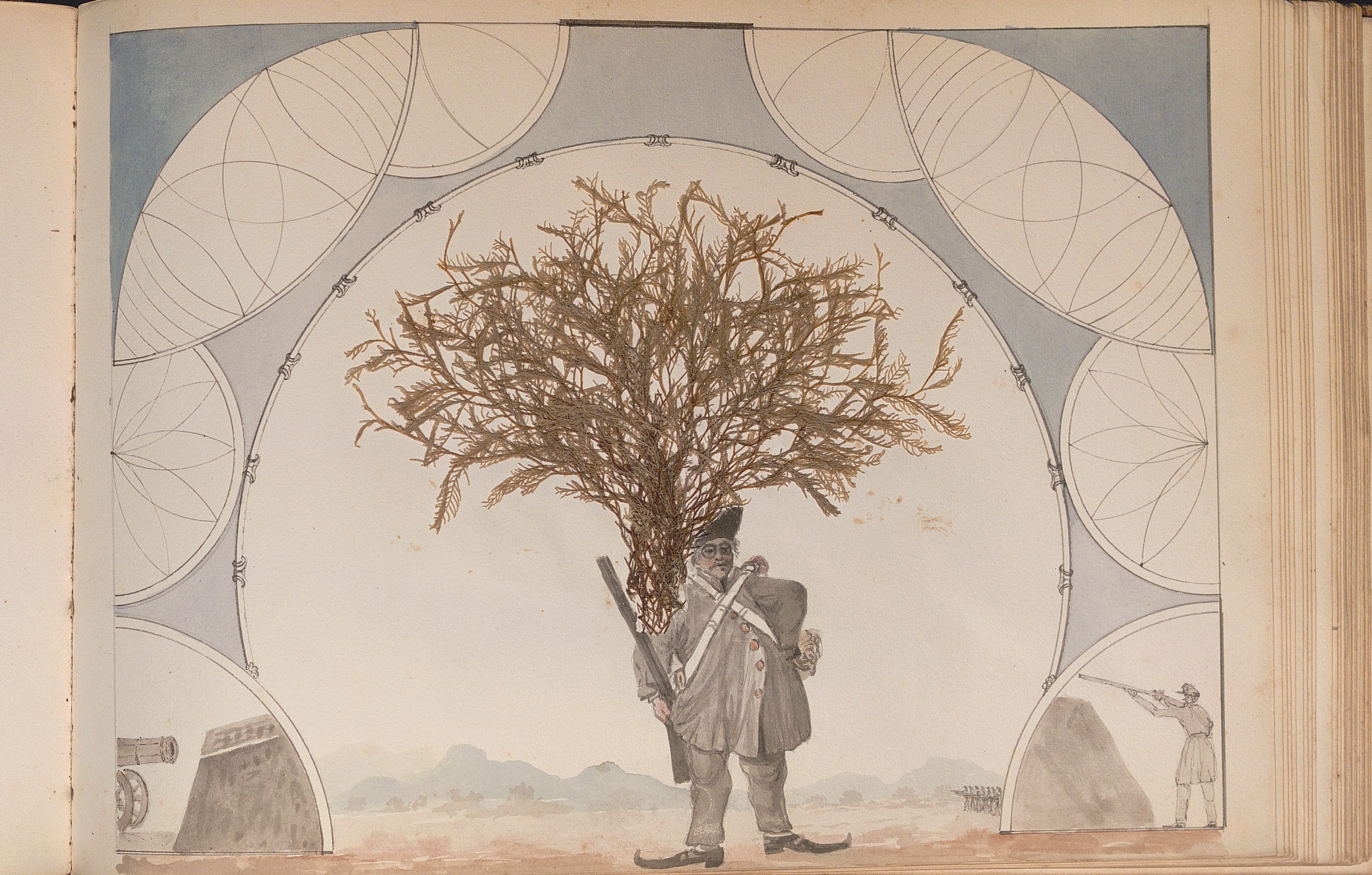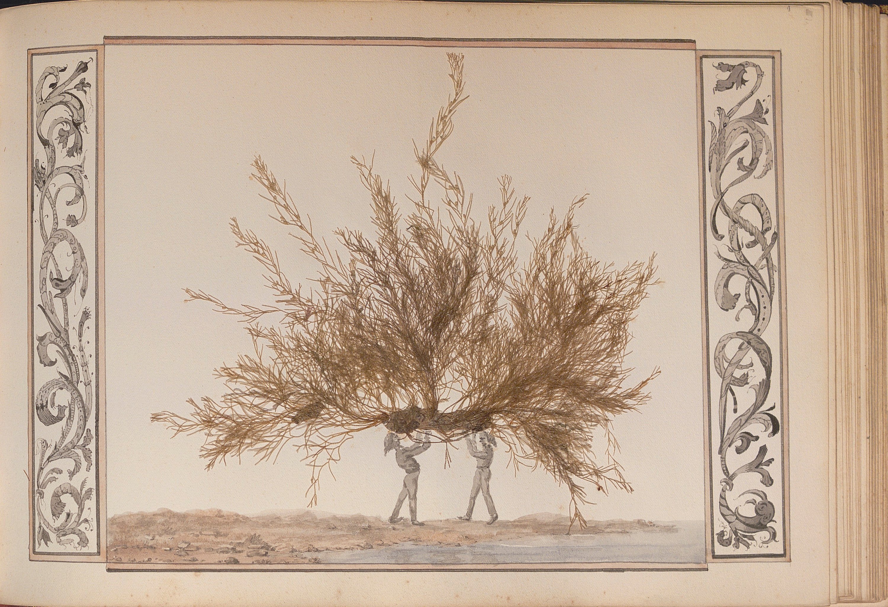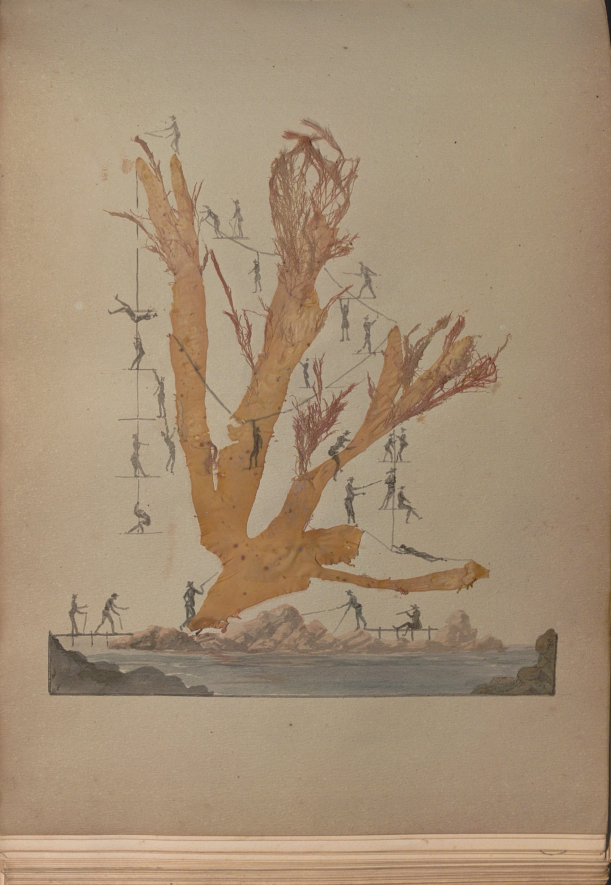 Album à l’italienne relié au monogramme en lettres dorées « H.T. », 21 x 31 cm, renfermant 66 feuillets sur lesquels sont contrecollées délicatement des algues et plantes marines séchées mises en scènes dans des décors dessinés et aquarellés de personnages, scènes animées et entrelacs.