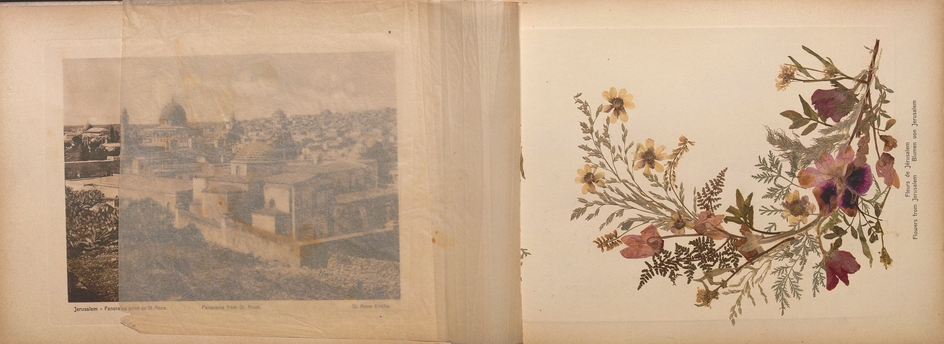 Vues de Jérusalem (Jaffa/fleur de Jaffa, tombeau de David/fleurs du Mont Sion, Saint Sépulcre/fleurs de terre sainte, Mur des Lamentations/fleurs de Jérusalem, Jardin de Gethsemanie/fleurs de Gethsemanie, Mont des Oliviers/fleurs du mont des oliviers), Béthanie, Bethléem, Jéricho, etc. Légendes en français, allemand, anglais.