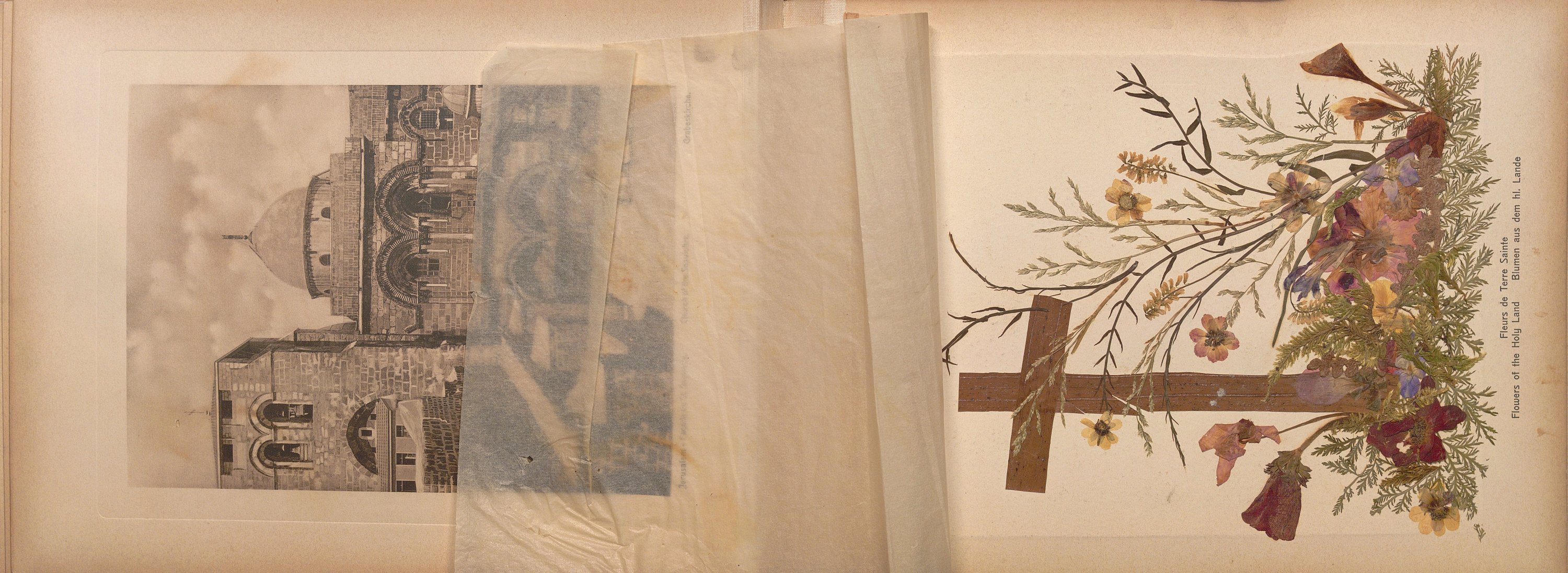 Album à l’italienne relié, 22 x 29,5 cm, plats en bois d’olivier (accdts à la couv.), bords biseautés, ornés d’une croix de Jérusalem sculptée sur le premier plat, 18 photochromes sur carton fort et 18 fleurs séchées en regard, sous serpentes, montés sur onglets toilés.