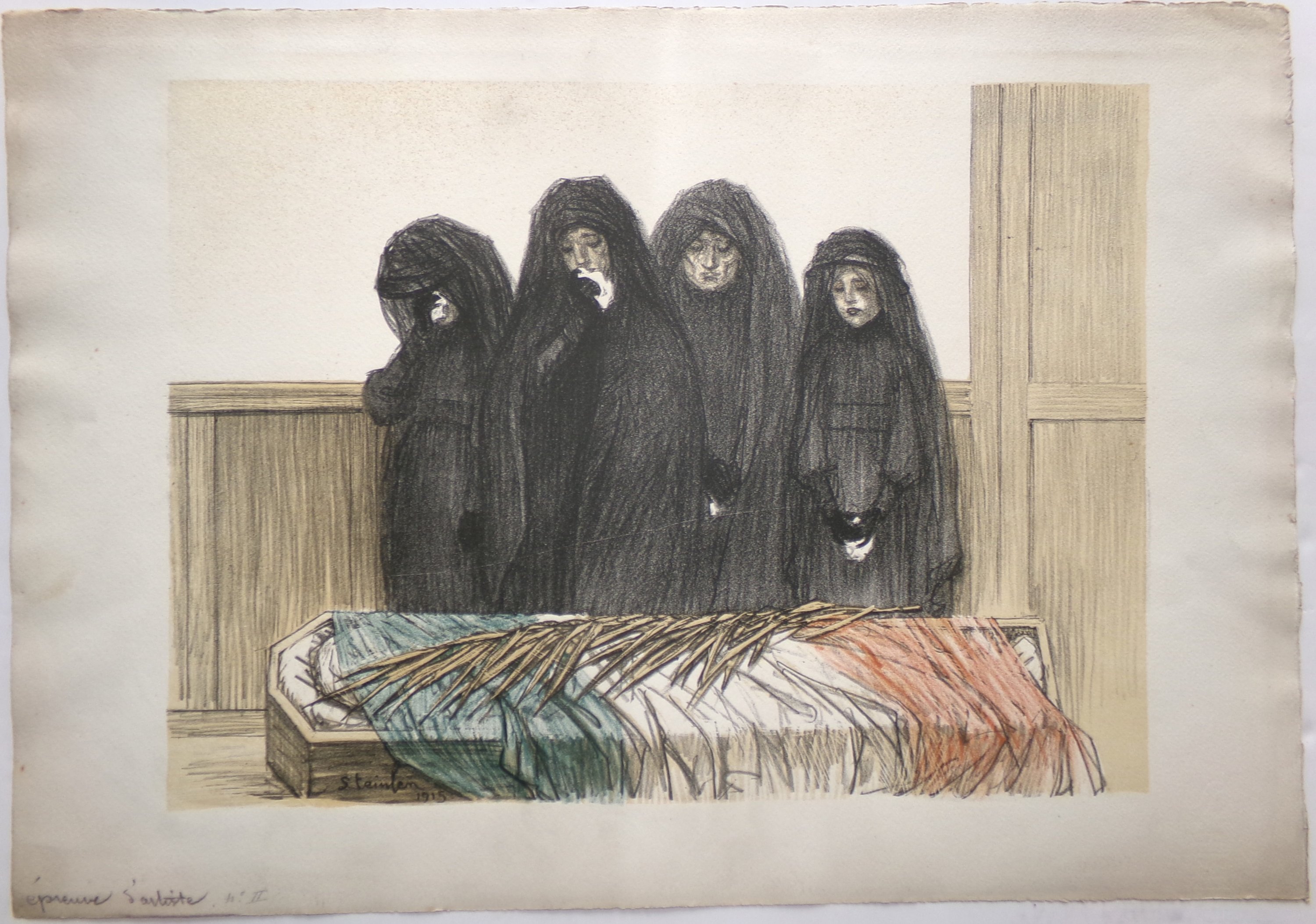 23 épreuves tirées sur fond ocre, dont 19 pl. portent la mention « épreuve d’artiste n°II » et 1 pl. signée au crayon par l’artiste: [Verdunois à la Gare de l'Est] ; [La Gloire] (en couleurs] ; [L’exode belge] ; [Les réfugiés de la Meuse] ; [L’allocation militaire] ; [Les convalescents] ; [Courageuse!] ; [Pour les fillettes des soldats tombés au champ d’honneur] ; [Un vieux de la vieille] ; [L’aide aux mutilés de guerre] ; [Sous la botte] ; [Le secours national] ; [Errant !] ; [Veuves d’un Louis] ; [Pour les familles dispersées] ; [Chiens errants] ; [Serbie. Sœur Anne de France ou d’Italie ne vois tu rien venir] ; [Calvaire serbe] ; [Deux poilus] ; [On ne s’en fait pas] ; [Bat d’Af] ; etc.