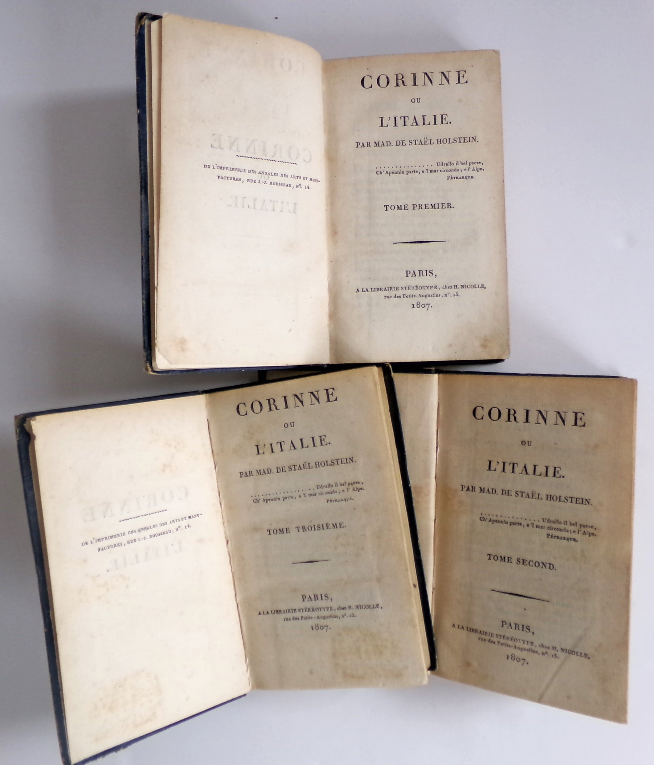 Corinne ou l'Italie. Lib. stéréotype chez H. Nicolle, Paris 1807. 3 vol. in-12 rel. d’époque. (4)-384-(4)-424-(4)-443 pp. Deuxième édition parue la même année que l'originale. Rare.