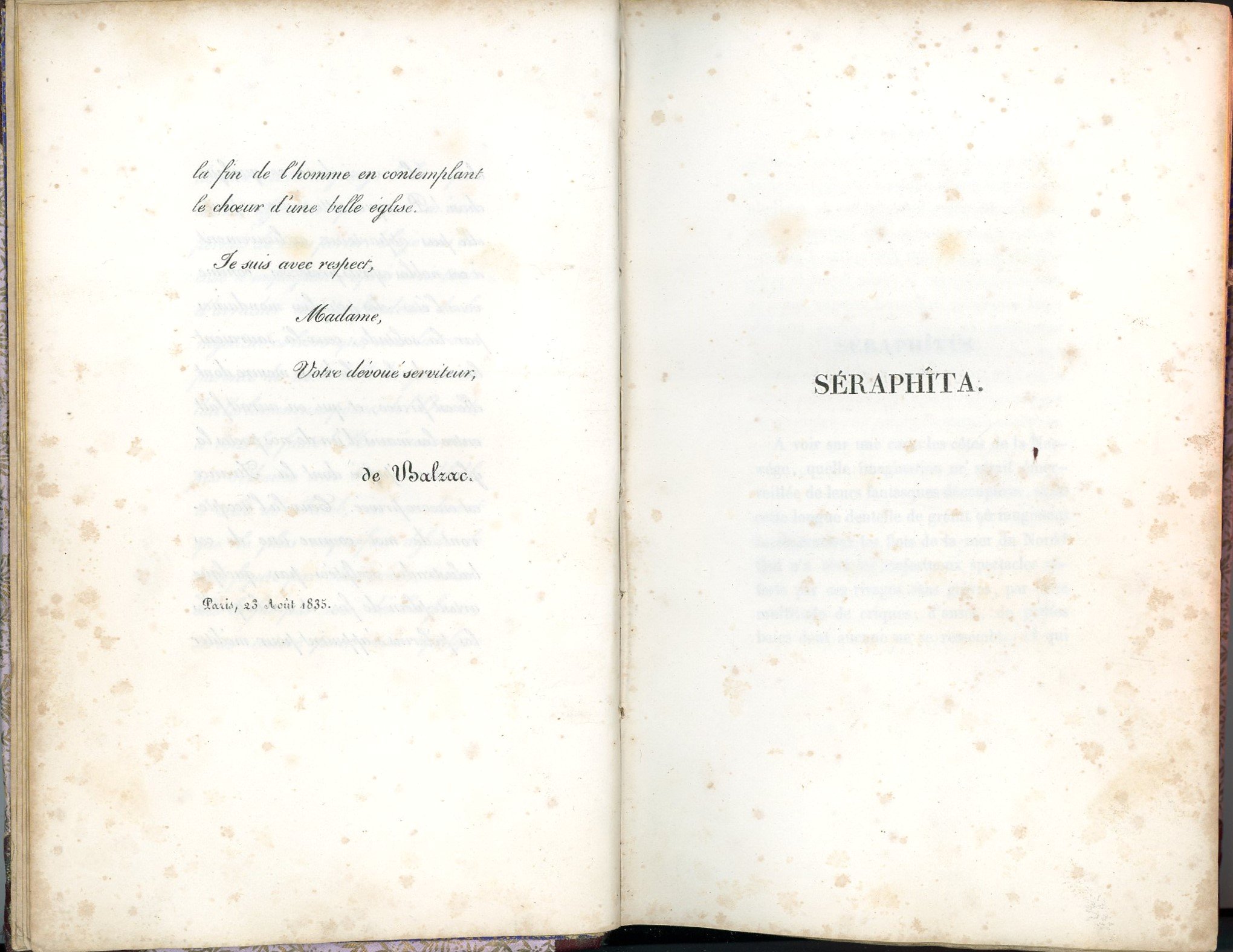 Le Livre Mystique. Tome 1: Les Proscrits, Histoire Intellectuelle de Louis Lambert (Extrait des Etudes Philosophiques), Tome 2: Séraphira (Extrait des Etudes Philosophiques). Paris, Werdet 1er décembre 1835. In-8 rel. couverte de tissus, 352 et 357 pp. (rousseurs, trous de ver).