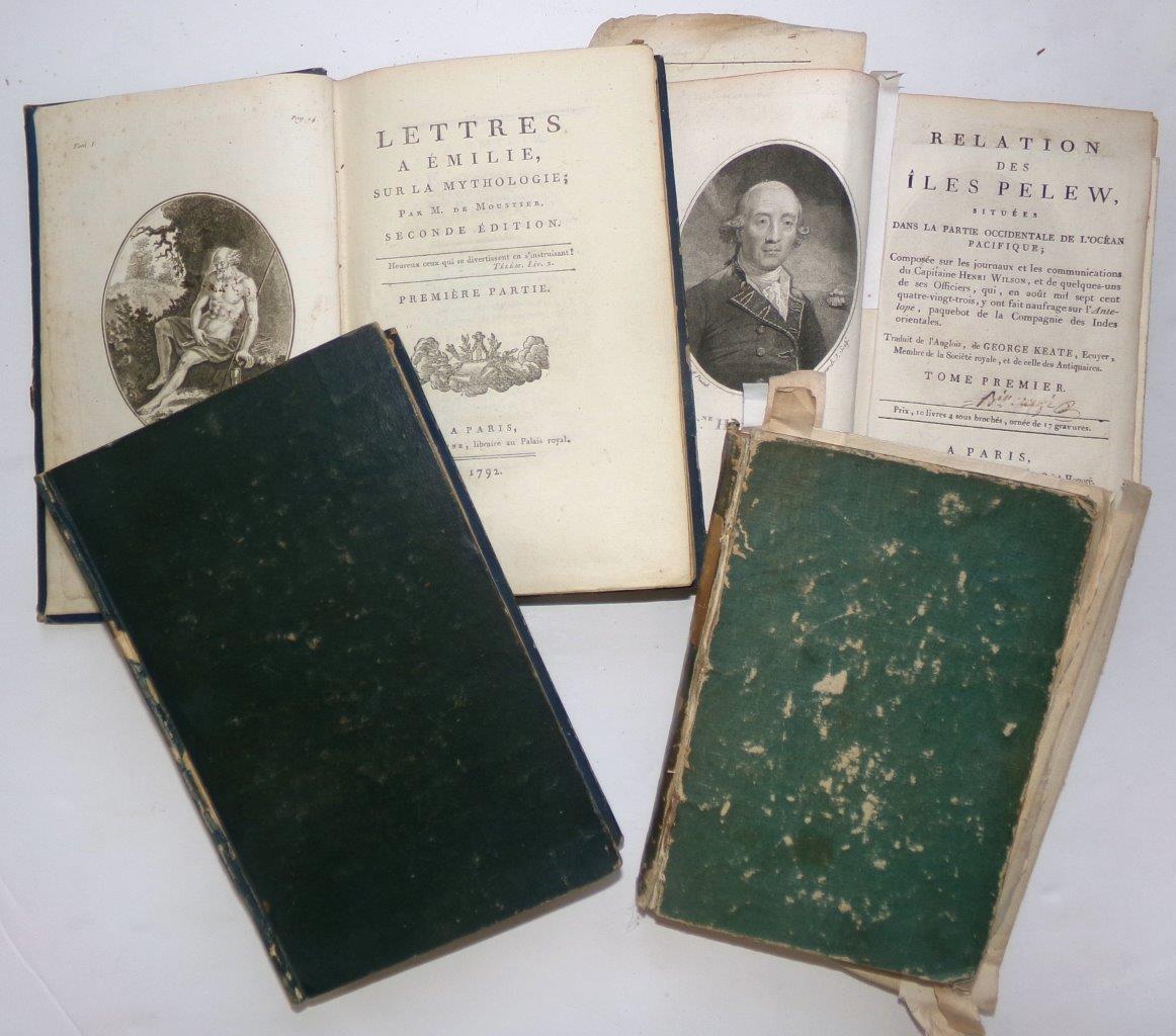 Georges Keate, Relation des îles Pelew, située dans la partie occidentale de l’océan Pacifique. 2 tomes. Paris, Lejay et Maradan, 1778. In-8 rel. cartonnée (incomplet, mques planches) ;