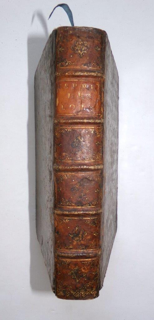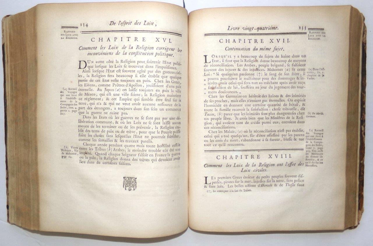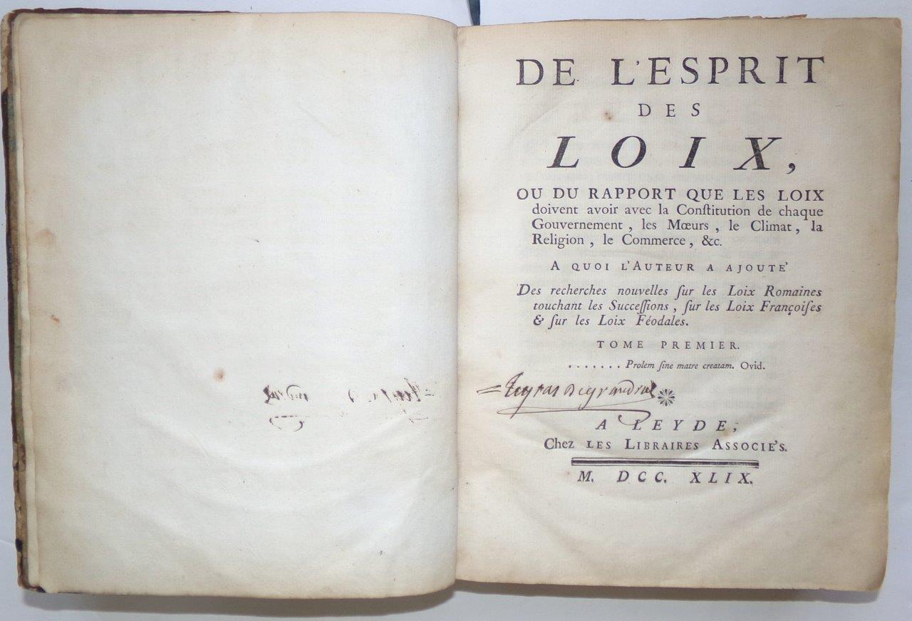 [Montesquieu, Charles-Louis de Secondat, baron de]. De l'Esprit des Loix, ou du rapport que les loix doivent avoir avec la Constitution de chaque Gouvernement, les Mœurs, le Climat, la Religion, le Commerce, &c. A quoi l'auteur a ajouté des recherches nouvelles sur les Loix Romaines touchant les Successions, sur les Loix Françoise & sur les Loix Féodales. A Leyde, chez les Libraires associés, 1749. 2 tomes reliés en 1 vol. in-4 ; rel. veau en l’état (épidermures, défauts, rest.). Édition publiée un an après l'originale genevoise de 1748. Ex-libris manuscrit « Teyras de Grandval » ;