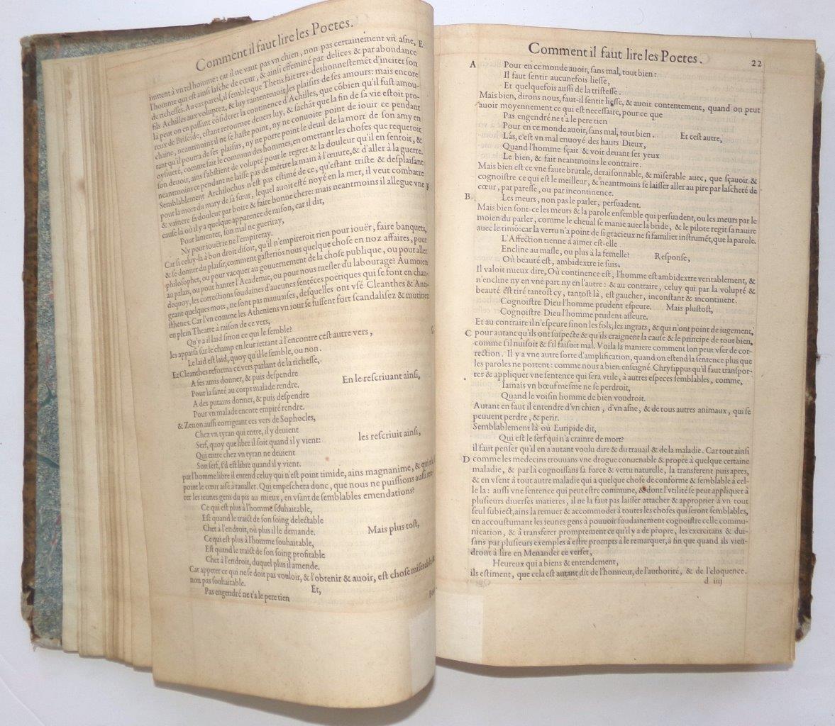 [Jacques Amyot], Les œuvres morales & meslées de Plutarque, translatées du Grec en François par Messire Jacques Amyot, à présent evesque d’Auxerre… Paris, Michel de Vascosan, 1565. (4)-357 ff. in-fol., reliure tardive en très mauvais état (plat dérel.), bon état intérieur (qqs rousseurs, rest., pli page de titre) ;