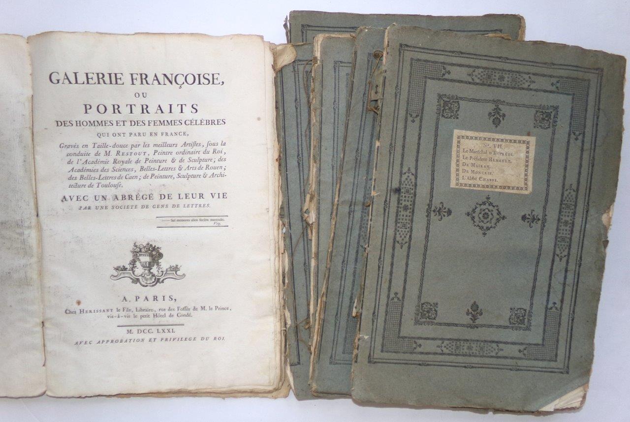 Jean Bernard Restout, Galerie françoise ou portraits des hommes célèbres qui ont paru en France, gravés en taille-douce par les meilleurs artistes, sous la conduite de M. Restout, avec un abrégé de leur vie. Paris, chez Herissant, 1771. 6 numéros (n°I, III à VII ; mque n°II) in-folio broch., avec couv. d’attente d’époque. Dont portrait du Dauphin, Philippe d’Orléans régent, Louis XIV, Louis XIII, Henri IV, Louis IX, Philippe Duc D’Orléans, Louis XIV, Louis XIII, Henri IV, Le Maréchal De Noailles, L’Abbé D’Olivet, Carle Van Loo, Astruc, Rameau, Le Comte D’Argenson, Gilbert De Voysins, Madame Du Châtelet, Le Cat, L’Abbé Prevost, Le Marechal De Belle-Isle, etc ;