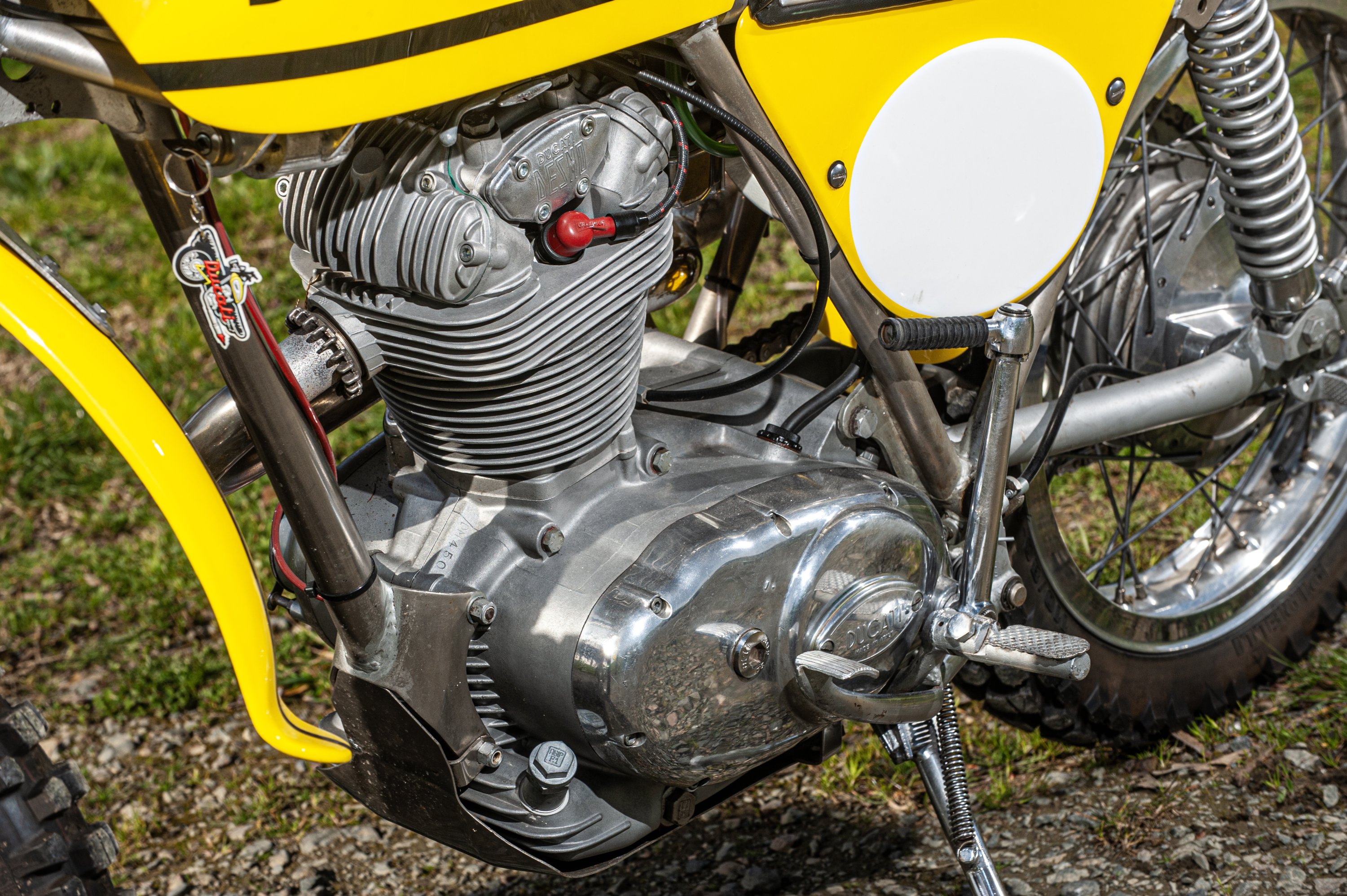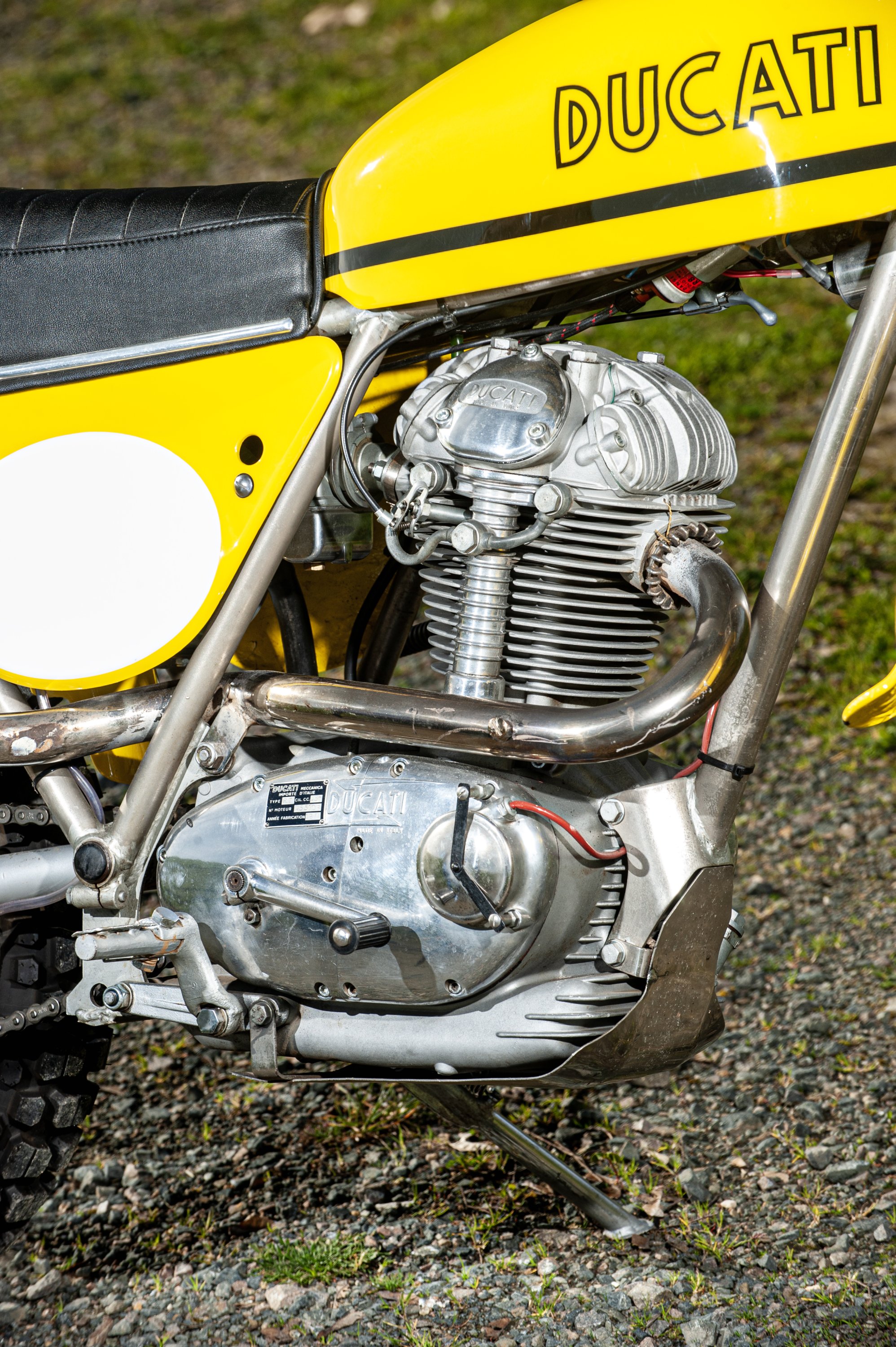 La Ducati 450R/T est produite à moins de 500 exemplaires. La nôtre est présentée dans une rare version avec cadre nickelé, vraisemblablement destinée au marché américain. Notre moto est un exemplaire de deuxième main en parfait état, restauré en 2022 par Gilbert Bouvet. Les pièces d'origine ont été conservées par le propriétaire et pourront être remises à l'acquéreur, à l'instar des compteurs (non remontés).