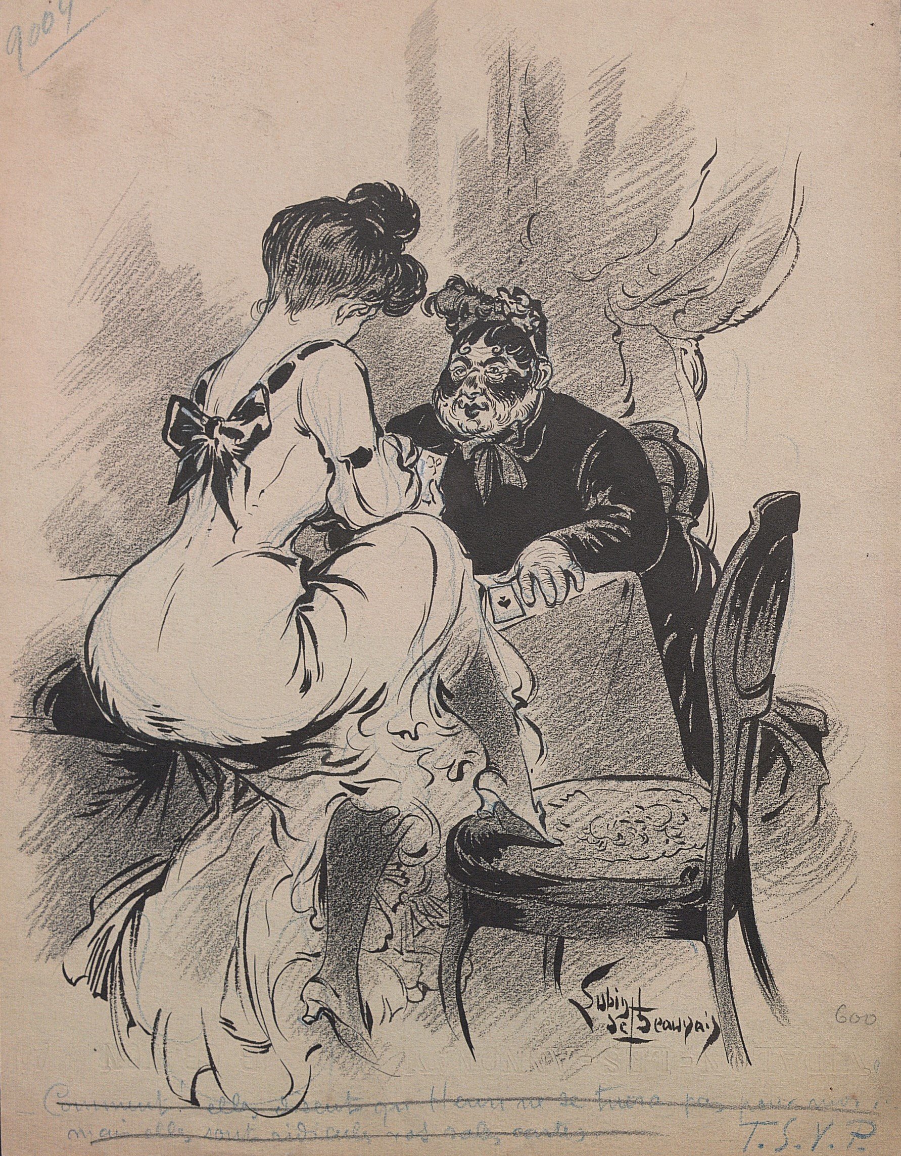 Sans titre, encre et crayon bleu, signé « Gaston » en bas à droite, légendé « Eh! La petite mère c’est y pour vot’ salé cette tête de cochon là? », 45,5 x 31 cm ;