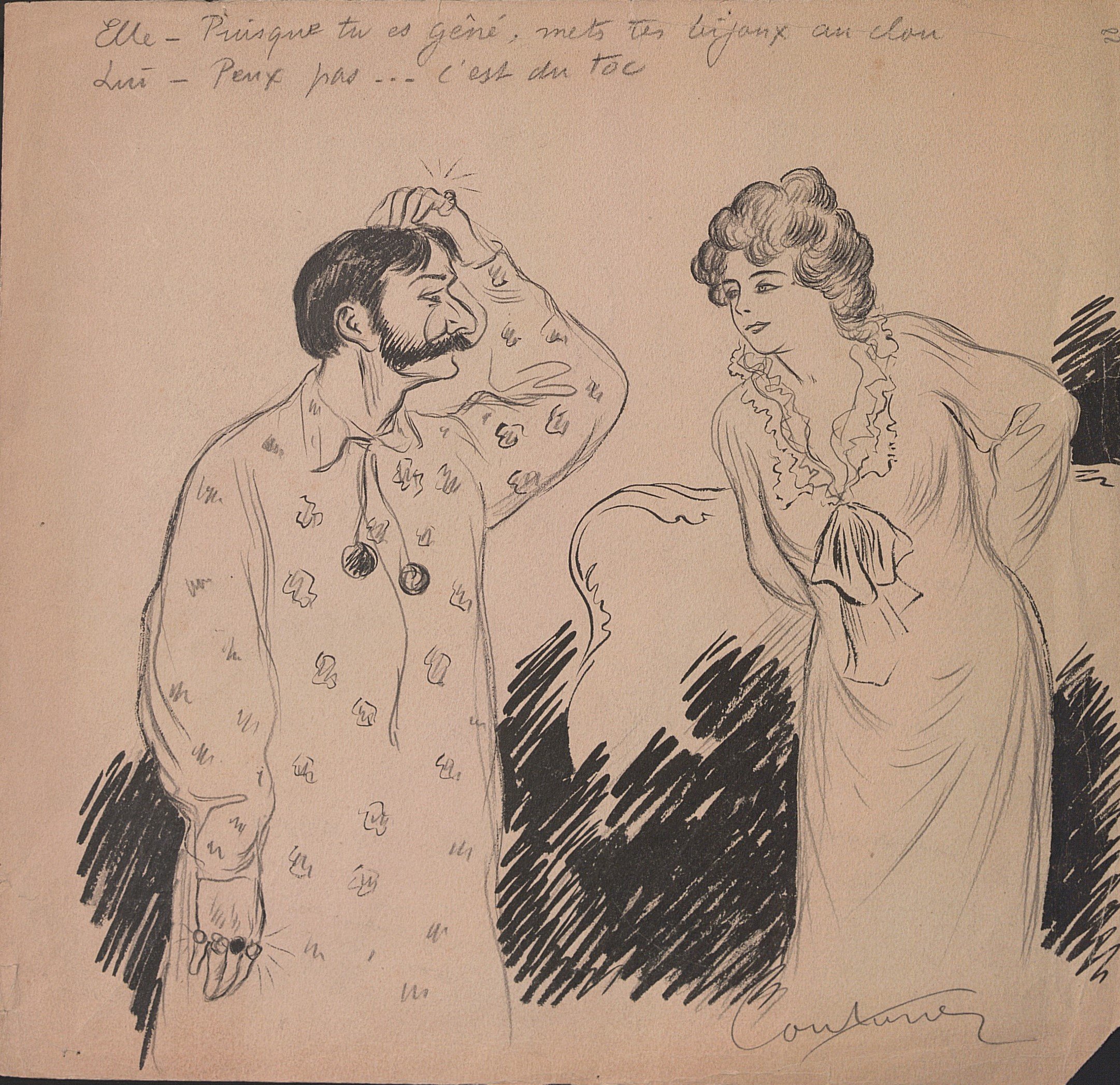 Edouard Couturier, Sans titre, encre et mine de plomb, signé en bas à droite, légendé « Puisque tu es gêné, mets tes bijoux aux clous. Peux pas c’est du toc » », 29 x 30 cm (petites déchirures marginales, plis) ;
