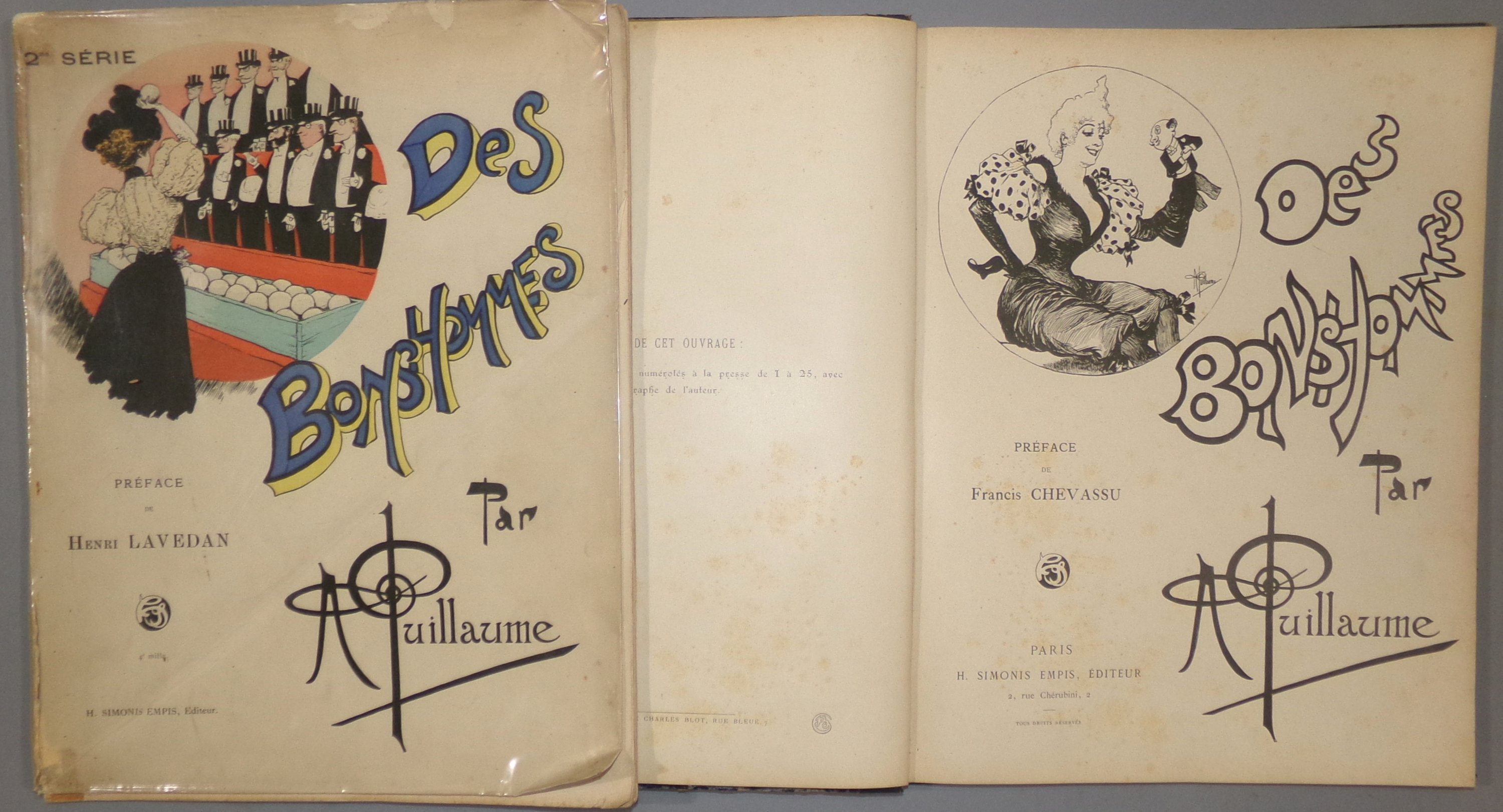 Réunion de 9 albums grand in-4 broch. ou rel. illustrés par des dessins satiriques en couleurs ou en noir d’Albert Guillaume, édités par H. Simonis Empis, Paris, vers 1895-1900: Mes 28 jours (2 ex.) ; Mon sursis ; Mémoires d’une glace (2 ex.) ; Pour vos beaux yeux ; R’vue d’fin d’année ; Des bonhommes 1ère (2 ex.) et 2ème série.