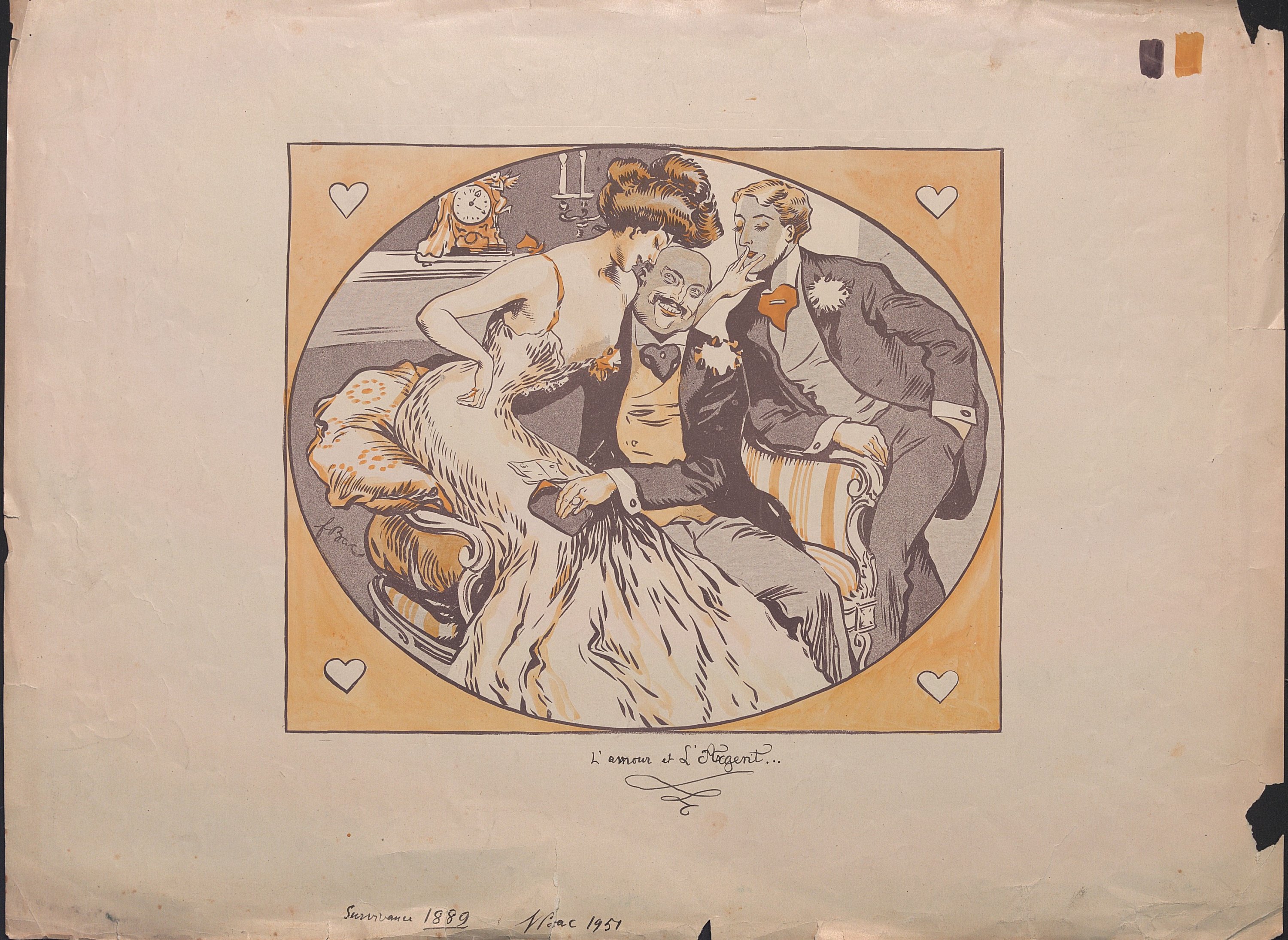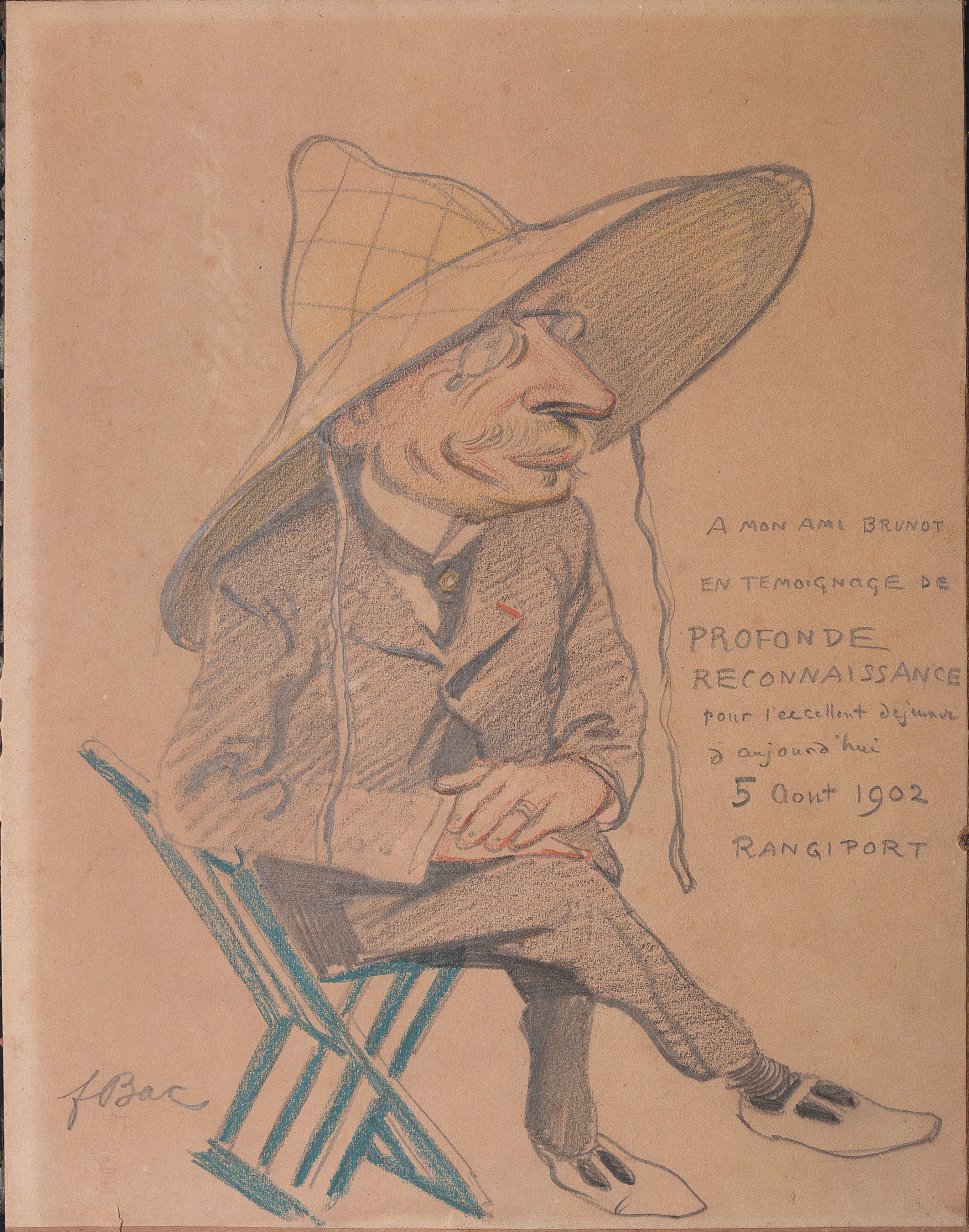 Portrait charge de Charles Brunot, chef de la presse au ministère de l’Intérieur, sur l’île de Rangiport (Les Yvelines), crayon, fusain et rehauts de couleurs, sur papier contrecollé sur carton fort, signé en bas à gauche, envoi manuscrit daté: « A mon ami Brunot, en témoignage de profonde reconnaissance pour l’excellent déjeuner d’aujourd’hui. 5 août 1902, Rangiport », 44,5 x 34,5 cm (petites déchirures en marge).