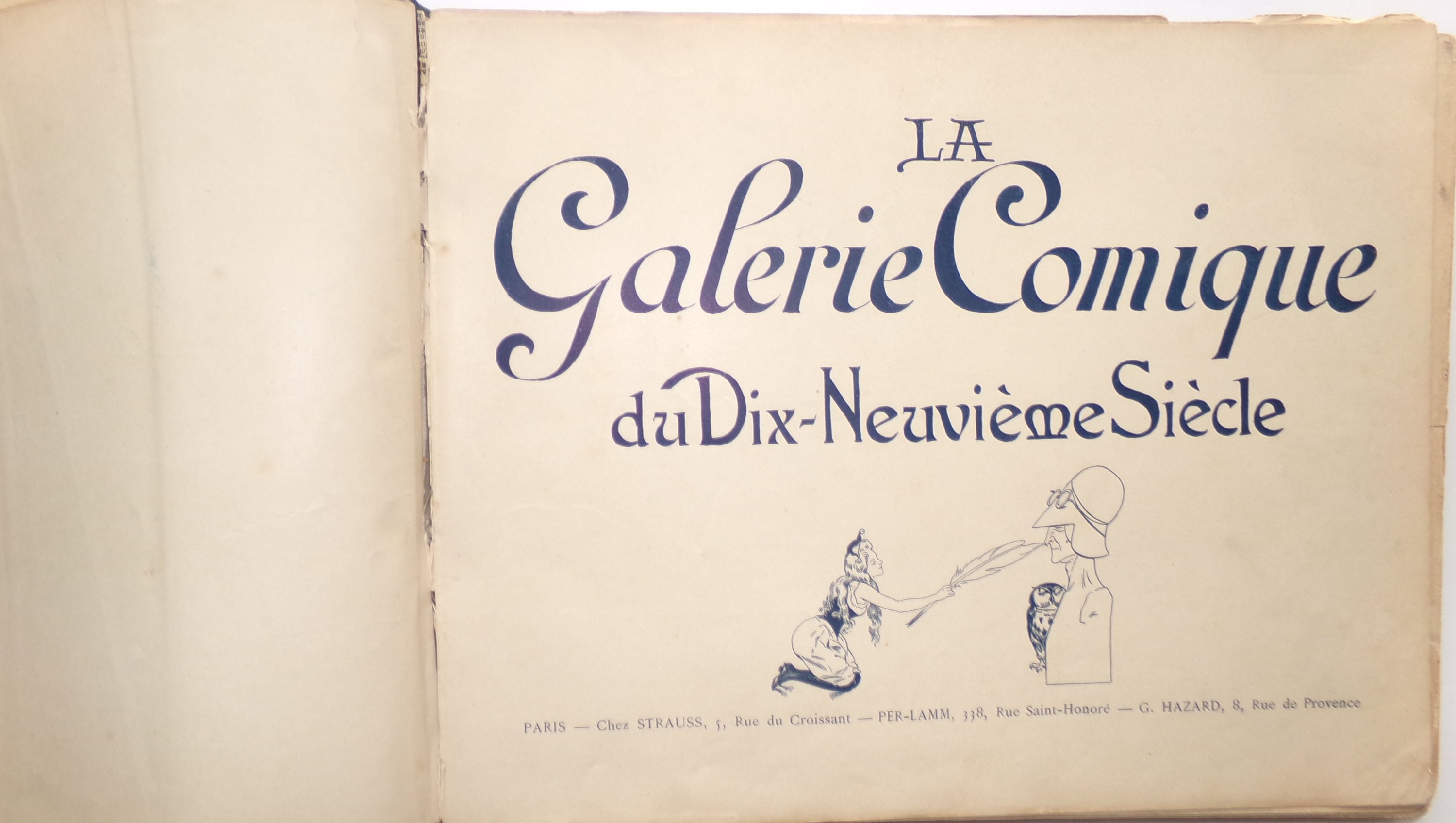 La galerie comique du dix-neuvième siècle. Paris, Strauss-Per-Lamm-Hazard, s.d. In-4 à l’italienne rel. ½ basane bleu (usures à la couv.) Recueil de caricatures d'après Caran d'Ache, Honoré Daumier, L. Boilly, Albert Robida, Ferdinand Bac, Crafty, Draner, Forain, Gerbault, A. Guillaume, Henriot, Job, Le Mouel, P. Leonnec, Mars, L. Morin, A. Robida, Gavarni, André Gill, Steinlen, Stop, Willette, etc.