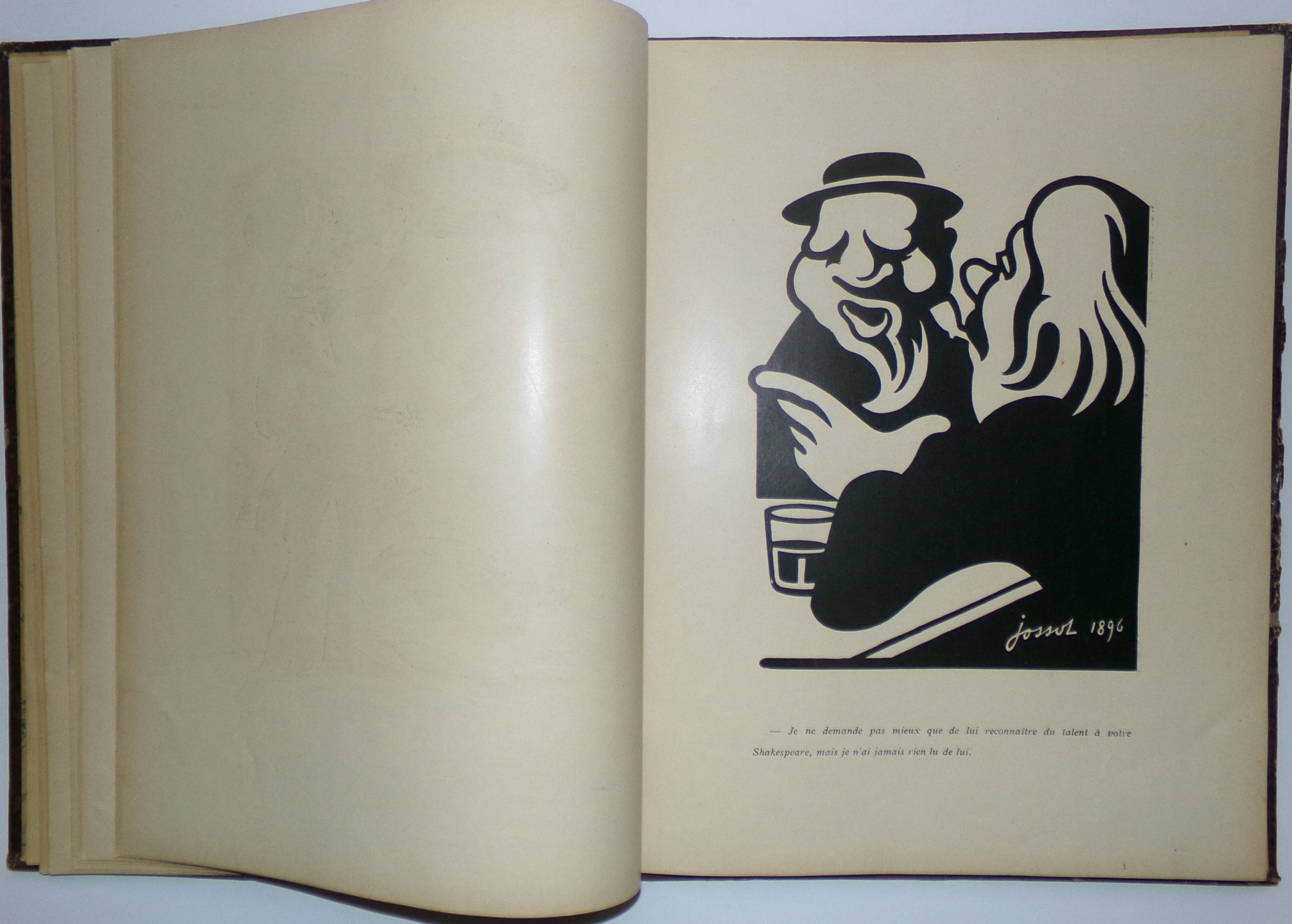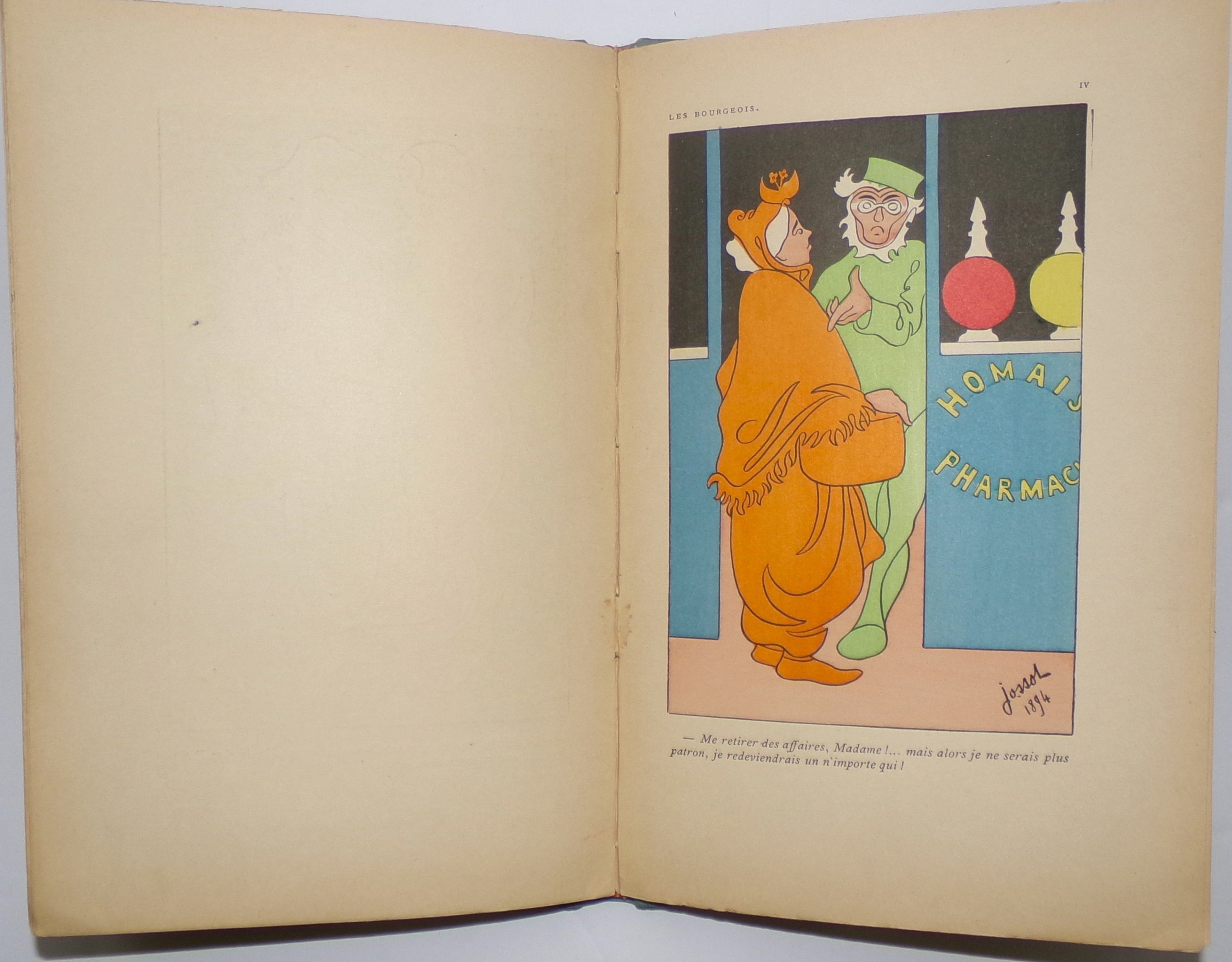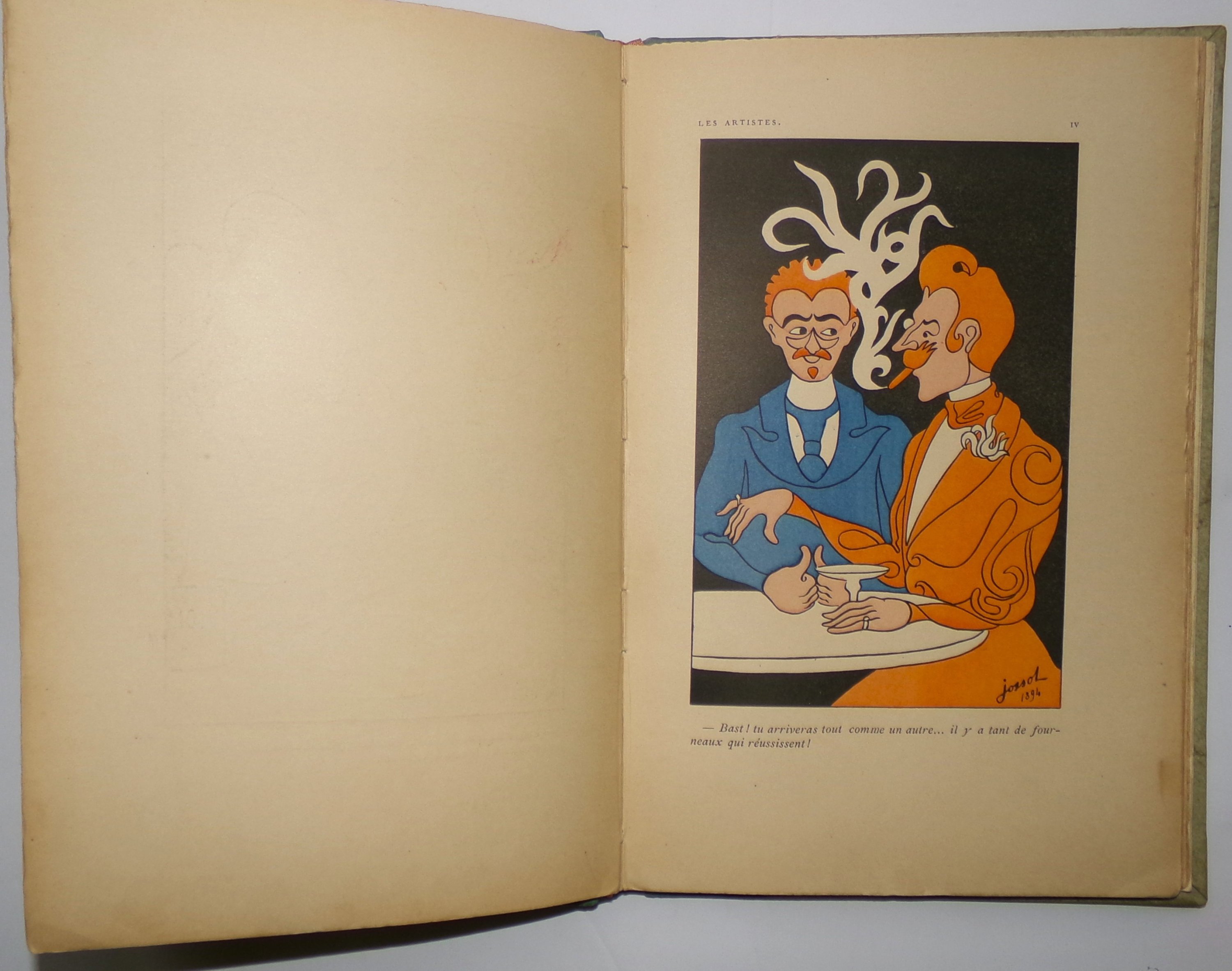 Artistes et bourgeois. Préface de Willy. Paris, G. Boudet et Tallandier, s.d. In-8 rel. ½ toile, VIII pages, suivies de deux séries de 12 illustrations de Jossot coloriées au pochoir et datées de 1894 et légendées: 12 artistes et 12 bourgeois. Bel exemplaire.