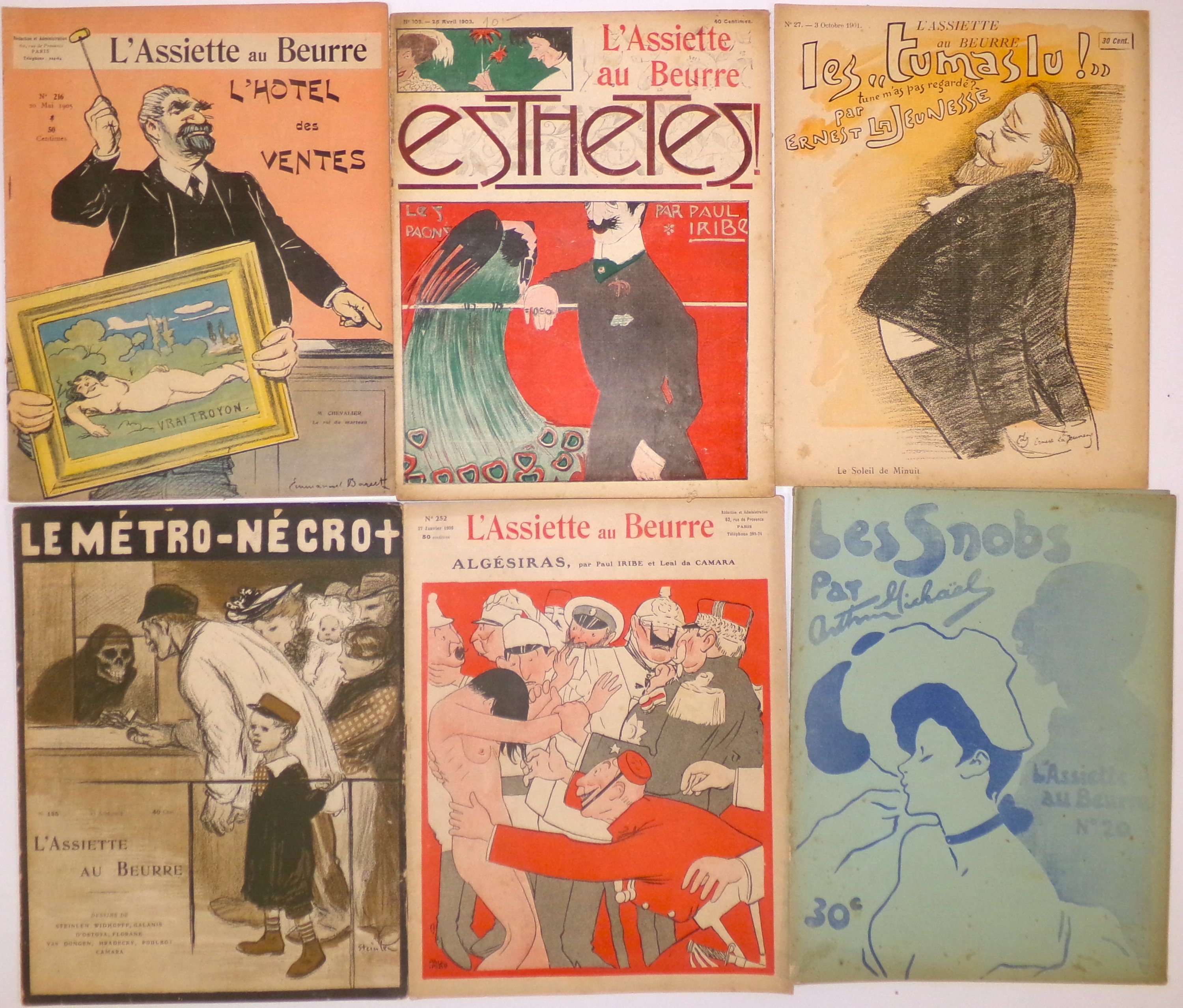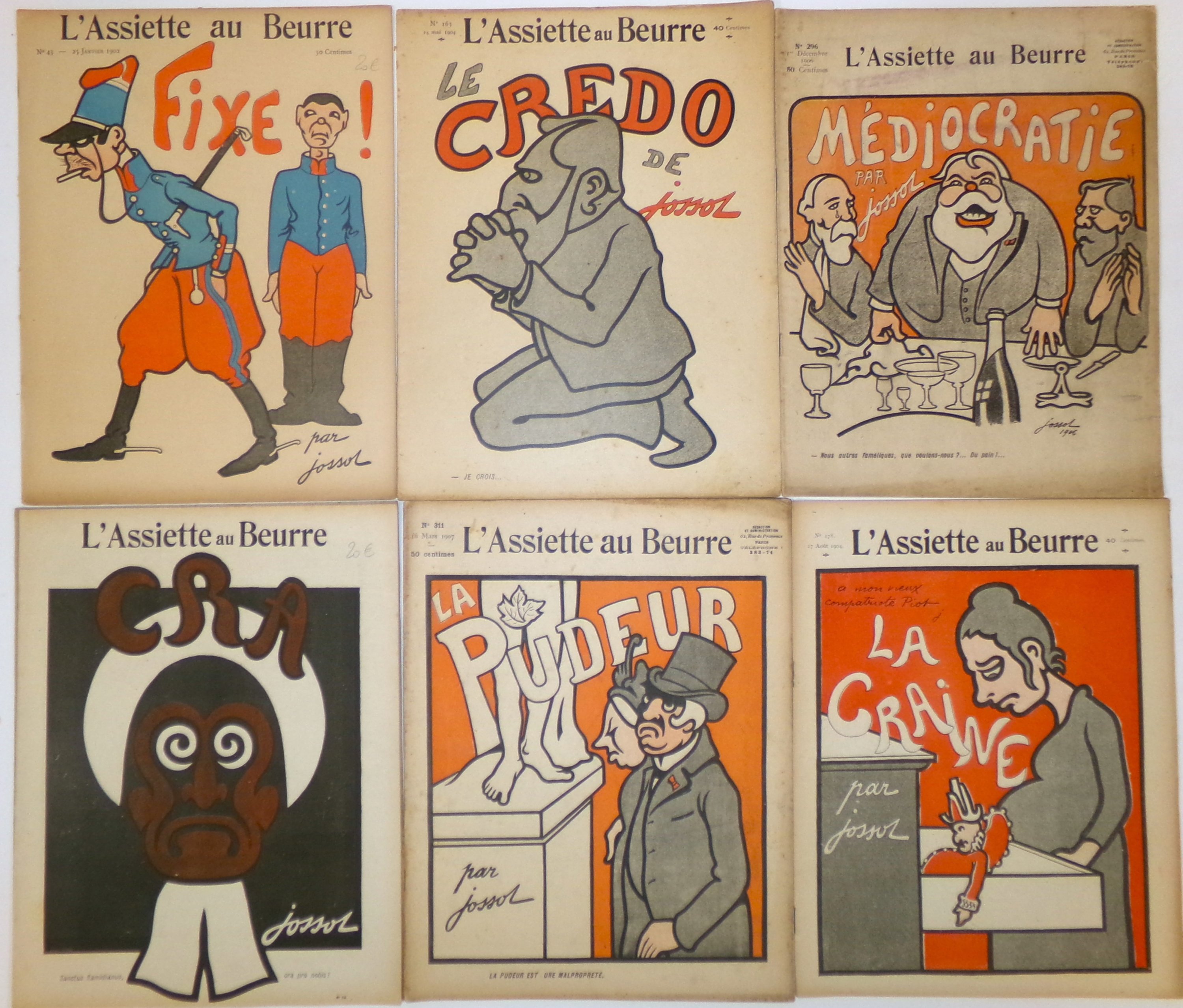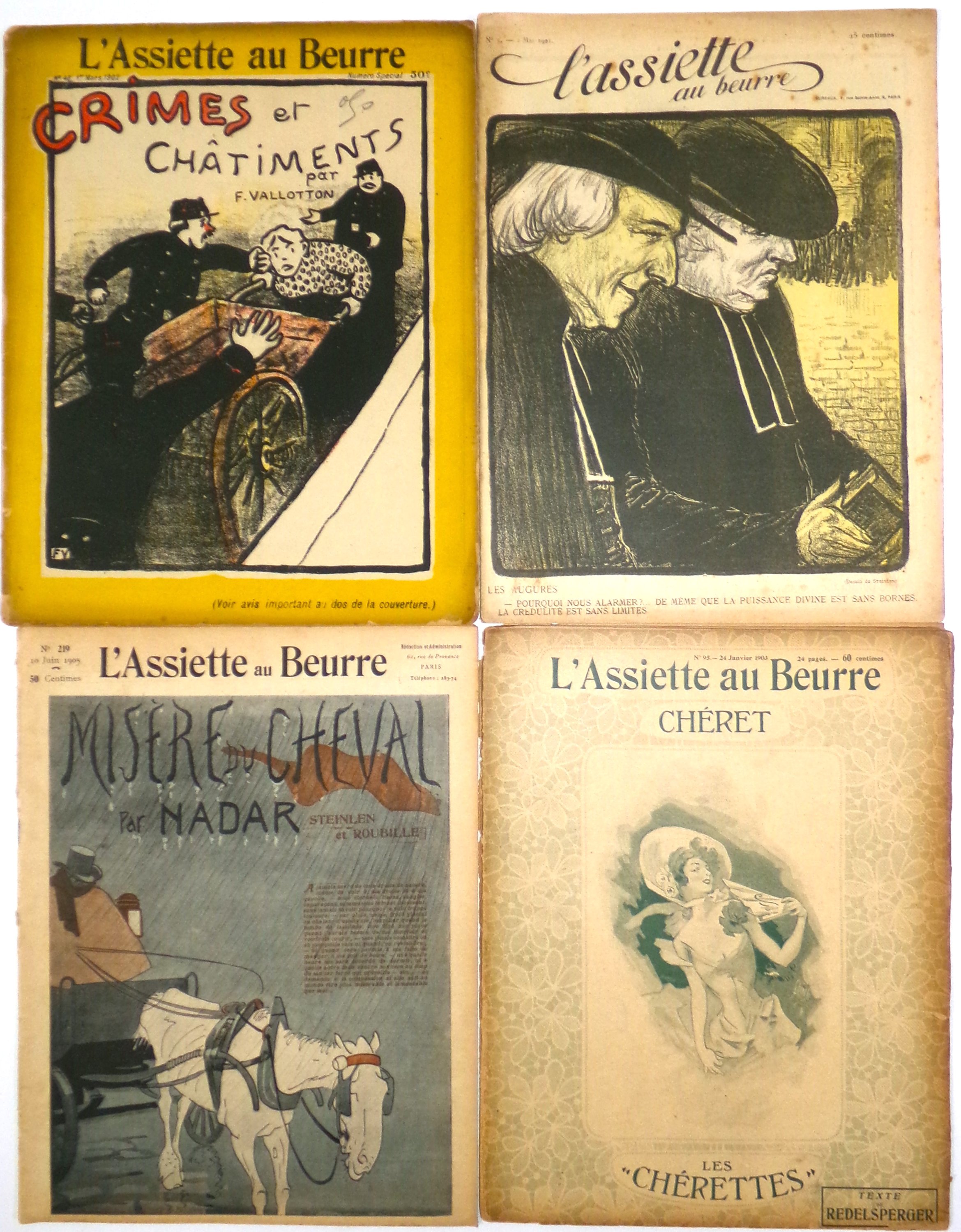 Dont 13 ex. ill. par Poulbot, 28 ex. ill. par Hermann-Paul, 33 ex. ill. par Jossot, « Misère du cheval » par Nadar, Steinlen et Roubille, « Les Chérettes » par Chéret (défauts), « Les Augures » par Steinlen, « Crimes et châtiments » par Vallotton, n° spéciaux « Vive l’Angleterre » « La Foire aux Croutes » « Une page de l’histoire d’Espagne » « Les empoisonneurs patentés, les falsificateurs de lait », etc.