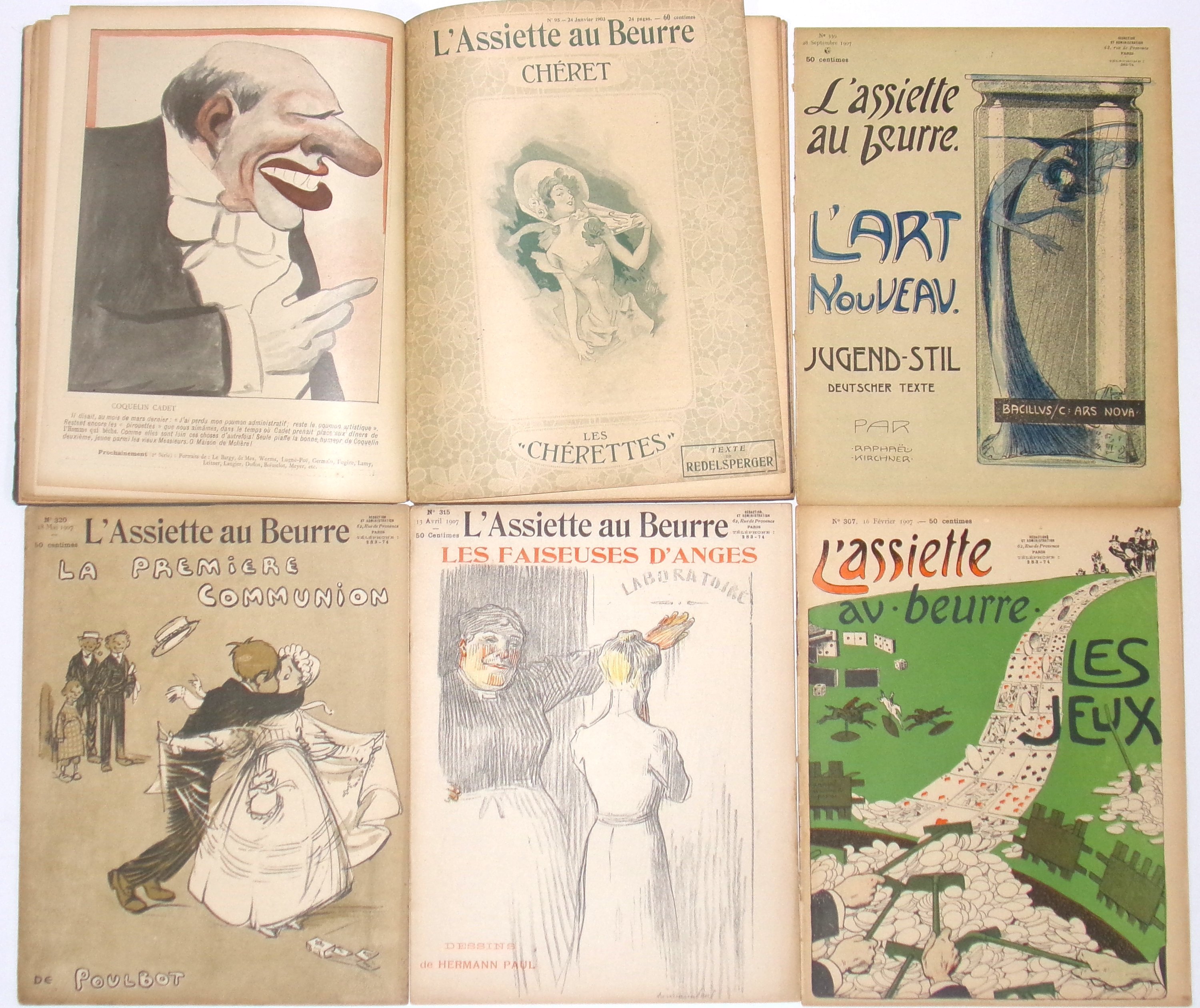 Réunion d’env. 595 numéros de la plus célèbre des revues satiriques et anticonformistes de la Belle-Epoque: L’Assiette au Beurre, publiée à Paris par les Publications modernes, 1901-1912.