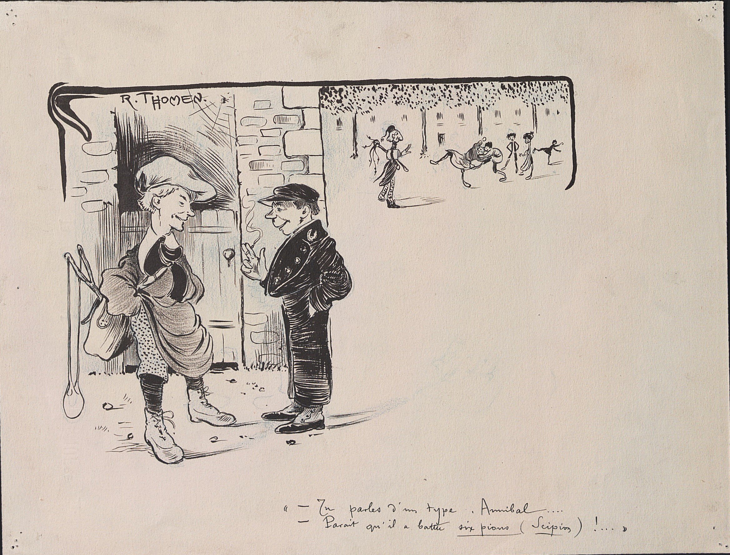 Encre de chine crayon bleu, signé en haut à gauche, légendé à la plume « Tu parles d’un type Annibal - Parait qu’il a battu six pions (Scipion)! », 24,5 x 32,5 cm ;